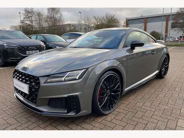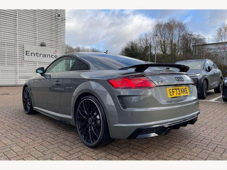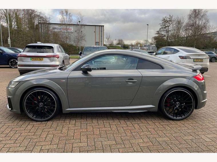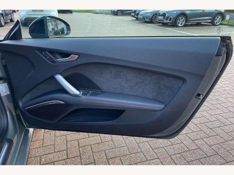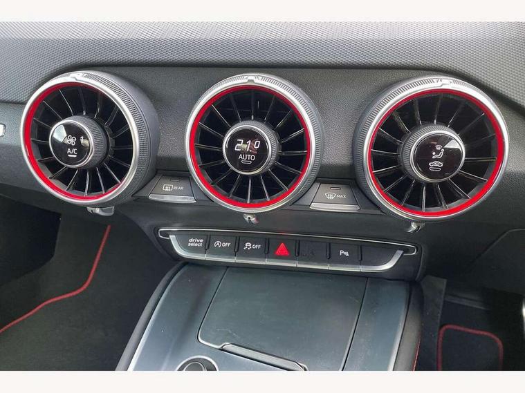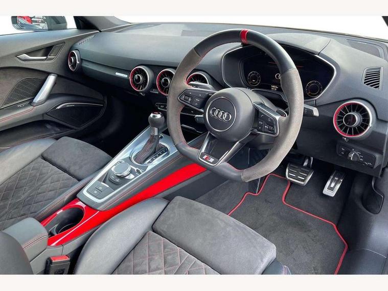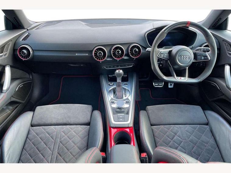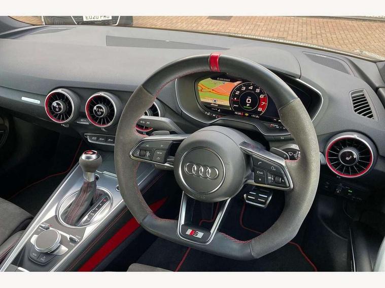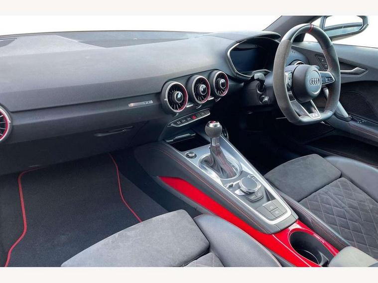 Audi drive select with 4 Pre configured modes, Audi smartphone interface, Audi virtual cockpit - 12.3" high-resolution LCD display with fully customisable instrument cluster, Cruise control + speed limiter, Emergency call service, Mobile phone preparation with bluetooth interface, Progressive power assisted steering, Rear parking sensors, Service interval indicator, Start/Stop system with energy recuperation, TP memo, Sports suspension, 8 Speakers, AM/FM radio, Bluetooth audio streaming, DAB Digital radio, Audi Beam uses LEDs to project the Audi Sport logo, Audi rings decals, Auto dimming rear view mirror, Auto headlight range control, Black chrome tailpipe, Black door mirrors, Dark privacy glass from B-pillar backwards, Electric folding door mirrors, Electric front windows, Electrically adjustable and heated door mirrors with integrated LED side indicators, Heat insulating glass in windshield, Heat reflecting windows, LED 3rd brake light, LED daytime running lights, LED headlights with LED rear lights + dynamic rear indicators, Light and rain sensors, Rear boot, 12V socket, 2 rear seats, 3 spoke flat bottomed high multi-function leather sport steering wheel with gearshift paddles, 4 way electric lumbar support for driver and front passenger, Alcantara leather with 12o'clock marker and express red contrast stitching in steering wheel, Alcantara/leather upholstery with S embossing + contrasting express red stitching on upholstery, Steering wheel and gear knob gaiter, Black headlining, Door sill trims, Extended aluminium look with stainless steel pedals, Front centre armrest, Front passenger seat, Front super sports seats, Heated front seats, Integrated head restraints, ISOFIX child seat mounting for front passenger seat with airbag deactivation, Manual adjustment of seat height, fore/aft position, seat angle, seat depth and backrest angle, Rear head restraints, Rear top tether child seat ISOFIX attachment, Red piped floor mats, Split folding rear seat, Black styling package - TT, Leather pack - TT, LED interior light pack - TT/TTS, Non smoking pack - TT/TT RS, Technology pack without Audi phone box - TT, 3 point front seat belts, ABS, ASR traction control, Curtain airbags, Driver and front passenger airbag with front passenger airbag deactivation, EDL traction control, Electromechanical parking brake, ESP, First aid kit, Front side airbags, Head airbags, Hill hold assist, Red brake callipers, Seatbelt warning, Tyre pressure loss indicator, Warning triangle, Anti theft alarm, Anti theft wheel bolts, Immobiliser, Keyless Go, Remote central locking, Matt brushed aluminium inlays, Tool kit, Tyre repair kit,