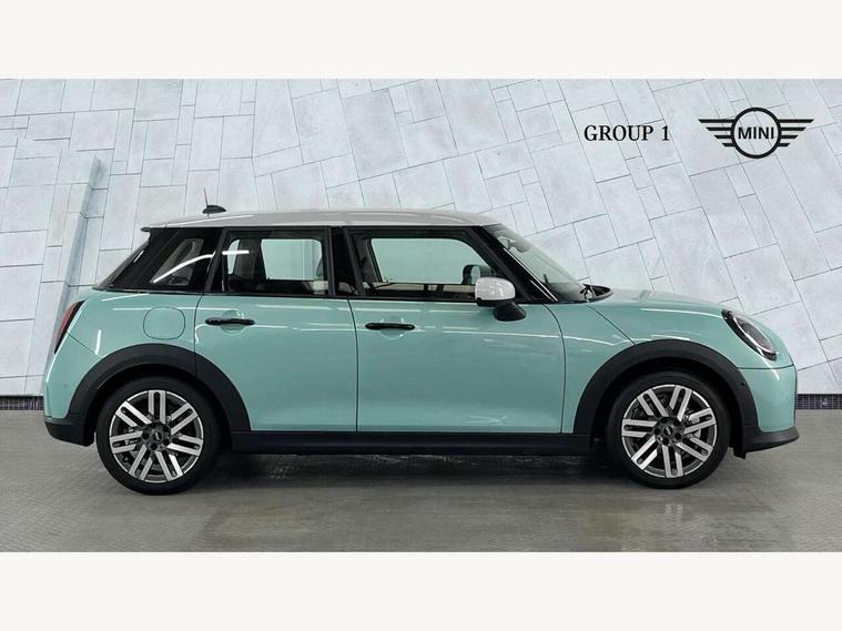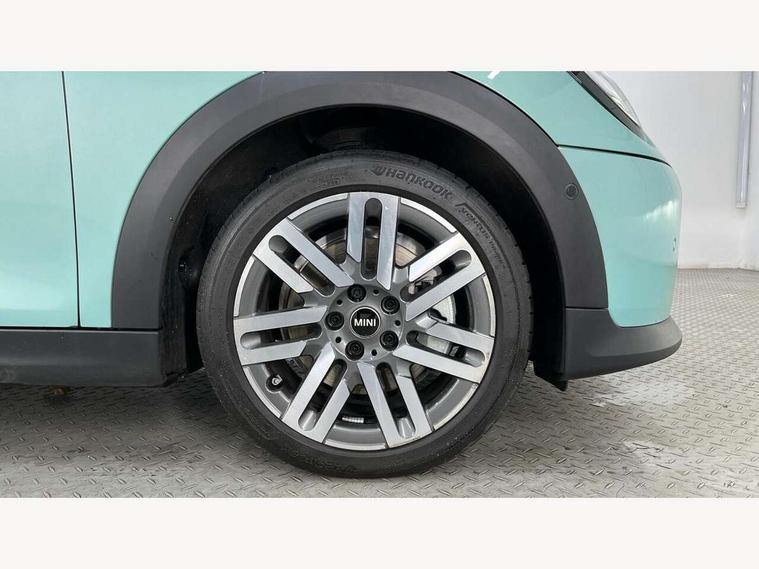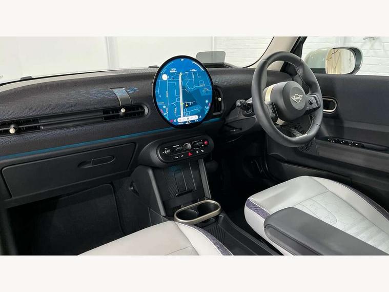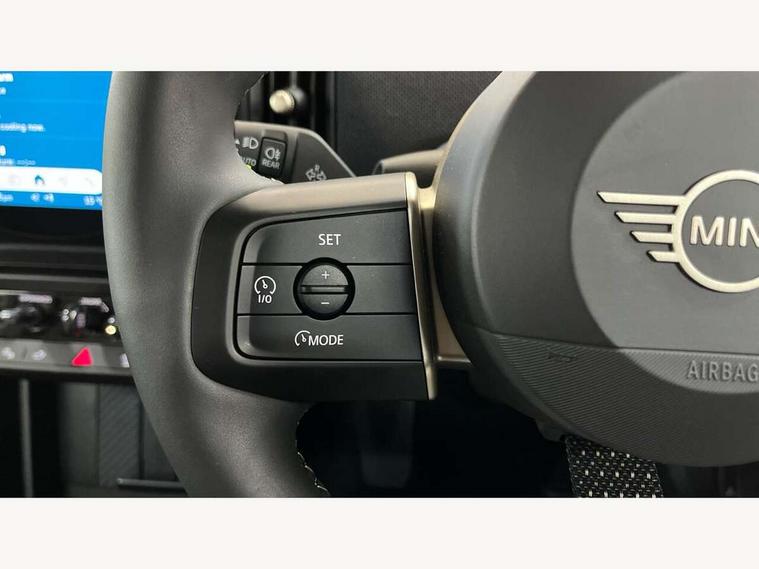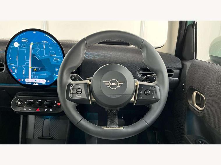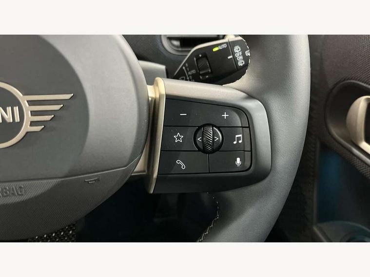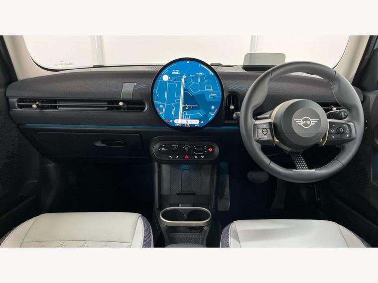 Central toggle bar, Circular OLED Screen, Compatible mobile phone bluetooth with audio streaming, Cruise control, Digital instrument cluster, Electro-mechanical speed dependant steering assistance, Emergency call service, MINI Experience Modes, Mini navigation system, On board computer, Service interval indicator, Tailgate, 7 speed steptronic transmission with double clutch, DAB Digital radio, Personal eSim, Auto headlights, Electric adjustable heated door mirrors, Electric front+rear windows, Heated rear window, Heated windscreen washer jets, LED 3rd brake light, LED daytime running lights, LED Headlights, LED indicator lights, LED rear lights, Rain sensor window wipers, Rear fog lights, Rear side wing doors, Rear window wiper, 2 zone automatic air conditioning, 3 seat bench in 2nd row, 60/40 rear seat bench, Ambient lighting, Cupholders, Front and rear floor mats, Front and rear head restraints, Front compact armrest, Heated steering wheel, Height adjustable passenger seat, Light headliner, Luggage compartment lighting, Single front passenger seat, Sport Vescin Steering Wheel black with vibrant silver accents, Sunvisors with vanity mirrors, Vescin/Cloth upholstery includes dash knit in black with blue accents, Driving assistant pack - Cooper Hatchback, Park assistant pack - Cooper Hatchback, 3 point seatbelts on all five seats, 6 Airbags - front, side, head and seat belt tensioners, Anti-lock braking system (ABS), Child locks on rear doors, DSC - Dynamic Stability Control, Electronic parking brake, Front and rear disc brakes, Front ISOFIX (iSize), Front passenger airbag deactivation, Traction control, Tyre pressure monitoring system, Alarm, Immobiliser, Remote central locking, Tyre repair kit,