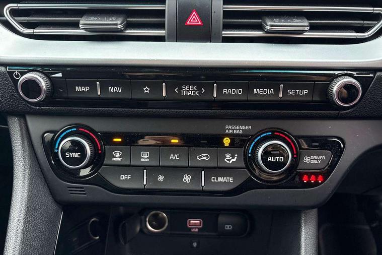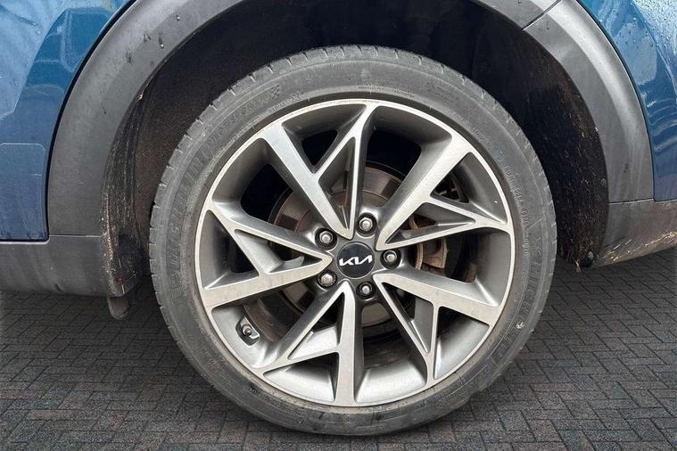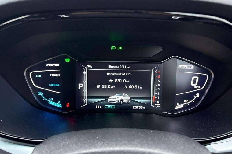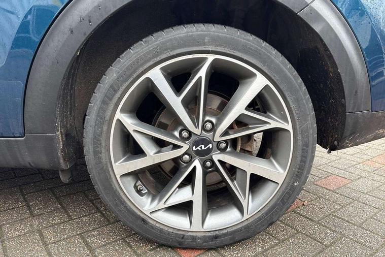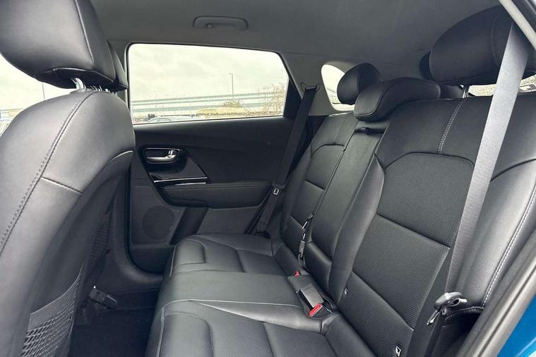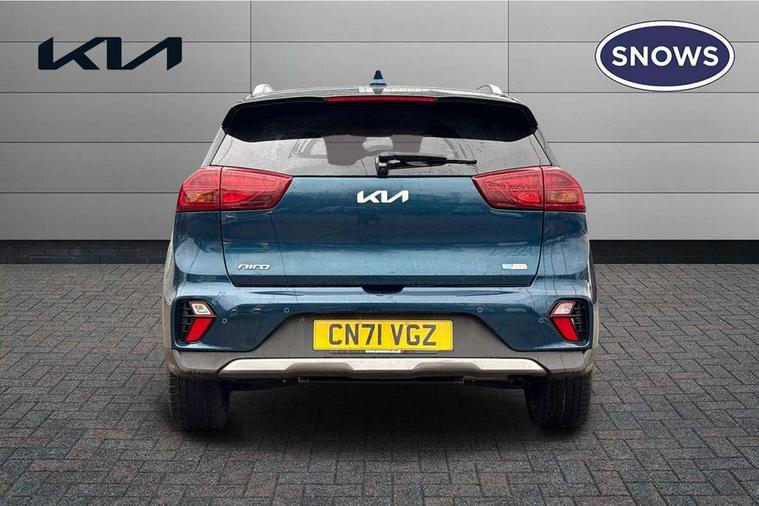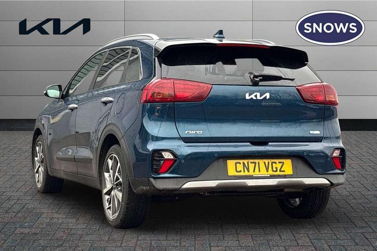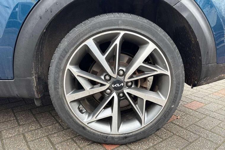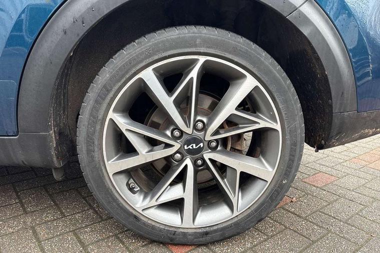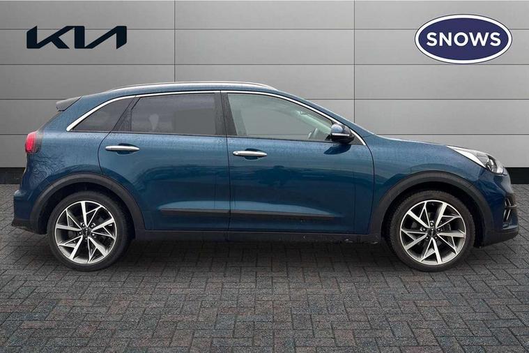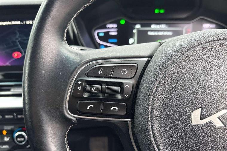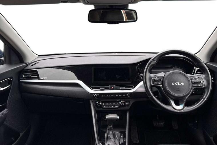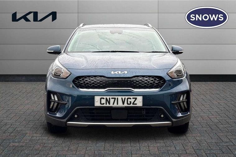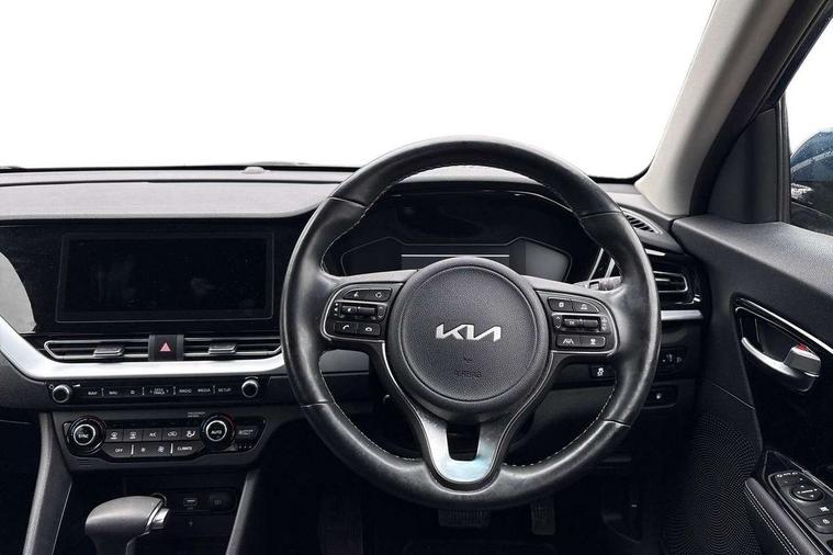 10.25" Touch screen satellite navigation with european mapping and traffic messaging channel, 7" full supervision cluster with TFT colour display, Adaptive smart cruise control function (SCC) with stop and go, Apple car play/Android Auto with voice control, Digital clock, Drive mode selector, Driver attention warning, Emergency stop signalling system, Forward collision avoidance assist, Front parking sensors, Kia connected services featuring TomTom live, Lane Following Assist (LFA), Lane keep assist, Motor driven power steering, Rear parking sensors, Reversing camera, Speed limiter, Trip computer with distance/fuel consumption/average speed, UVO connect, Wireless Smartphone charger, 'Shark fin' mobile antenna, 6 speakers, Bluetooth with music streaming, DAB Radio with MP3, Steering wheel mounted controls, USB connection located in centre console, USB port, All round electric windows with drivers and front passenger auto up/down function, Auto dimming rear view mirror, Automatic defog system, Automatic headlight control system, Black beltline mouldings, Black side sills, Black wheel arch mouldings, Body colour bumpers, Body coloured/high gloss door mirrors, Chrome door handles, Driver's side wide angle mirror, Electrically folding/adjustable/heated door mirrors with LED indicators, LED daytime running lights, LED fog lights, LED rear combination lights, Manual headlight levelling, Matt black radiator grille, Privacy glass - Rear windows and tailgate, Projector headlamps, Rain sensing front wipers, Rear spoiler, Rear wiper, Roof rails, Solar glass, Waistline black paint, Welcome and follow-me home light functionality, 3 x passenger assist grips, 60/40 split/folding 2nd row of seats, 8 way electric adjustable drivers seat, All-round height adjustable headrests, Aluminium door scuff plates, Bulb type overhead console lamp with sunglasses case, Centre console storage box, Centre room lamp, Cupholders in rear armrest, Driver/passenger sunvisors with illuminated vanity mirrors, Drivers seat power lumbar support, Dual zone automatic air conditioning, Front and rear door storage, Front/rear centre armrests, Headlining in Light grey, Heated front seats, Heated steering wheel, High gloss black lower console trim, High gloss black steering wheel trim, Illuminated ignition key hole, Interior door lock/unlock function, ISOFIX Child seat top tethers and anchor fixings, Leather trimmed door armrests, Leather trimmed gearshift, Leather trimmed steering wheel, Leather upholstery, Luggage area lamp, Luggage area load cover, Luggage net with hooks, Passenger seat height adjuster, Satin finish inner door handles, Seatback pocket - driver, Seatback pocket - front passenger, Steering wheel mounted paddle shift, Tilt/telescopic adjustable steering wheel, Under floor storage box, Ventiliation ducts to rear compartment, Towing pack - Niro, 3 point seatbelts on all seats, ABS, Automatic unlocking of doors in case of impact, Drivers knee airbag, Electric parking brake with auto hold function, Electronic stability control, Front passenger airbag cut-off switch, Height adjustable front seatbelts, Hill start assist control (HAC), Traction control, Twin curtain airbags with roll over sensor, Twin front and side airbags, Tyre pressure monitoring system, Alarm system and engine immobiliser, Deadlocks, Locking wheel nuts, Remote central door locking with fold away key, Speed sensitive auto door locking, Visible vehicle identification number, High gloss black centre fascia, High gloss black door inserts, 18" Alloy wheels, Tyre mobility kit,