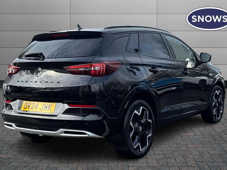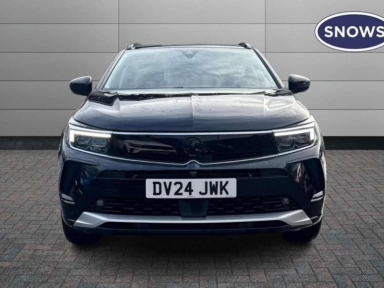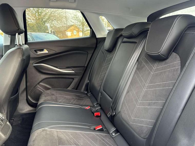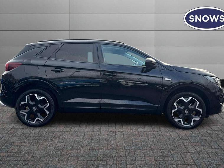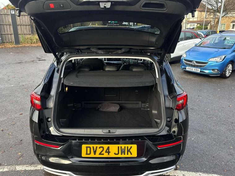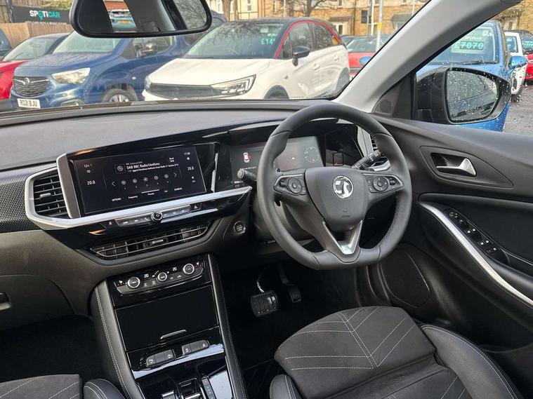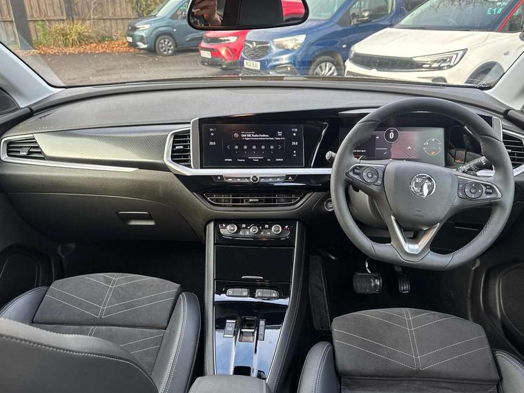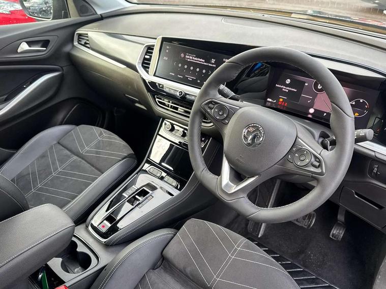 Central facia display with digital clock, outside air temperature and audio information, Digital fuel gauge with low fuel level warning light, Digital rev counter, Digital speedometer, Digital water temperature gauge with warning light, Drive mode selector (Eco, Normal, Sport), Driver drowsiness alert system, Driver information - Total mileage, service indicator, oil life, Front and rear parking distance sensors with 360 degree rear view camera and advanced park assist, Gearshift up/down indication light, Highway integration assist (Lane positioning assistant and Adaptive cruise control), Lane departure warning system, Lane keep assist, Lights on audible warning, Multi function trip computer - Trip odometer, vehicle range, average speed and fuel economy, instantaneous fuel economy and driving time, Multimedia Pure Panel Navigation System incl 10" colour touchscreen, 12" digital instrument cluster & satellite naviagtion, Power operated tailgate with foot sensor, Side blind spot alert, Speed sensitive electric power assisted steering, Speed sign recognition, Start/stop system, Vauxhall connect including Emergency call (SOS e-call) and Breakdown call (b-call), Wireless charger for mobile devices, Anti-roll bars, Compound crank rear suspension with coil springs and gas pressure dampers, Independent decoupled MacPherson strut front suspension with gas pressure dampers and coil springs, anti-roll bar, Six speaker - four front + two rear, Steering wheel mounted audio/phone/cruise controls, Automatic lighting control, Automatically dimming anti dazzle rear view mirror, Black door mirrors, Black side window trim, Body colour door handles, Body colour lower front and rear bumpers, protective wheel arches and lower door cladding, Body colour upper front bumper, Collapsible windscreen wipers, Dark tinted rear windows, Door to door illumination, Electric adjustable/heated/folding door mirrors, Electrically operated front and rear windows with safety auto reverse and one touch up/down facility, Front wiper system spraying directly from wipers, Hazard warning lights, Heated rear screen with timed cut off, Heated windscreen, High beam assist, High gloss black exterior detailing, High gloss black Griffin for Vizor and tailgate with high gloss black Grandland tailgate lettering, High gloss black roof rails, High level centre rear brake light, IntelliLux adaptive LED pixel headlights and LED tail lights, Intermittent rear window wash/wipe, LED daytime running lights, LED front fog lights, Magic wash, Manual headlight beam levelling, Rain sensor windscreen wipers, Rear side wing doors, Rear spoiler, Reversing light, Shark fin aerial, Silver effect protective front and rear skid plate, Soundproof insulated windscreen, Two speed windscreen wipers with variable intermittent wipe, Upper and lower bumper design, Vizor front grille, Welcome lighting, 12V electrical accessory socket in front, 3 bench rear seats in 2nd row, 3 spoke heated flat bottom leather effect steering wheel with satin chrome effect bezel, 6 way adjustable Ergonomic active heated sports style front seats AGR approved with seat cushion extension and lumbar adjustment, 60/40 split folding rear seat with centre rear seat armrest and load though facility, Advanced predictive logic control system using a sun sensor, Alcantara upholstery, Ambient centre console downlighter, Automatic air direction and fan speed with manual override, Charcoal filter, Chrome effect interior door handles, Covered storage compartment in centre console and in driver armrest, Driver's centre armrest, Driver/passenger sunvisors with illuminated vanity mirrors, Dual zone electronic climate control, Front door pockets with 2.6 litre capacity, Front seat back storage pockets, Fully carpeted luggage area, Height adjustable headrests, Illuminated luggage area, ISOFIX on front passenger and rear outer seats, Luggage compartment cover, Reach + rake adjustable steering column, Rear centre seat head restraint, Rear door pockets with 1.8 litre capacity, Rear passenger compartment heating ducts, Rear reading lights, Two drinks holders in centre console, Anti-lock braking system (ABS), Automatic emergency braking with pedestrian detection, Child proof locks on rear doors, CSC - Cornering stability control, Deactivation switch for front passenger front and side impact airbags, Deflation detection system, Driver airbag, Dual seatbelt pretensioners on front seats, EBD - Electronic brakeforce distribution, Electronic parking brake, Electronic stability program (ESP) including traction control, Forward collision alert, Front brake ventilated disc 304mm diameter, Front passenger airbag, Front seat side impact airbags, Full-size curtain airbags for driver and front passenger, Hill start assist, Hydraulic Brake Assist (HBA), Inertia reel lap and diagonal seatbelts for all seats, Load limiters on outer rear seatbelt retractors, Pretensioners on outer rear seatbelt retractors, Rear brake ventilated disc 268mm diameter, Smart seatbelt reminder for front and rear seats, Tyre pressure monitoring system, Central locking, Deadlocking system, Electronically protected audio equipment, Engine deadlock immobiliser, Keyless entry and start, Locking wheel nuts, Remote security alarm system, Black door panels with black premium leather effect inserts, Dax decor facia panel with palladium medium finish, 19" diamond cut bi-colour alloy wheel,