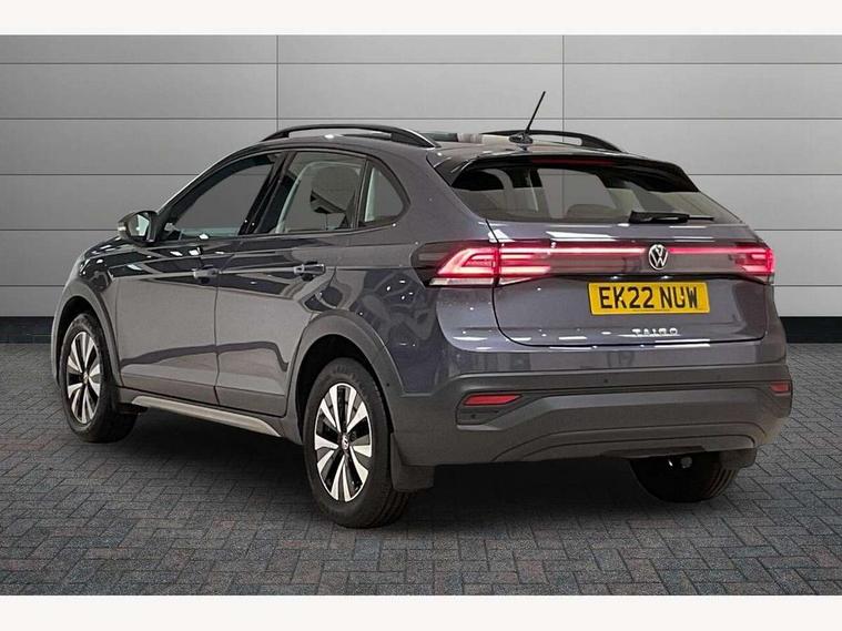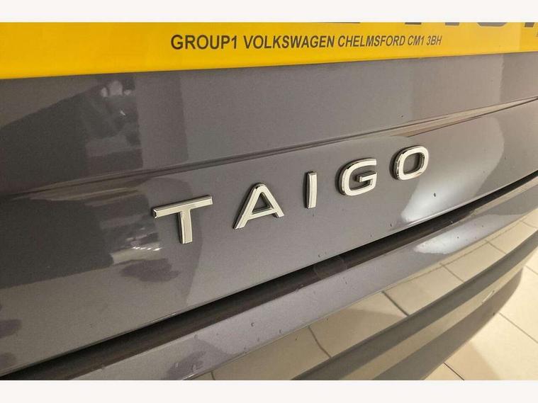 App-Connect including App-Connect Wireless, Driver alert system, e-Call (emergency call), Power Steering, Travel assist including emergency assist, Washer fluid level indicator, Wireless Charging including Bluetooth, Start-stop system with battery regeneration (recuperation - energy recovery during braking), Digital radio reception (DAB+), Diversity antenna for FM reception, WeConnect plus, Aspherical driver's exterior mirror, Auto headlights, Body coloured bumpers, Body coloured exterior mirror housings and door handles, Electric windows, External USB type C socket and charging sockets, Front fog lamps with cornering function, Headlight range control, Heat insulating glass windscreen, LED headlamps, LED rear combination lamp, LED third brake light, Left convex exterior mirror, Power folding adjustable/heated exterior mirrors and front passenger exterior mirror lowering function, Rear fog light on one side, reversing light on both sides, Rear side wing doors, Rear wash/wipe with intermittent wipe setting, 'Slash/ Austin' Cloth upholstery, 12V socket in centre console, 2 front reading lights, 3 rear head restraints, 3 seat bench in 2nd row, Ambient lighting with logo projection, Black carpets, Child seat anchor for child seat system i-Size, 2x top tether, and child seat anchor in front on front passenger side, Door and side trim panels in titan black, Driver and front passenger seat height adjustment, Front centre armrest, Handbrake lever handle in leather, Height and reach adjustable steering wheel, Leather trimmed gear knob, Leather wrapped multifunction steering wheel, Luggage compartment floor, Luggage compartment light, Lumbar support for driver's and front passengers seat, Seat covers in titanium black, Single front passenger seat, Split folding backrest with centre armrest and unsplit rear seat bench, Storage compartment under front seats, Sun visors with illuminated vanity mirrors, Chrome Package - Taigo, Drivers assistance pack - Taigo, Light and Sight pack including High beam assist - Taigo, 2 x 3-point seatbelts/outer rear seats with ECE label, 3-point seat belts in front with pretensioner and height adjustment, 3-point seatbelt for centre rear seat, Driver and front passenger airbags with front passenger airbag de-activation, front side and curtain airbags, Driver and front passenger safety-optimised head restraints, Electronic stability control, Extended and predictive pedestrian/ cyclist protection, Front and rear disc brakes, Front curtain and side airbags with center airbag, Hill start assist, Manual rear child locks, Single tone horn, Tyre pressure loss indicator, Anti-theft alarm system with interior monitoring, backup horn, and towing protection, Anti-theft wheel bolts, Lava stone black gloss/matt decorative inserts in dash and front door panels, Low rolling resistance tyres,