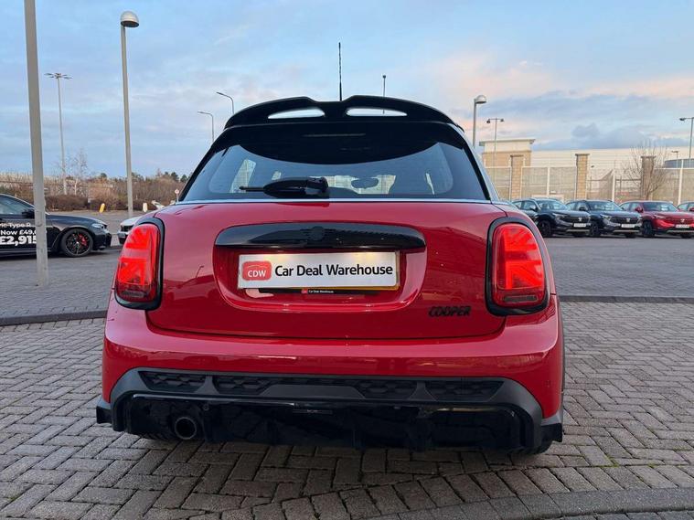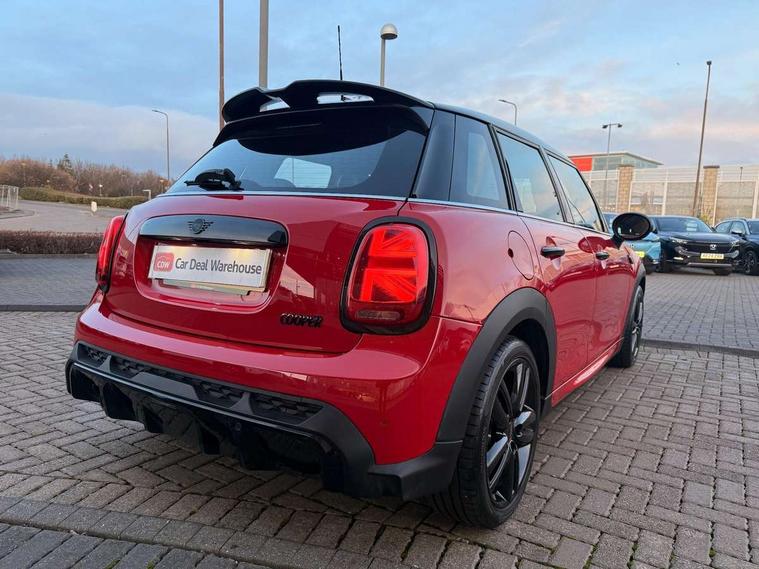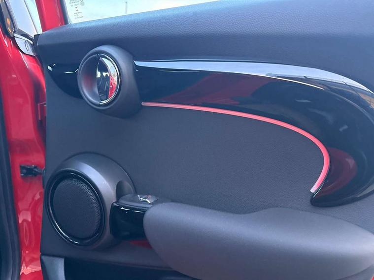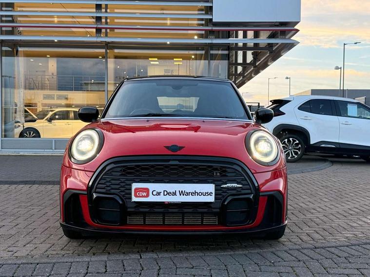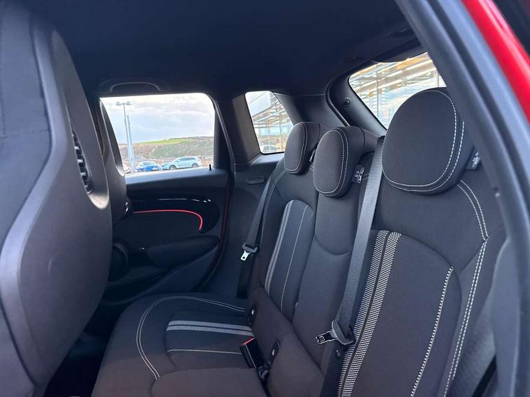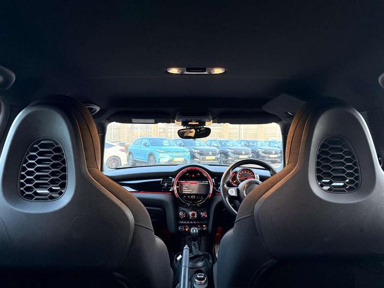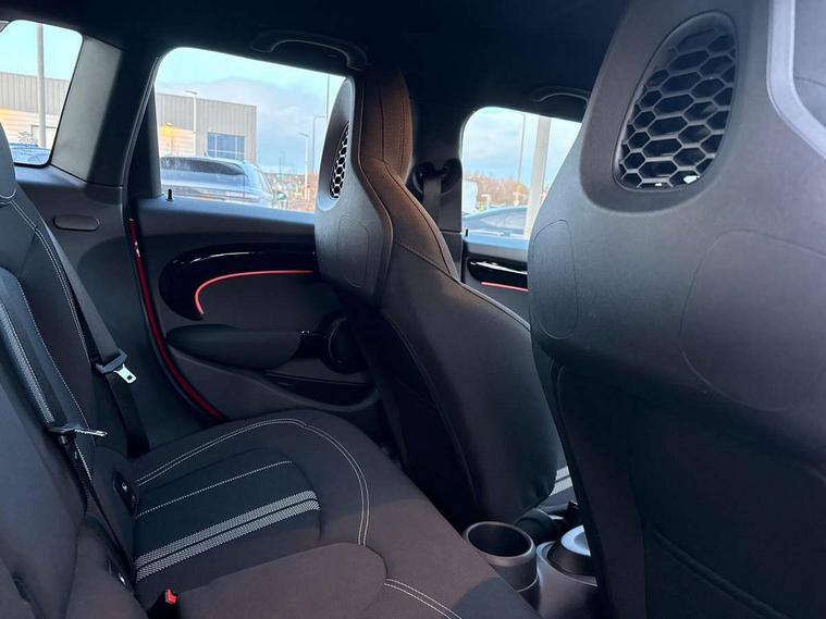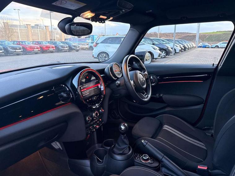 Automatic start/stop function with brake energy recuperation, Compatible mobile phone bluetooth with audio streaming, Cruise control with brake assist, Electro-mechanical speed dependant steering assistance, Flexible car sharing preparation, Instrument cluster, MINI Driving Modes - centre toggle switch to control driving setting (sport, mid and green), Mini E-call, MINI TeleServices, On board computer, Rear park distance control, Service interval indicator, 6 Speed manual transmission including gear change indicator display, Adaptive suspension, Double Vanos system, Fully variable valve control, High precision injection, Performance Control, 6 speakers in front door trims and underneath front seats, 8.8" touchscreen with LED ring, FM tuner and DAB digital radio, Automatic headlight activation switch, Body colour fuel filler cap, Chrome border high gloss black slats radiator grille, Dynamic brake lights, Electric front+rear windows, Exhaust tailpipe on left with chrome finisher, Heated rear window, Heated windscreen washer jets, JCW Aerodynamic kit - Front and rear bumpers with sporty JCW styling and part-painted side sills with MINI John Cooper Works door sill finishers, John Cooper Works rear spoiler, LED headlight with closed ring and daytime driving lights, Metal door sill strips with MINI imprint, Model logo Cooper on right of tailgate, Rain sensor window wipers, Rear fog lights, Rear LED lights with union jack design, Rear window wiper, Side scuttle panel with integrated indicator, Sun/heat protection glass, White indicator lenses, 12V Accessory socket in centre console, 4 lashing eyes in luggage compartment, 60/40 split folding rear seat, Anthracite headliner including grab handles and clothes hooks, Carbon black colour line - Knee roll and door armrest, Chrome interior highlights, Cupholders, Front and rear isofix with front passenger airbag deactivation, Glove compartment, Height and length steering column adjustment, Interior lighting with 12 different colours across the dashboard, underneath door bezel with illuminated laser-engraved design on central display, JCW Sport seats with integrated headrests, adjustable thigh support and John Cooper Works logo, Leatherette gearshift lever and handbrake gaiters, LED reading lights, vanity mirror lights, front foot well light and spotlight on front seats, Manual air conditioning, Mechanical seat adjustment - forward/back & backrest for front seats and driver seat height adjust, Multifunction steering wheel, Storage compartments in doors, Sunvisors with vanity mirrors, Velour floor mats, Walknappa leather steering wheel with grey seam and John Cooper Works badge on Piano Black lower steering wheel spoke, Piano black exterior pack - Mini Hatchback Cooper, 3 point seatbelts on all five seats, 6 Airbags - front, side, head and seat belt tensioners, Anti-lock braking system (ABS), DSC - Dynamic Stability Control, Front and rear disc brakes, Hill start assist, Single tone fanfare horn, Tyre pressure monitoring system, Alarm system with tilt sensor, monitoring doors, bonnet interior and tailgate, Electronic vehicle immobiliser, Start/stop toggle with keyless go, Piano black interior trim, Tool kit,