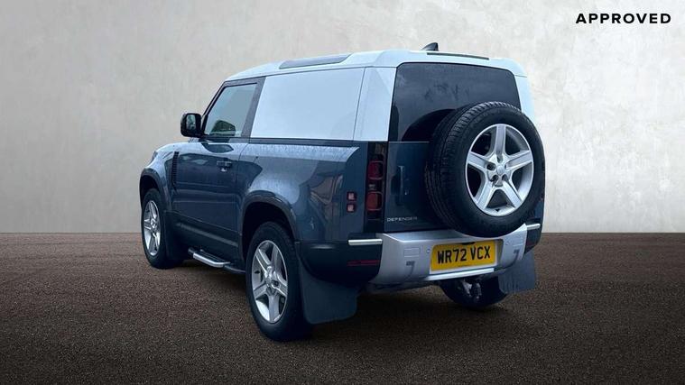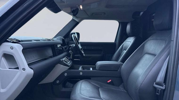 Customer Configurable Autolock, 360 parking aid, 3D Surround Camera with 360 View, 180 Rear View, Front Traffic Detection, Forward Vehicle Guidance, Tow Hitch Assist and clear sight Ground View, Blind spot assist, Brake Hold, Driver condition monitor, Electric power assisted steering (EPAS), Lane keep assist, Low traction launch, Pivi pro connected, Rear traffic monitor, Traffic sign recognition adaptive speed limiter, Trip computer, Tyre pressure monitor, Wade Sensing, Android Auto, Apple CarPlay, DAB Radio (Digital Audio Broadcasting), Meridian 280W sound audio system with 7 speakers with subwoofer, Alpine lights, Assisted tailgate, Auto High Beam Assist, Automatic headlight levelling, Automatic headlights and rain sensitive front wipers, Centre high mounted stop light, Electric heated/power fold door mirrors with approach lights and auto dimming driver side, Electric windows with one touch open/close and anti-trap, Exterior signage panel, Follow me home lighting, Front fog lights, Heated rear window with timer, Heated windscreen, LED tail light, Privacy glass, Puddle lights, Rear fog lights, Rear wash wiper, Side-hinged tailgate, Standard roof, Standard tread plates, Additional lashing points, Dual zone climate control, Durable rubber cabin flooring, Footwell lights, Full height bulkhead behind row 1 seats, Glovebox storage, High sided rubber mats, Loadspace cover, Loadspace hooks, Loadspace rubber mat, Manual adjustable steering column, Overhead stowage for sunglasses, Rear centre headrest, Rear reading light, Standard interior, Standard seating configuration, Sunvisors with illuminated vanity mirrors, Twin front cupholders, Upgraded loadspace LED lighting, Online pack - Defender with data plan, Brake pad wear indicator, Electronic traction control, Emergency braking, Front airbags, with passenger seat occupant detector, Power operated child locks, Remote for (e-Call, Optimised assistance call, InControl app, Climate, beep and flash and door), Seat belt reminder, Intrusion sensor, Keyless entry system, Locking wheel nuts, 8 speed automatic transmission, ABS and EBA, All wheel drive, CBC - (Cornering brake control), Dynamic stability control, Electronic brake force distribution, Electronic park brake, Gradient acceleration control, Hill Descent Control, Hill start assist, Particulate filter (DPF), Push button start, Roll stability control, Trailer stability assist, Twin speed transfer box (high/low range),