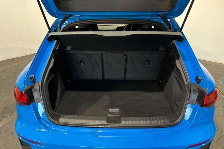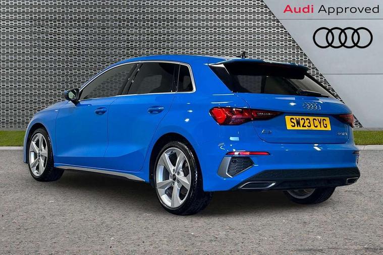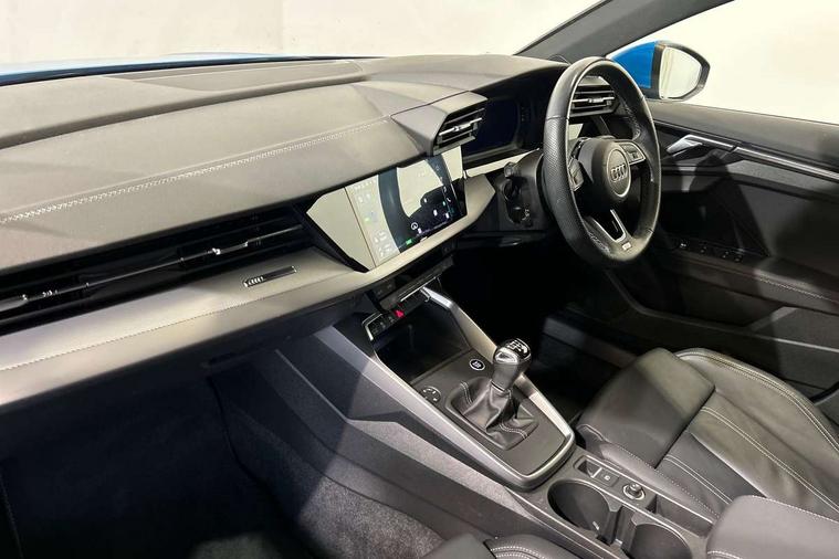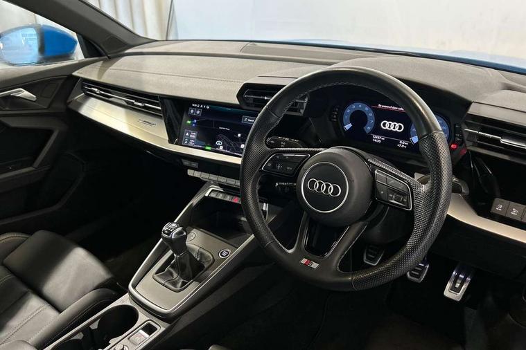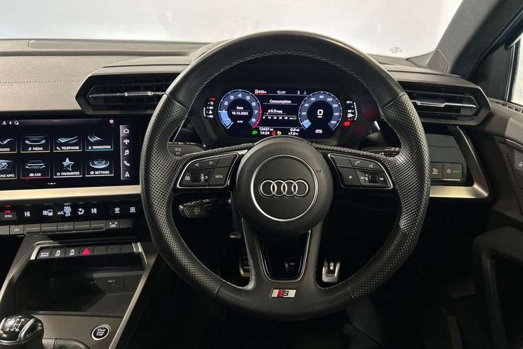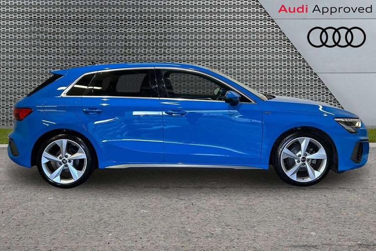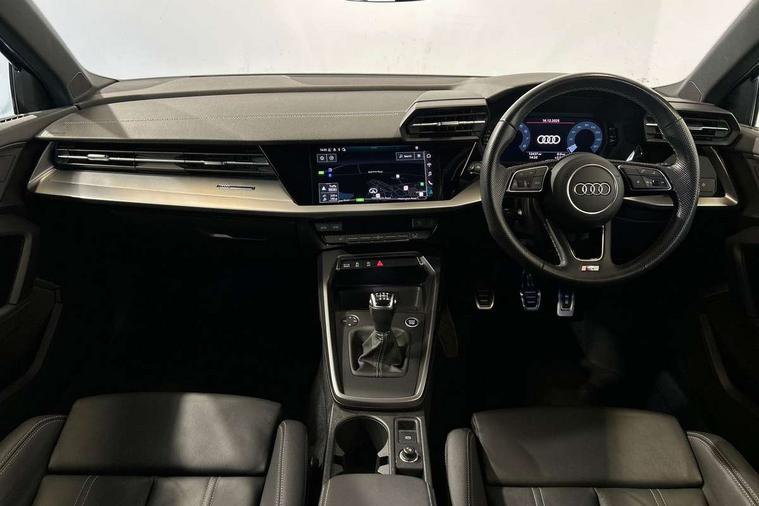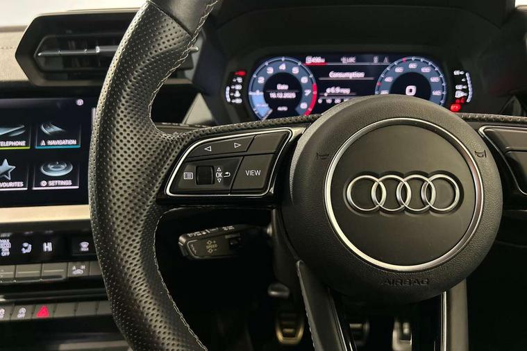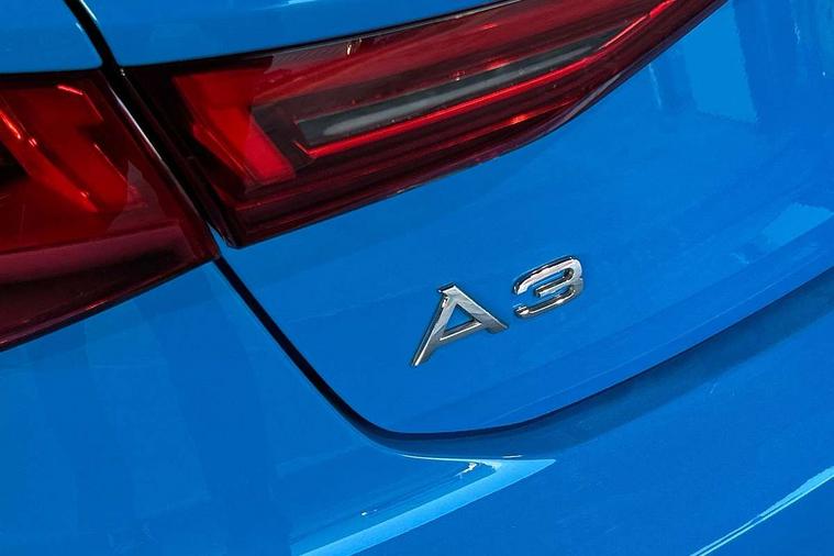 Audi drive select (Auto, Comfort, Dynamic and Individual), Audi smartphone interface, Audi Virtual Cockpit - 10.25" digital and colour instrument cluster, Automatic start/stop system with recuperation, Bluetooth interface, Camera based traffic sign recognition, Collision avoidance assistant, Cruise control, e-Call (emergency call), Electromechanical power speed sensitive steering, Lane departure warning system, MMI Navigation Plus with high resolution 10.1" colour touch screen display, Rear parking sensors, Service indicator, Trip computer, Voice control system with natural language interaction, Sports suspension, 2xUSB-C connection with data and charging functions, 6 passive loudspeakers, DAB Digital radio, 3rd brake light, Acoustic glass windscreen, Aluminium window trim, Auto dimming frameless rear view mirror, Body colour exterior mirrors, Electrically adjustable/heated/folding/auto dimming door mirrors with integrated LED indications + kerb view function for passenger side, Front electric windows, Illuminated aluminium inserts front door sills with S logo, LED daytime running lights, LED headlights with LED rear lights and dynamic rear indicators, Light and rain sensors, Privacy glass - dark tinted rear window, rear door and side windows, Rear electric windows, Rear side air outlets in grained matt black, Rear side wing doors, Rear wiper, S line bumpers, S roof spoiler, 12V socket and storage compartment in front centre console, 3 seat bench in 2nd row, 3 spoke leather multifunction steering wheel, 4 way electrically adjustable lumbar support for driver and front passenger, 60/40 split folding rear seat bench, Black cloth headlining, Dual zone electronic climate control, Front and rear centre armrest in leather, Front and rear headrests, Front/rear floor mats, Height and reach adjustable steering wheel, Interior lighting - glove compartment light and right hand side, Luggage compartment floor covering, Manual boot compartment lid, Manually adjustable front seats, Seat side bolsters, Single front passenger seat, Stainless steel pedals and front footrest in black, Twin leather upholstery with front sports seats S embossed logo, Aluminium interior elements pack - A3 Sportback, LED interior lighting pack - A3 Sportback, S line styling pack - A3 Sportback, 3x3 point rear seat belts, Driver and front passenger airbag with passenger airbag deactivation, Electronic Stabilisation Control (ESC) including ABS, ASR and EDL, First aid kit with warning triangle and 2 safety vests, Front side airbags with head airbags and interaction airbag, Pre-sense front with pedestrian and cyclist detection, Seatbelt monitoring, Tyre pressure loss indicator, Anti theft alarm, Anti-theft wheel bolts, Electronically operated child lock, Immobiliser, Remote control central locking, Dark spectrum aluminium inlays, accent surfaces in the dashboard and centre console in platinum grey silk effect paint finish,