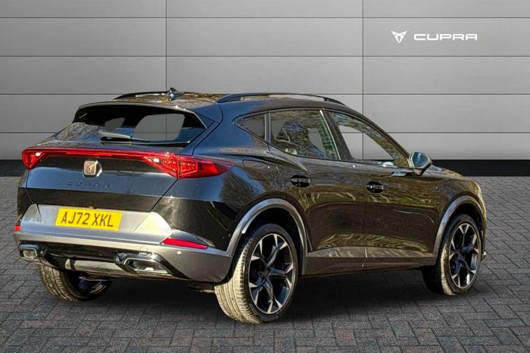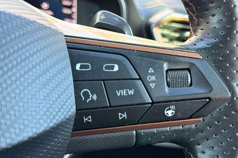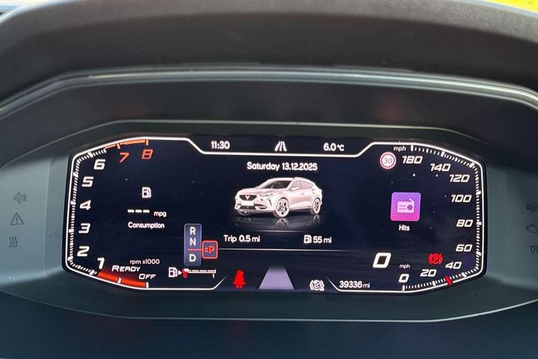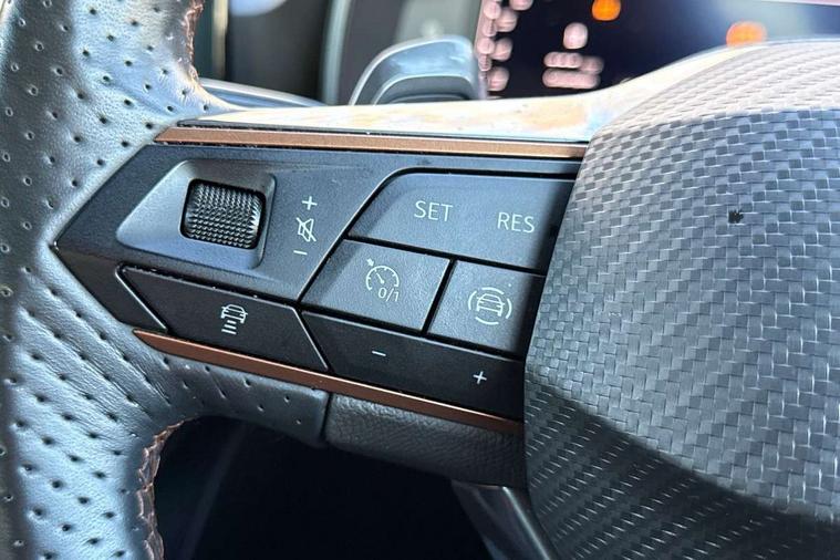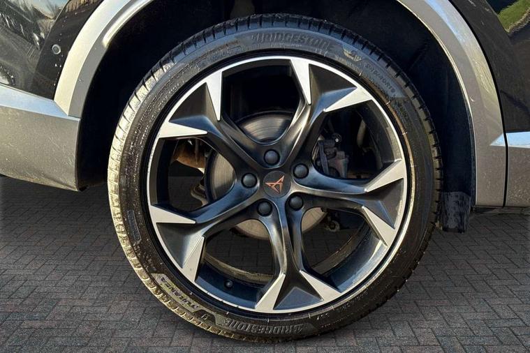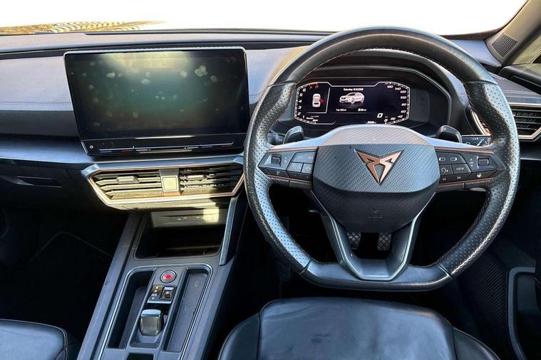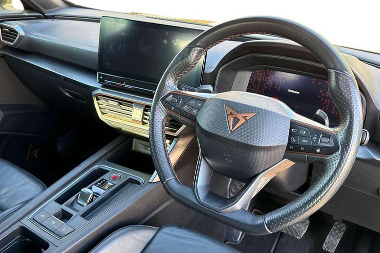 Digital cockpit and configurable dashboard, Driver alert system, Driving profile selection, Forward collision warning with automatic braking, Lane assist, Navigation system with 12'' Touchscreen Display, Park assist (inc front/rear parking sensors), PAS, Predictive adaptive cruise control with speed limiter, Rear view camera, RPM, trip computer, outside temp gauge, instrument light brightness, low fuel warning light, lights on reminder, gearshift indicator, Service interval indicator, Start/stop system with regenerative braking, Voice control system, Wireless apple carplay, Wireless phone charger, Electronic locking differential and dynamic traction support, Standard suspension, 2 front and 2 rear USB type C sockets, Auxiliary input socket, DAB radio, Auto dimming rear view mirror, Body colour door handles, Body coloured bumpers, Dark grey wing mirror, Daytime running light with automatic headlight control and coming home feature, Dynamic headlight range control, Electric front/rear windows, Electrically adjustable heated and folding door mirrors with memory function, Front fog lamps with cornering function, Gloss black roof rails and window surrounds, LED Headlights, LED Taillights with dynamic indicator, Rain sensing wipers, Rear diffuser with black simulated exhaust pipes, Rear side wing doors, Rear wash/wipe, Third brake light, Tinted rear windows, Welcome lights, 12v power supply in centre console, 12V socket, 12v socket in loadspace, 2 front and 2 rear reading lights, 230V socket, 3 seat bench in 2nd row, 60/40 split rear bench seat with armrest and mechanical seat release, Black headlining, Dust/pollen filter, Front and rear head restraints, Front centre armrest, Height/reach adjust steering wheel, Illuminated interior front door sills, Illuminated sunvisor with mirror, Isofix, Leather multi function heated steering wheel with gear shift paddles, Luggage tie-down hooks, Single front passenger seat, Three zone climate control with control panel in rear, Variable luggage/load compartment floor, Wraparound lighting, Genuine Nappa leather Pack - Cupra, 3 point seatbelts on all rear seats, ABS, Brake control system - ESC and brake booster, Child proof door locks, Driver and front passenger airbags with front passenger airbag de-activation, Electronic parking brake, Front and rear disc brakes, Front side curtain airbags, Hill hold control, Public e-call, Seat belt reminder for front and rear seats, Tyre pressure monitoring system, Anti theft alarm system, Keyless entry and start system (KESSY), Locking wheel bolts, Copper and aluminium interior detailing, 19" 'Exclusive' machined sport matte black and silver alloy wheels,