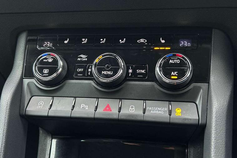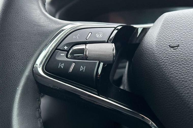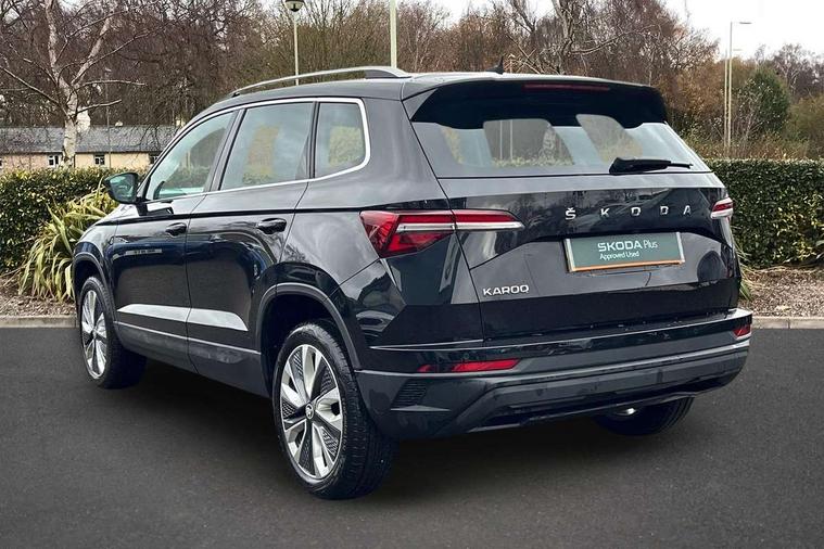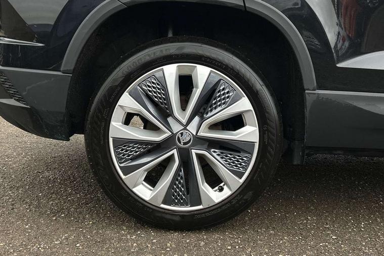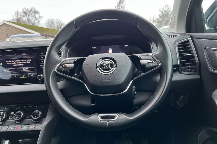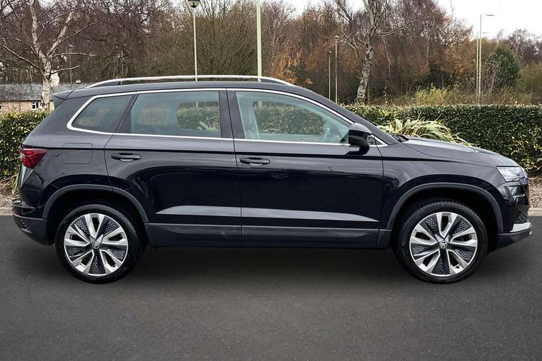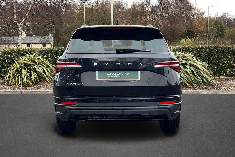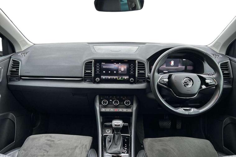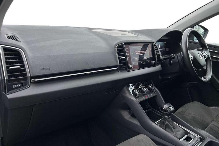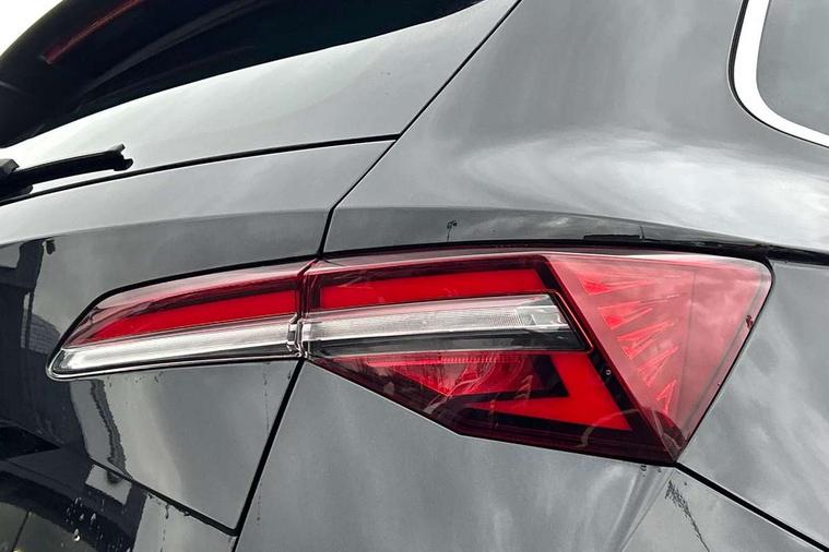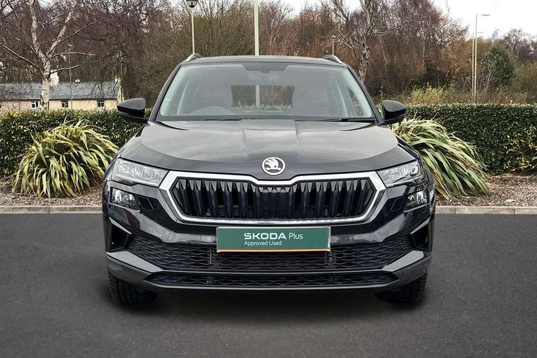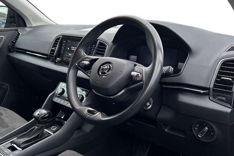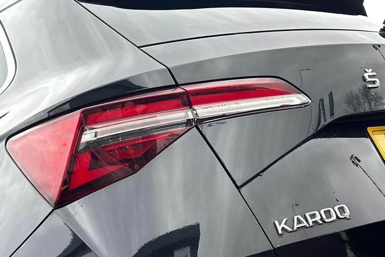 8" Digital display, Care connect, Driver fatigue sensor, Emergency services call system, Outside temperature gauge, Service interval indicator, SmartLink wireless for Apple and wired for Android, Start/stop system with regenerative braking, USB C Port x 2 in front centre console, 8 Speakers, DAB radio with Bluetooth, USB connection, Acoustic glass, Aero front windscreen wipers with intermittent function, Auto dimming rear view mirror with light and rain sensors, Black electric window control buttons, Body colour door mirrors and handles, Dynamic headlight range control with cornering light function, Electric front and rear windows with child proof lock, Heated rear windscreen, LED daytime running lights, LED rear lights with high functionality welcome effect and dynamic indicators, Light assistant (coming/leaving home/tunnel light), Plastic scuff plates, Privacy glass, Rear side wing doors, Rear spoiler, Rear window wiper with washer system and intermittent control, Safety reflectors on front doors, 1.5 litre bottle holders in driver and front passenger door panels, 12V socket in boot, 12v socket in front centre armrest with storage compartment and rear air vents, 2 Folding hooks and nets in boot, 2 spoke leather heated multifunction steering wheel with DSG paddles, 2 x Tablet holder, 3 rear height adjustable headrests, 3 seat bench in 2nd row, 4 foldable roof handles with rear coat hooks, Black floor carpet, Chrome inner door handles, Decorative door sills with KAROQ badging, Double sided boot floor, Foldable hooks in the boot, Front head restraints, Height adjustable front three point seats belts with tensioners, Height/reach adjust steering wheel, Ice scraper, Illuminated glovebox, Illuminated luggage compartment, Isofix child seat preparation for front passenger seat, Isofix child seat preparation outer rear, Manual lumbar support for front seats, Pen holder, Pollen filter, Rear boot cover, Rear reading lights, Rubbish bin door, Safety vest holder, Single front passenger seat, Storage box in upper central dashboard closed, Sunvisors with illuminated vanity mirrors, Textile floor mats, Ticket holder, VarioFlex seats with standard rear seat release, Chrome roof rails + chrome pack - Karoq, Parking pack - Karoq, Automatic door unlocking in case of crash, Automatic fuel cut off in case of crash, Child locks on rear doors, Driver airbag, Electronic parking brake with auto hold function, Emergency rear braking signal, ESC including ABS, MSR, ASR, EDS, HBA, DSR, RBS, MKB and traction control, Front side airbags, Hill hold control, Knee airbags, Passenger airbag with switch-off function, Pedestrian monitor, Seatbelt reminder signalisation and pretensioner for all seats, Three point seatbelts rear, Two tone horn, Tyre pressure display, Tyre pressure monitor, Alarm with interior monitoring, back up horn and tilt sensor with safe function, Electronic engine immobiliser, Keyless entry and start/stop, Remote central locking with 2 remote folding keys, Chrome framed air vents, Anti-theft wheel bolts protection, Storage on wheel cover, Tool kit,