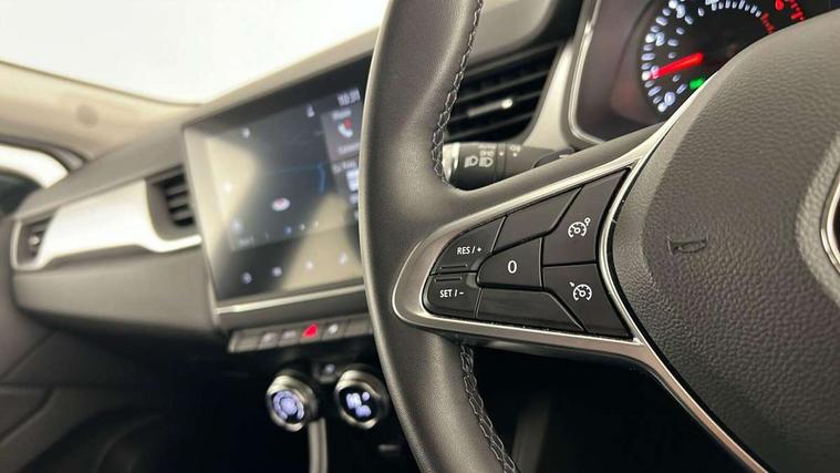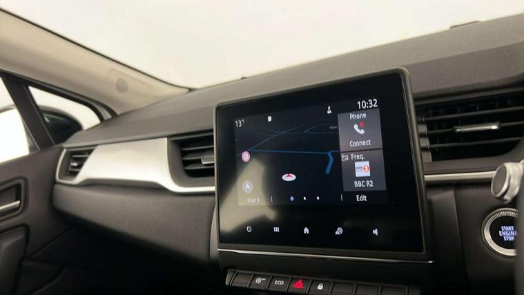 4.2" TFT Driver information display, Cruise control + speed limiter, eCall emergency call system, Eco mode, Gear change indicator, Lane departure warning system, Lane keep assist, Renault automatic emergency assist, Traffic sign recognition, Trip computer, Variable assistance power steering, EasyLink Nav 7" touchscreen, 4x20W amp, FM DAB, sound auditorium, 2xUSB, 1xJack, Bluetooth, smartphone integration plus, Apple carplay/Android auto, Automatic front wipers with rain sensors, Automatic headlights, Body colour door handles, Body coloured bumpers, Body coloured door mirrors, Electric adjustable/heated/folding door mirrors, Electric front windows + one touch + anti-pinch, Electric rear windows, Extra tinted glass in rear windows and tailgate, Full LED front and rear headlamps integrating daytime running lights at the front and rear, Gloss black side door protection with chrome effect, LED front fog lights, Rear fog lights, Rear wiper, Roof bars, Variable speed on front windscreen wipers, 12V Accessory socket, 3 rear headrests, 5.2L front glovebox, 60/40 split folding rear seat bench, Automatic climate control with one touch demist function, Centre console storage tray, Cloth upholstery, Front head restraints, Heating system with pollen filter, Height adjustable driver's seat, Height/reach adjust steering wheel, ISOFIX child seat fixing points on rear outermost seats, Middle console with armrest and storage, Rear air vents, Synthetic leather steering wheel, 3 rear seatbelts, ABS+EBA, AEBS, Distance warning alert, Driver and front passenger, side, head and curtain airbags, Driver height adjustable seat belt, Electric parking brake, Electronic stability control, Front and rear no seatbelt warning sound, Front dash warning indicator in case of heavy braking, Front driver and passenger side airbag deactivation, Hill start assist, Rear door and window child locking function for rear door, Tyre pressure warning light, Anti drill door locks and locking fuel cap, Deadlocking system, Hands free keycard with push button and start/stop function, RAID (Renault Anti-Intruder Device) automatic door locking, Remote central locking with thatcham approved immobiliser, Black soft touch dashboard with black gloss air vent surrounds,