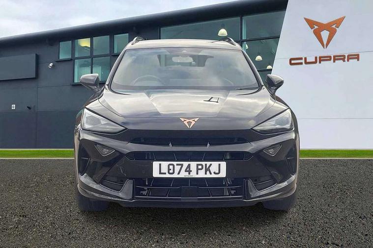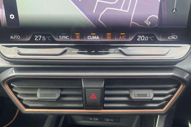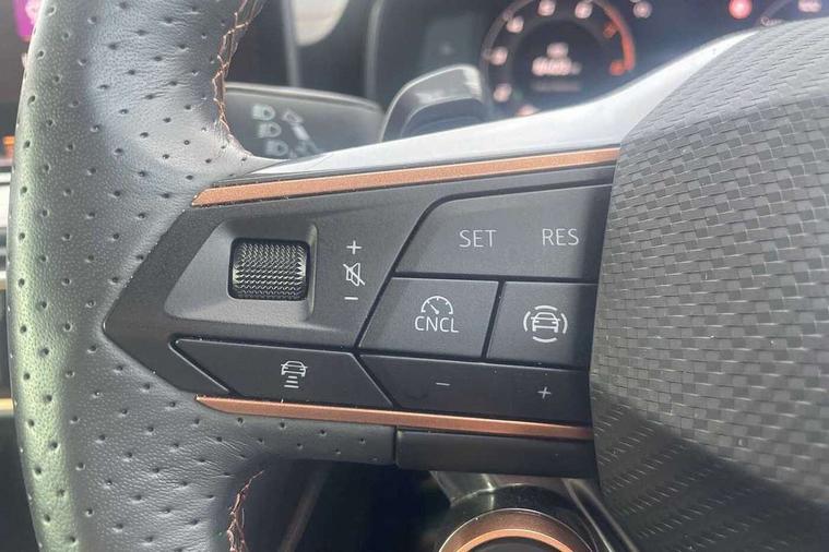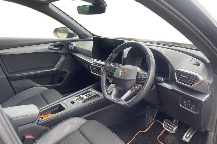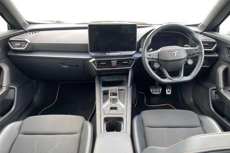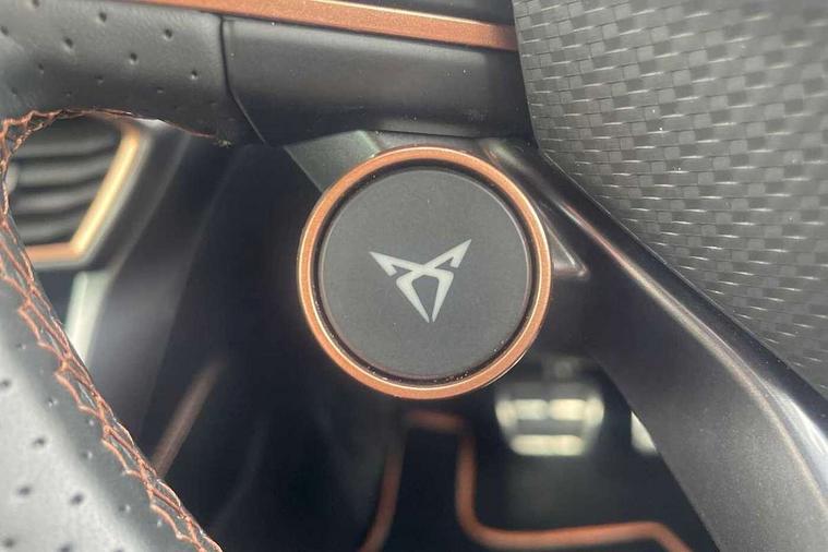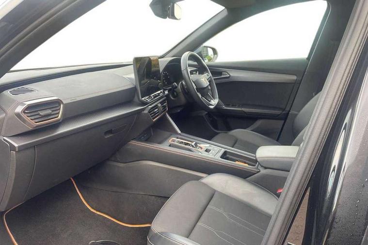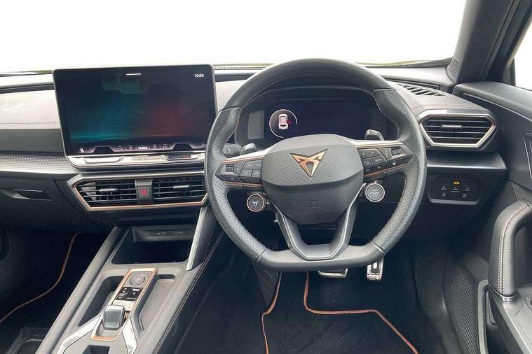 10.25" digital cockpit and configurable dashboard, Adaptive cruise control with follow-to-stop and speed limiter, Advanced driver alert system, Driving profile selection, Dynamic road sign display, Emergency steering support with turn assist, Forward collision warning with automatic braking, Front and rear parking sensors, Full link phone integration, Lane assist, Progressive steering, RPM, trip computer, outside temp gauge, instrument light brightness, low fuel warning light, lights on reminder, gearshift indicator, Service interval indicator, Start/stop system with regenerative braking, Voice control system, Wired Android Auto, Wireless apple carplay, Wireless phone charger, 10 amp mode 2 charging cable, 32 amp mode 3 charging cable, CUPRA sport suspension, Electronic locking differential and dynamic traction support, 2 front and 2 rear USB type C sockets, 7 speakers, Media system with navigation, 12.9" touchscreen display, voice control, DAB, steering wheel mounted controls, Auto dimming rear view mirror, Body colour door handles, Body coloured bumpers, Dark grey wing mirror, Daytime running light with automatic headlight control and coming home feature, Door panel ambient lighting, Dynamic headlight range control, Electric front/rear windows, Electrically adjustable, heated and folding door mirrors, Gloss black roof rails and window surrounds, High beam assist, LED 3rd brake light, LED front fog lamps with cornering function, LED Headlights, LED Taillights with dynamic indicator, Rain sensing wipers, Rear diffuser with copper simulated exhaust pipes, Rear fog lights, Rear side wing doors, Rear wash/wipe, Tinted rear windows, Welcome lights (within exterior mirror housing), 12V socket, 2 front and 2 rear reading lights, 3 seat bench in 2nd row, 60/40 split rear bench seat with armrest and mechanical seat release, Black headlining, Black interior roof lining, Cupra sports pedals, Dust/pollen filter, Front and rear head restraints, Front centre armrest, Heated supersports multifunction leather steering wheel with satellite buttons and gear shift paddles, Height/reach adjust steering wheel, Illuminated aluminium doorsteps, Illuminated interior front door sills, Illuminated sunvisor with mirror, Interior ambient lighting, Isofix, Manually adjustable height and lumbar support for front seats, PVC/Cloth upholstery with copper stitching + Sport seats, Satellite steering wheel, Single front passenger seat, Storage pockets on rear of front seats, Three zone climate control with control panel in rear, 3 point seatbelts on all rear seats, ABS, Brake control system - ESC and brake booster, Child proof door locks, Driver and front passenger airbags with front passenger airbag de-activation, Electronic parking brake, Front and rear disc brakes, Front side curtain airbags, Hill hold control, Public e-call, Seat belt reminder for front and rear seats, Tyre pressure monitoring system, Anti theft alarm system, Central locking system Keyless Go, Locking wheel bolts, Copper and aluminium interior detailing, 18" Sonora machined silver alloy wheels, Breakdown and tool kit,