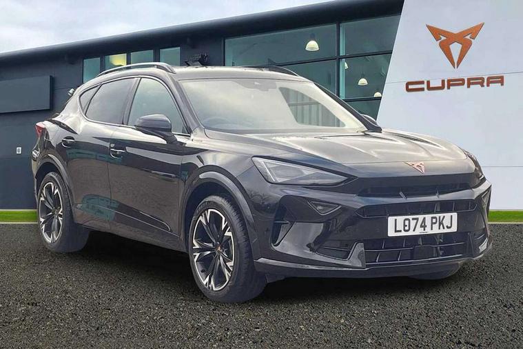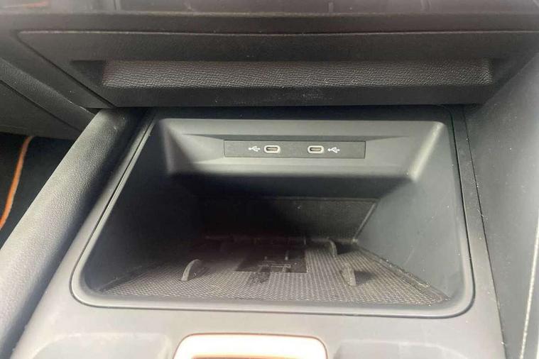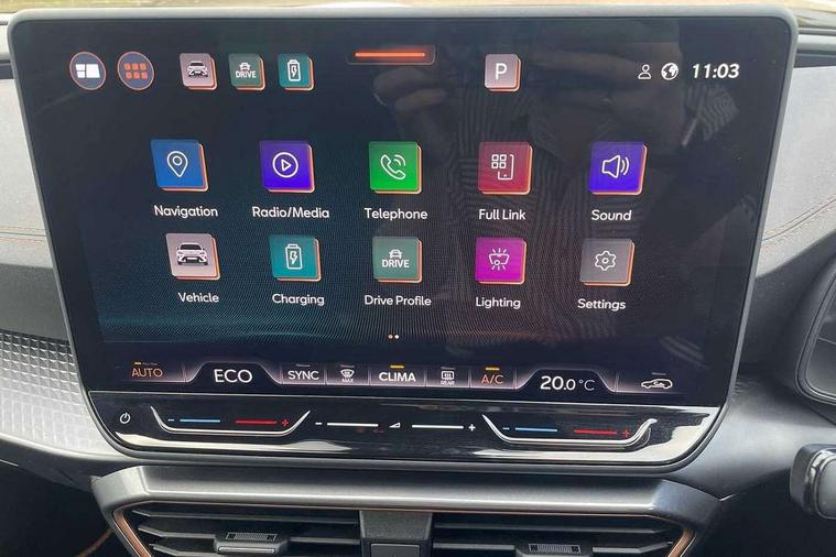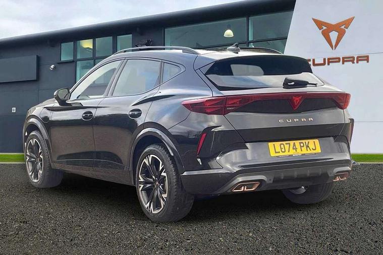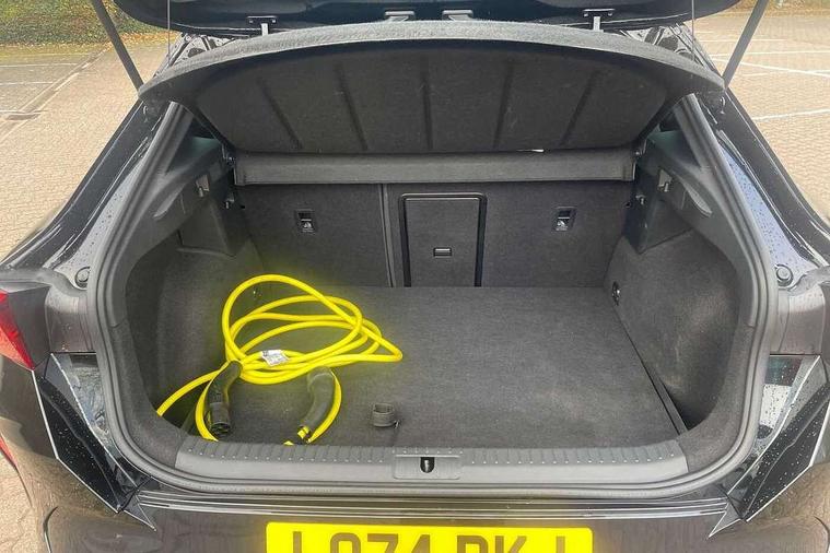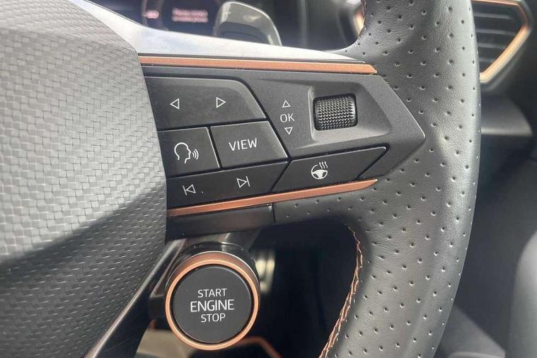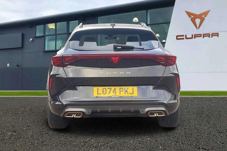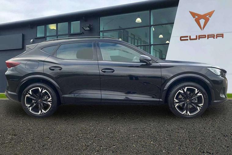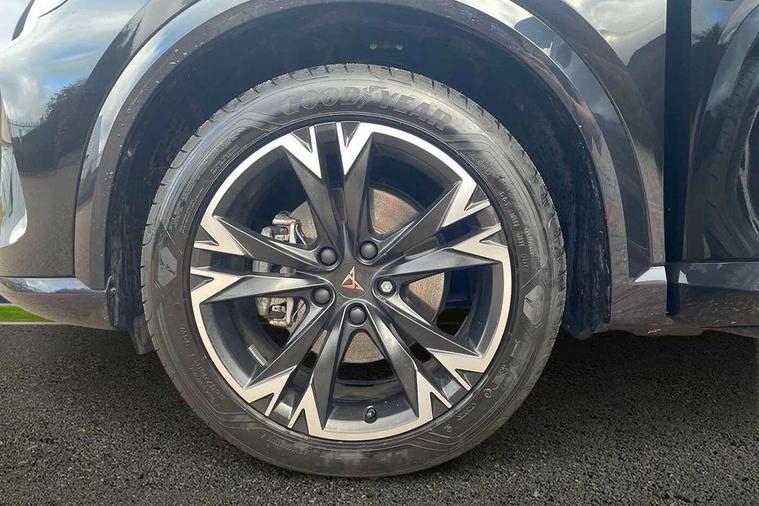 10.25" digital cockpit and configurable dashboard, Adaptive cruise control with follow-to-stop and speed limiter, Advanced driver alert system, Driving profile selection, Dynamic road sign display, Emergency steering support with turn assist, Forward collision warning with automatic braking, Front and rear parking sensors, Full link phone integration, Lane assist, Progressive steering, RPM, trip computer, outside temp gauge, instrument light brightness, low fuel warning light, lights on reminder, gearshift indicator, Service interval indicator, Start/stop system with regenerative braking, Voice control system, Wired Android Auto, Wireless apple carplay, Wireless phone charger, 10 amp mode 2 charging cable, 32 amp mode 3 charging cable, CUPRA sport suspension, Electronic locking differential and dynamic traction support, 2 front and 2 rear USB type C sockets, 7 speakers, Media system with navigation, 12.9" touchscreen display, voice control, DAB, steering wheel mounted controls, Auto dimming rear view mirror, Body colour door handles, Body coloured bumpers, Dark grey wing mirror, Daytime running light with automatic headlight control and coming home feature, Door panel ambient lighting, Dynamic headlight range control, Electric front/rear windows, Electrically adjustable, heated and folding door mirrors, Gloss black roof rails and window surrounds, High beam assist, LED 3rd brake light, LED front fog lamps with cornering function, LED Headlights, LED Taillights with dynamic indicator, Rain sensing wipers, Rear diffuser with copper simulated exhaust pipes, Rear fog lights, Rear side wing doors, Rear wash/wipe, Tinted rear windows, Welcome lights (within exterior mirror housing), 12V socket, 2 front and 2 rear reading lights, 3 seat bench in 2nd row, 60/40 split rear bench seat with armrest and mechanical seat release, Black headlining, Black interior roof lining, Cupra sports pedals, Dust/pollen filter, Front and rear head restraints, Front centre armrest, Heated supersports multifunction leather steering wheel with satellite buttons and gear shift paddles, Height/reach adjust steering wheel, Illuminated aluminium doorsteps, Illuminated interior front door sills, Illuminated sunvisor with mirror, Interior ambient lighting, Isofix, Manually adjustable height and lumbar support for front seats, PVC/Cloth upholstery with copper stitching + Sport seats, Satellite steering wheel, Single front passenger seat, Storage pockets on rear of front seats, Three zone climate control with control panel in rear, 3 point seatbelts on all rear seats, ABS, Brake control system - ESC and brake booster, Child proof door locks, Driver and front passenger airbags with front passenger airbag de-activation, Electronic parking brake, Front and rear disc brakes, Front side curtain airbags, Hill hold control, Public e-call, Seat belt reminder for front and rear seats, Tyre pressure monitoring system, Anti theft alarm system, Central locking system Keyless Go, Locking wheel bolts, Copper and aluminium interior detailing, 18" Sonora machined silver alloy wheels, Breakdown and tool kit,