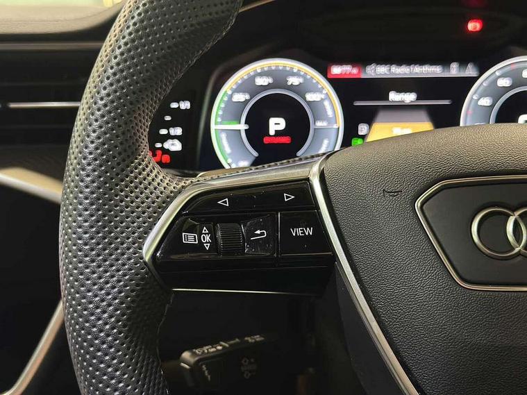 Audi connect safety and service (e-call), Audi connect with Amazon Alexa Integration, Audi drive select, Audi parking system plus - acoustic and visual park assist system for front and rear, Audi virtual cockpit, Automatic start/stop system with coasting functionality, Bluetooth interface, Camera based traffic sign recognition, Electric boot lid release, Lane departure warning system, MMI navigation plus with 10.1" and 8.6" touch screens, Progressive steering, Rear view camera, Service interval indicator, Smartphone interface includes wireless Apple carplay/Android Auto, Voice control system, 3 pin 10 amp domestic charging cable, 52 litre fuel tank, 7.4 kW onboard charger, Compact charging system, Hybrid propulsion system, Industrial connector CEE 32A, 230V, long and straight for the e-tron charging system, Mode 3 charging cable for public charging (AC), Sports suspension, Type 2 socket for AC charging, Audi front music interface, Audi sound system, Auxiliary input socket, DAB Digital radio, USB connection, Audi beam, Electric front/rear windows, Electrically adjustable heated and folding + automatically dimming exterior mirrors with memory function, Frameless auto dimming interior rear view mirror, Front intermittent wipers, Heat insulating darkened glass in side and rear windows, Heat insulating glass in windshield, LED rear lights with dynamic indicators, LED signature front daytime running light, LED third brake light, Matrix LED headlights, Matt black rear diffuser with diffuser strip and tailpipes in chrome, Matt black side air intake grille with inlay in matt aluminium, Omission of output/technology badging, Privacy glass, Radiator grille in anthracite black matt, single frame in chrome and horizontal struts in matt aluminium silver, Rain and light sensors, Rear boot, Rear side wing doors, 4 zone deluxe automatic climate control, 40/20/40 split folding 3 rear seat bench in 3 parts with rear centre armrest, Audi phone box light, Black cloth headlining, Electrically adjustable front seats including seat height, fore/aft position, backrest angle and 4-way lumbar with memory for driver's seat, Front and rear floor mats, Front centre armrest, Front head restraints, Heated front seats, Height/reach adjust steering wheel, Illuminated door sill trims with S logo, Illuminated sun visors with vanity mirrors, Leather gear knob, Rear headrests, Single front passenger seat, Stainless steel pedals and foot rest, Tool kit and car jack, Black styling package plus - A6 Black edition, LED Interior Ambient Lighting Pack - A6, Non smoking pack - A6, S line exterior style pack - A6, 3 point seatbelts on all seats, Airbags - Front side, front and rear including head, Audi pre-sense front, EBD - Electronic brakeforce distribution, Electromechanical parking brake, Electronic Stability Control (ESC) including ABS, ASR and EDL, Extended pedestrian protection measures, ISOFIX child seat mounting for front passenger seat and ISOFIX child seat mounting with Top Tether for outer rear seats, Manual child proof rear door locks, Seatbelt monitoring, Tyre pressure warning light, Warning triangle and first aid kit, Anti theft alarm with tow away protection, Anti-theft wheel bolts and wheel loosening detection, Immobiliser, Keyless Go, Remote central locking, Carbon twill inlays, Tyre repair kit,