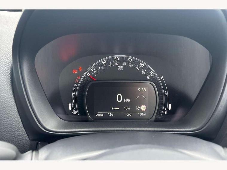4.2" TFT colour screen, Adjustable speed limiter, Analogue speedometer, Bluetooth connectivity, Digital tachograph, Driver attention alert system, eCall emergency call system, Electric power steering, Intersection turn assist, Key reminder warning, Noise reduction kit, Pre collision system with emergency steering assist, Reversing camera with static guide lines, Smart phone integration with Apple car play/Android Auto, Speed limit display, Start and stop, Vehicle Stability Control (VSC), 4 speakers, 9" HD multimedia display touch screen with Toyota smart connect, DAB digital audio broadcast, USB connector, Auto headlights, Auto wipers, Automatic headlights cut-off, Bicycle towing hook, Black contrast roof, Black side protection mouldings, Black wheel arch mouldings, Body colour door handles, Body coloured front bumper, Boot door scuff plate, Eclipse black rear bumper, Electric heated door mirrors, Follow me home headlights, Front fog lights, Front power windows, Gloss black door mirrors, Gloss black upper front grille, Headlight cut-off reminder, LED daytime running lights, LED front light guide, LED High mounted stop lamp, Manual day/night rear view mirror, Manual headlight levelling, Pagoda roof, Power adjustable door mirrors, Power back door, Privacy glass, Projector halogen headlights, Rain sensor, Rear combination lights LED bulb type, Rear side wing doors, Rear windscreen defogger, Rear windscreen wiper, Short antenna, Variable intermittent windscreen wipers, 12v power outlet - front, 2 seat bench in 2nd row, 3 spoke leather steering wheel, 50/50 split folding rear seat, Adhesive roof headlining, Adjustable speed limiter switch on steering wheel, Audio and telephone switches on steering wheel, Auto air conditioning, Black insert on steering wheel, Black roof lining, Boot light, Centre room light, Chrome interior door handles, Chrome surround on air conditioning buttons, Clean air filter, Console box storage in body color, Fabric upholstery, Floor mats, Front and rear cup holders, Front head rest deco art, Front head restraints, Height adjustable driver seat, Intelligent adaptive cruise control switch on steering wheel, ISOFIX child restraint system on rear seats, Lane departure alert switch on steering wheel, Leather gearshift knob, Manual tilt steering wheel, Manually reclining and sliding driver seat, Manually reclining and sliding front passenger seat, Multimedia switches on steering wheel, Pollen filter, Rear door pockets, Rear head restraints, Satin silver insert on gear shift knob, Single compartment glovebox with lights, Single front passenger seat, Soft tonneau cover, Sun visors with mirror on driver and passenger side, Voice recognition switch on steering wheel, Toyota safety sense pack - Aygo X, Anti lock braking system + Electronic brake force distribution, Child safety door lock, Emergency brake light signal (EBS), Hill start assist control (HAC), Passenger airbag on/off switch, Seat belt reminder for front and rear seats, Supplement restraints system (SRS) - 6 airbags, Traction control, Tyre pressure warning system, Immobiliser, Remote power door locks, Black wheel centre caps, Tyre repair kit,