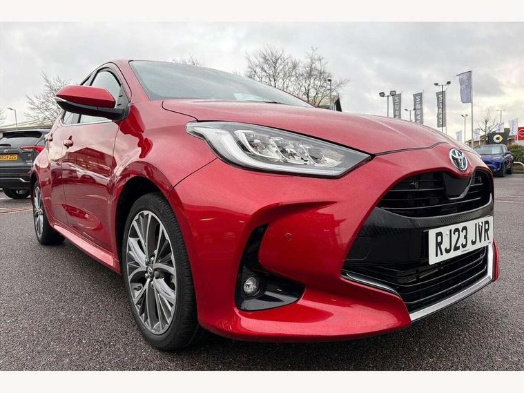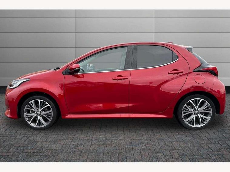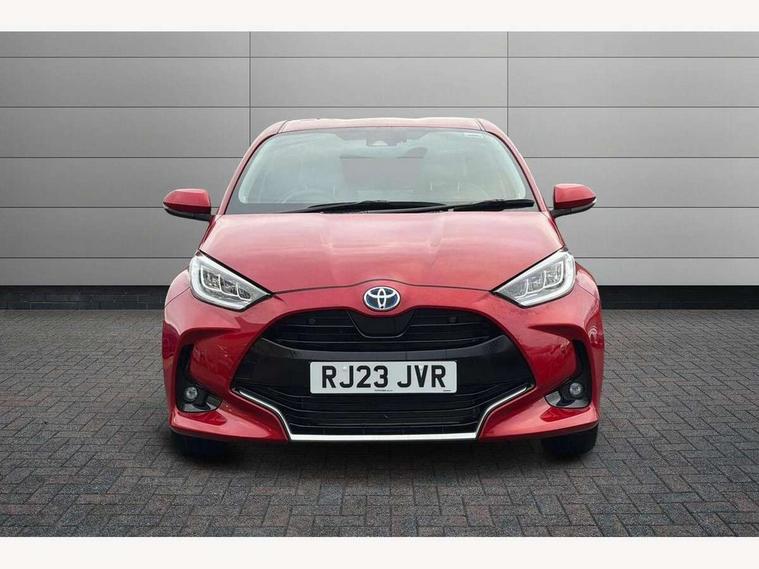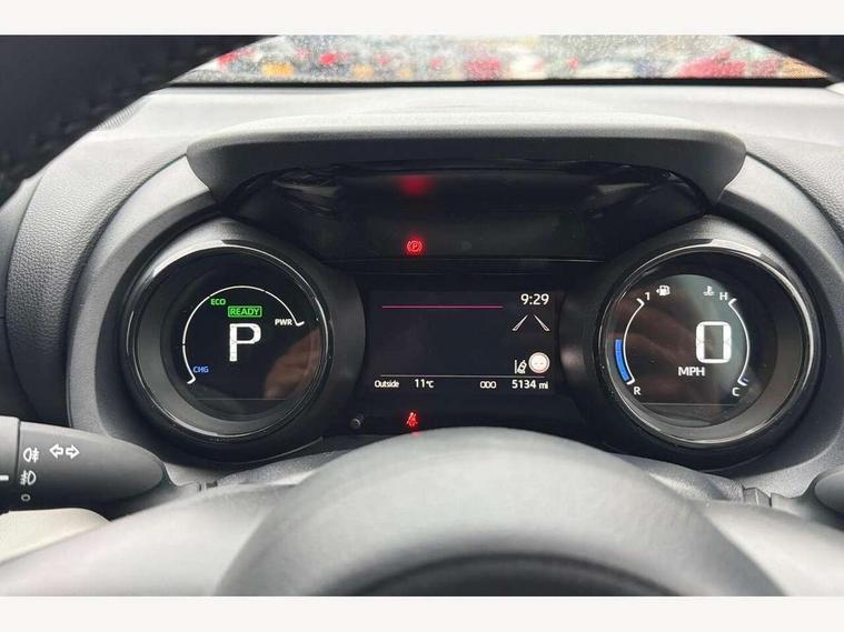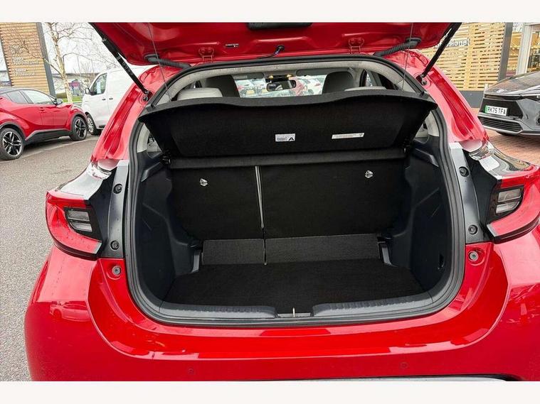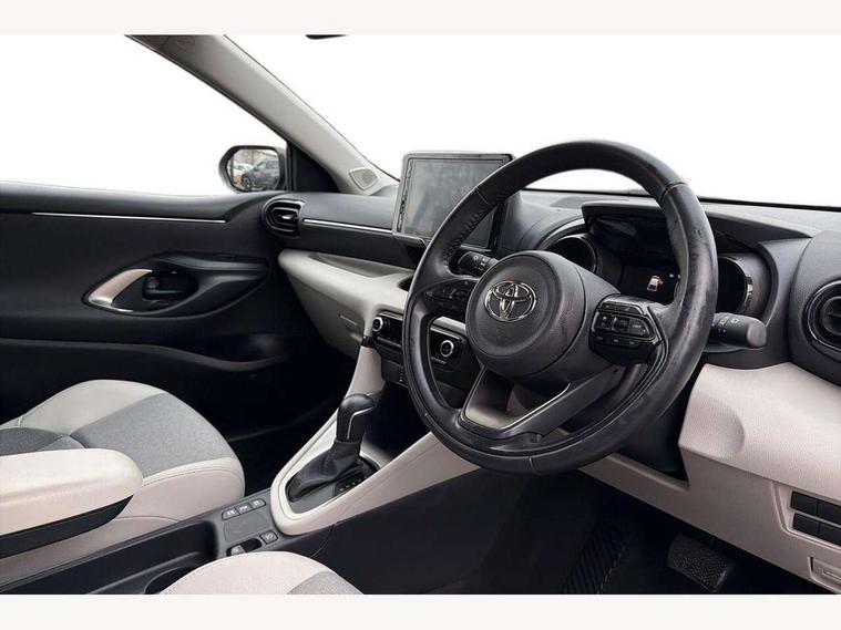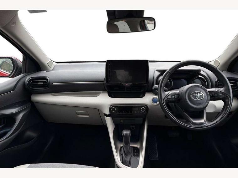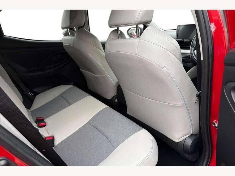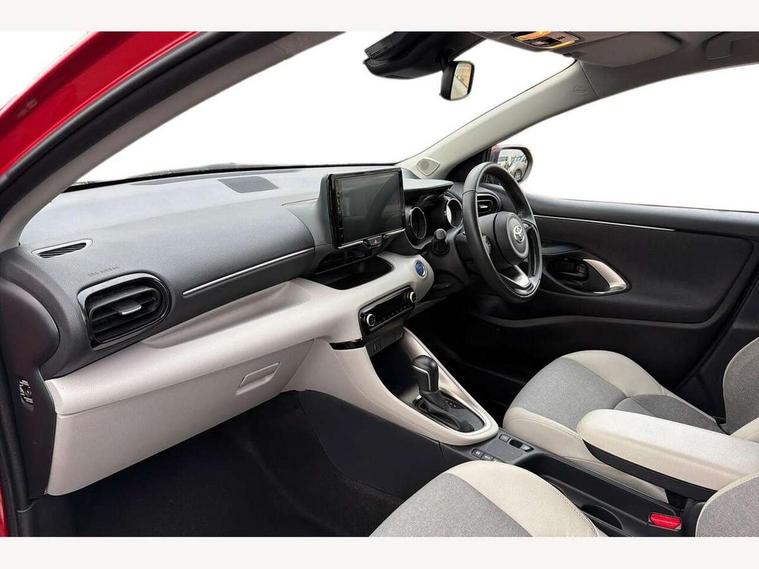 Adaptive cruise control, Adjustable speed limit with speed warning, Blind spot monitoring, Bluetooth connectivity, Colour binocular inspired displays with digital speedometer, E-call, Electric power steering, Hybrid energy display, Multi information display switches on steering wheel, Reversing camera, Smartphone integration with Apple CarPlay and Android auto, Tailgate, Touch 2 navigation system, Voice recognition, Vehicle Stability Control (VSC), 6 speakers, 9" HD multimedia display touch screen with Toyota smart connect, USB connection, Acoustic windscreen glass, Auto windscreen wipers, Automatic headlights, Automatically retractable door mirrors, Body coloured door mirrors, Electric adjustable heated door mirrors, Follow me home headlights, Front auto power windows with anti jam protection, Full LED rear lights, LED daytime running lights, LED front fog lights, LED front light guide, LED Headlights, LED High mounted stop lamp, LED Indicators, LED rear light guide, Manual headlight levelling, Painted chequered front grille, Rain sensor, Rear auto power windows with anti jam protection, Rear privacy glass, Rear side wing doors, Rear spoiler, Rear wiper, Satin lower front grille, Shark fin antenna, Turning signal integrated indicators in door mirrors, Variable front intermittent wipers, 3 adjustable rear headrests, 3 seat bench in 2nd row, 3 spoke leather steering wheel, 60/40 split folding rear seat, Active headrests, Adjustable boot height, Coat hooks in rear grab handles, Cup holders (2 front & door), Data Communication Module (DCM) connected services, Dual zone automatic air conditioning, Fabric seat with partial synthetic leather upholstery, Front armrest, Front sport seats, Glovebox, Grey roof lining, Height adjustable driver's seat, Height adjustable passenger seat, Isofix seat fixing, Leather gearshift, Map pockets on the backs of the front seats, Pollen filter, Shopping bag hooks, Single front passenger seat, Tilt/telescopic steering column, Parking pack - Yaris, 3 point seatbelts on all rear seats, ABS+EBD+Brake assist, Electronic parking brake, Emergency brake light system (EBS), Front passenger airbag on/off switch, Front seatbelt reminder, Hill start assist control (HAC), Rear child proof door locks, Rear seat belt reminder, Supplemental Restraint System (SRS) 8 airbags: Driver & passenger's airbags, dual side curtain airbags, side impact airbags, front centre airbag, Toyota Safety Sense 2, Precollison + Night time Pedestrian & Cyclist Detection, Lane Trace Assist, Auto High Beam, Intelligent ACC & Road Sign Assist, Tyre pressure warning system, 2x Master key, Alarm/immobiliser, Keyless smart entry with push button start, Remote AC via MyT, Remote locking via MyT, Remote powered central double locking doors, Satin chrome interior styling, Soft touch instrument panel, Space saver spare wheel,
