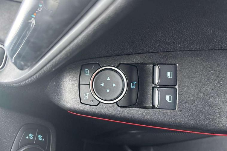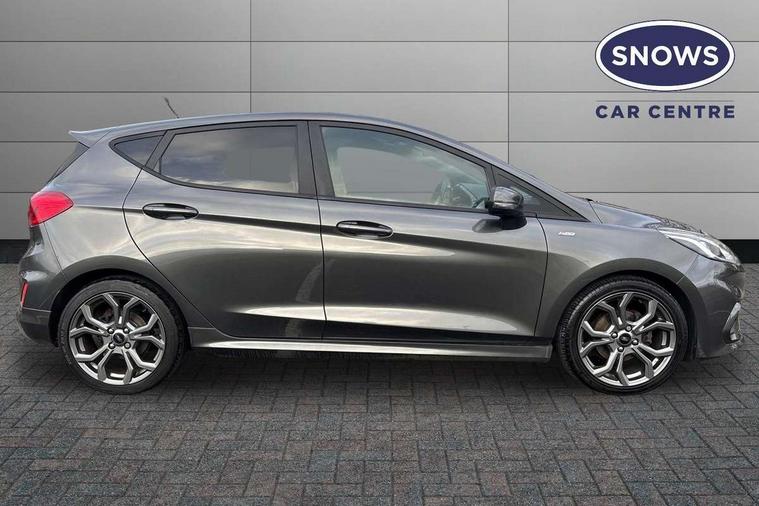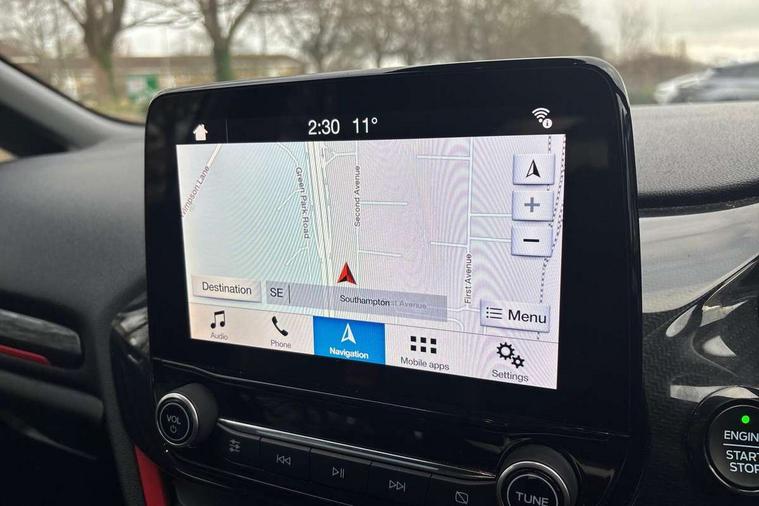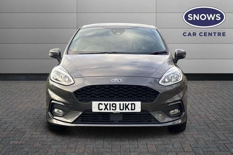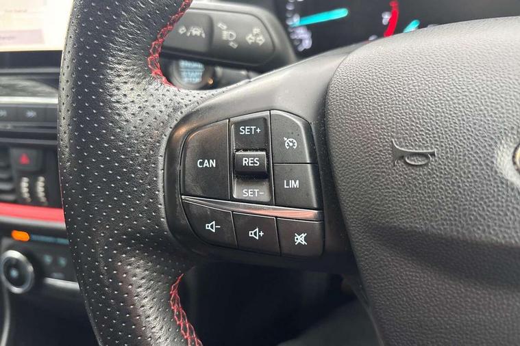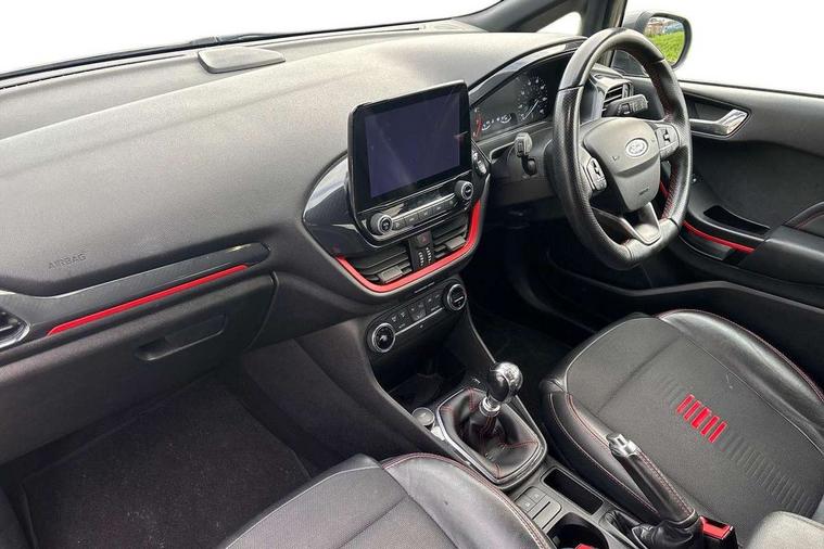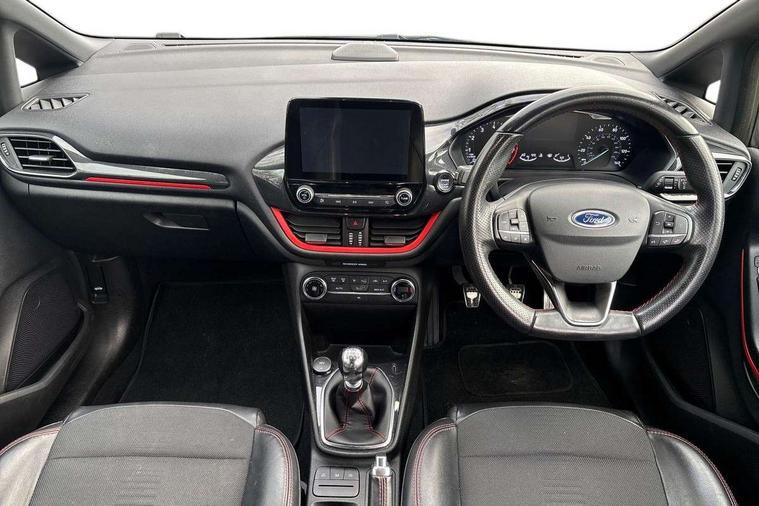 Bluetooth system, Electric power steering, Ford easy fuel, Trip computer, Sports suspension, 2 USB ports, Auxiliary input socket, DAB Digital radio, Steering wheel mounted controls, Auto dimming rear view mirror, Automatic headlights, Body colour bumpers, Body colour door handles, Body colour electric adjustable heated door mirrors with integral indicators, Body colour large rear spoiler, Chrome door handles, Chrome lower window surround, Cornering front fog lights, Electric front windows/one touch facility, LED Night signature to rear lights, LED rear lights, Power foldable door mirrors with puddle lights, Quickclear heated windscreen, Rain sensing wipers and auto dimming rear view mirror, Rear privacy glass, Rear wiper, Rugged body styling kit with active front wing badges, Tinted glass, Unique ST-Line upper grille & full bodystyling kit with ST-Line wing badges, 12V Accessory socket in centre console, 3 spoke flat bottomed leather steering wheel, 60/40 split folding rear seat, Adjustable head restraints, Black headlining, Boot carpet, Centre console with armrest and illuminated cupholders, Chrome inner door handles, Drivers and Passenger lumbar support, EATC - Electronic Auto Temperature control, Footwell illumination, Front and rear velour floor mats, Front map reading lights, Front seat and rear pockets, Illuminated glovebox, Leather gear knob, Leather trimmed handbrake handle, Load area light, Overhead console with sunglasses holder, Pollen filter, Rake/reach adjustable steering wheel, Rear centre head restraint, Sports front seats, Sports pedals, Driver assistance pack - Fiesta/Titanium/Titanium X/Active B+O/Active X/ST-Line X, NCAP Pack - Fiesta, Red pack - Fiesta ST-Line X, 3 point seatbelts on all rear seats, ABS+EBA, Curtain airbags, Driver and passenger airbags, Drivers knee airbag, Electronic stability control with hill start assist, Front passenger airbag deactivation, Front side airbags, Seatbelt warning, Tyre pressure monitoring system, MyKey system, Remote central locking & engine immobiliser, Thatcham Cat.1 alarm,