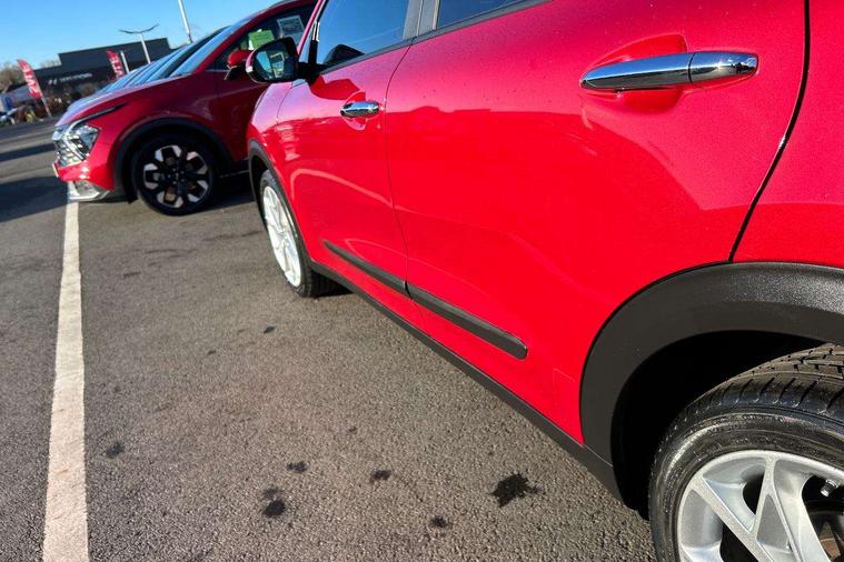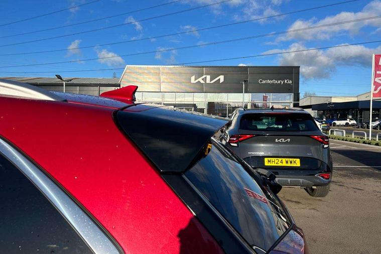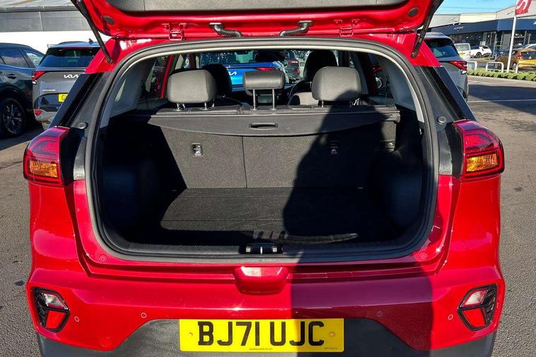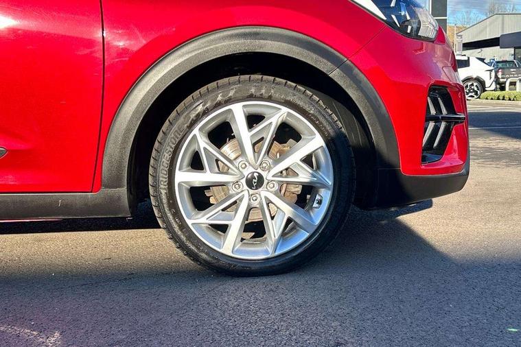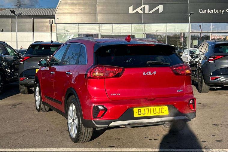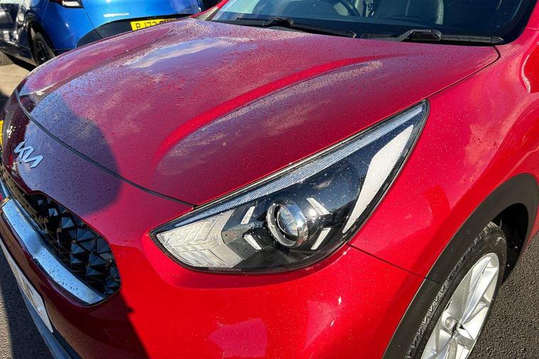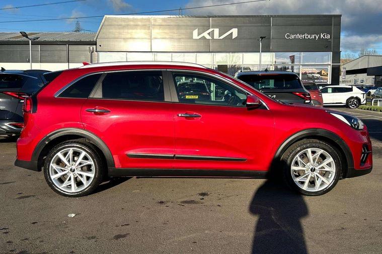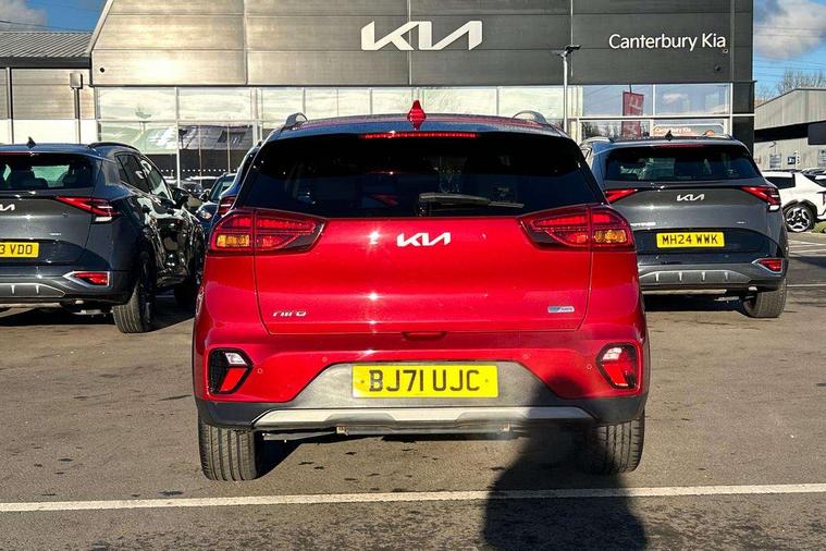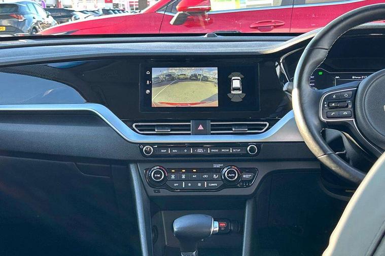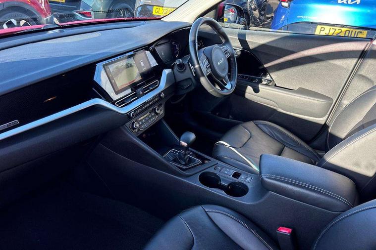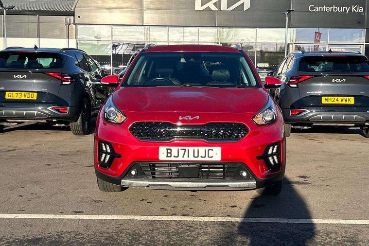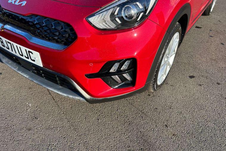 10.25" Touch screen satellite navigation with european mapping and traffic messaging channel, 7" full supervision cluster with TFT colour display, Adaptive smart cruise control function (SCC) with stop and go, Apple car play/Android Auto with voice control, Digital clock, Drive mode selector, Driver attention warning, Emergency call service, Emergency stop signalling system, Forward collision avoidance assist, Front parking sensors, Kia connected services featuring TomTom live, Lane Following Assist (LFA), Lane keep assist, Motor driven power steering, Rear parking sensors, Reversing camera, Speed limiter, Trip computer with distance/fuel consumption/average speed, UVO connect, Wireless Smartphone charger, 'Shark fin' mobile antenna, 6 speakers, Bluetooth with music streaming, DAB Radio with MP3, Steering wheel mounted controls, USB connection located in centre console, USB port, All round electric windows with drivers and front passenger auto up/down function, Auto dimming rear view mirror, Automatic defog system, Automatic headlight control system, Black beltline mouldings, Black side sills, Black wheel arch mouldings, Body colour bumpers, Body coloured/high gloss door mirrors, Chrome door handles, Driver's side wide angle mirror, Electrically folding/adjustable/heated door mirrors with LED indicators, LED daytime running lights, LED fog lights, LED rear combination lights, LED third brake light, Manual headlight levelling, Matt black radiator grille, Privacy glass - Rear windows and tailgate, Projector headlamps, Rain sensing front wipers, Rear side wing doors, Rear spoiler, Rear wiper, Roof rails, Solar glass, Variable front intermittent wipers, Waistline black paint, Welcome and follow-me home light functionality, 3 seat bench in 2nd row, 3 x passenger assist grips, 60/40 split/folding 2nd row of seats, 8 way electric adjustable drivers seat, All-round height adjustable headrests, Aluminium door scuff plates, Bulb type overhead console lamp with sunglasses case, Centre console storage box, Centre room lamp, Cupholders in rear armrest, Driver/passenger sunvisors with illuminated vanity mirrors, Drivers seat power lumbar support, Dual zone automatic air conditioning, Front and rear door storage, Front/rear centre armrests, Headlining in Light grey, Heated front seats, Heated steering wheel, High gloss black lower console trim, High gloss black steering wheel trim, Illuminated ignition key hole, Interior door lock/unlock function, ISOFIX Child seat top tethers and anchor fixings, Leather trimmed door armrests, Leather trimmed steering wheel, Leather trimmed steering wheel and gearshift, Leather upholstery, Luggage area lamp, Luggage area load cover, Luggage net with hooks, Paddle shifts, Passenger seat height adjuster, Satin finish inner door handles, Seatback pocket - driver, Seatback pocket - front passenger, Single front passenger seat, Tilt/telescopic adjustable steering wheel, Under floor storage box, Ventiliation ducts to rear compartment, Towing pack - Niro, 3 point seatbelts on all seats, ABS, Automatic unlocking of doors in case of impact, Drivers knee airbag, Electric parking brake with auto hold function, Electronic stability control, Front passenger airbag cut-off switch, Height adjustable front seatbelts, Hill start assist control (HAC), Manual child lock in rear doors, Traction control, Twin curtain airbags with roll over sensor, Twin front and side airbags, Tyre pressure monitoring system, Alarm system and engine immobiliser, Deadlocks, Locking wheel nuts, Remote central door locking with fold away key, Speed sensitive auto door locking, Visible vehicle identification number, High gloss black centre fascia, High gloss black door inserts, 18" Alloy wheels, Tyre mobility kit,