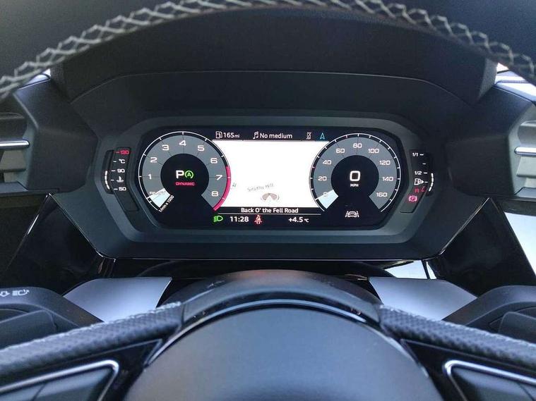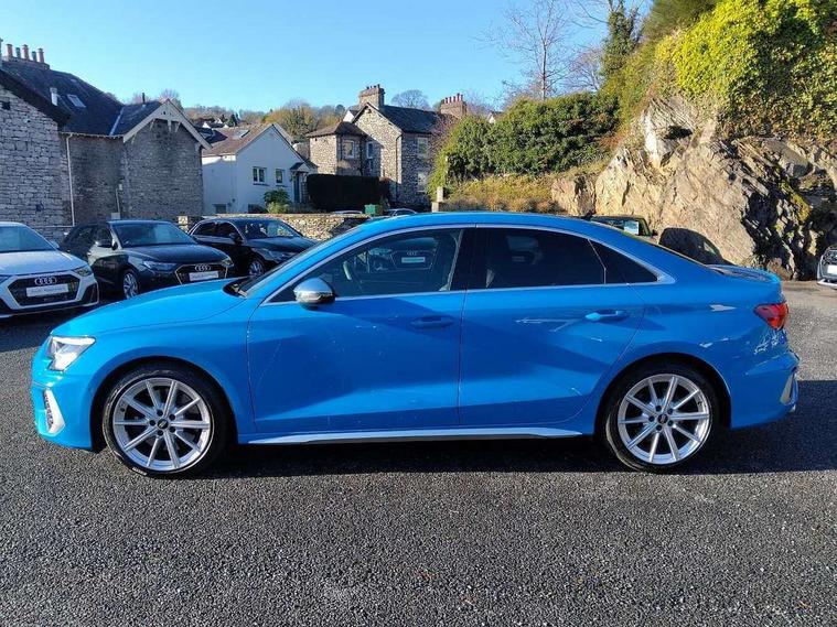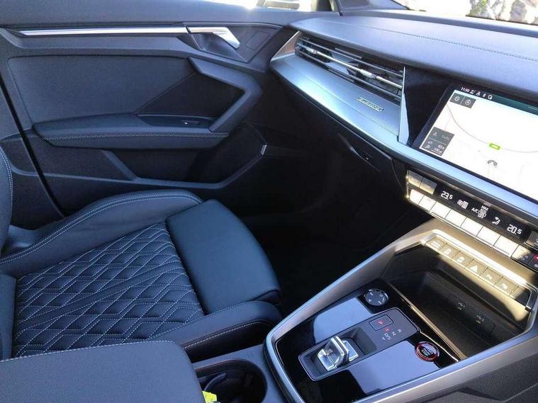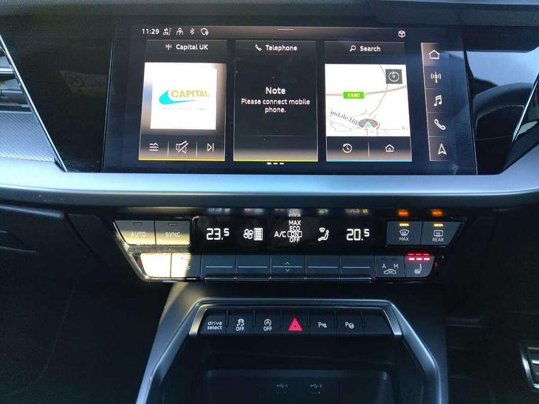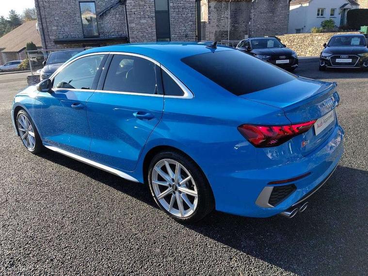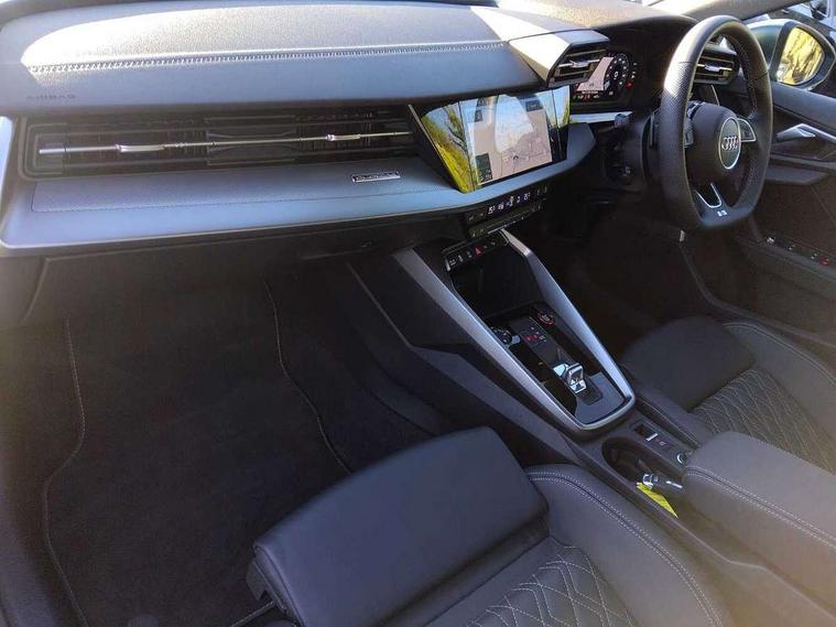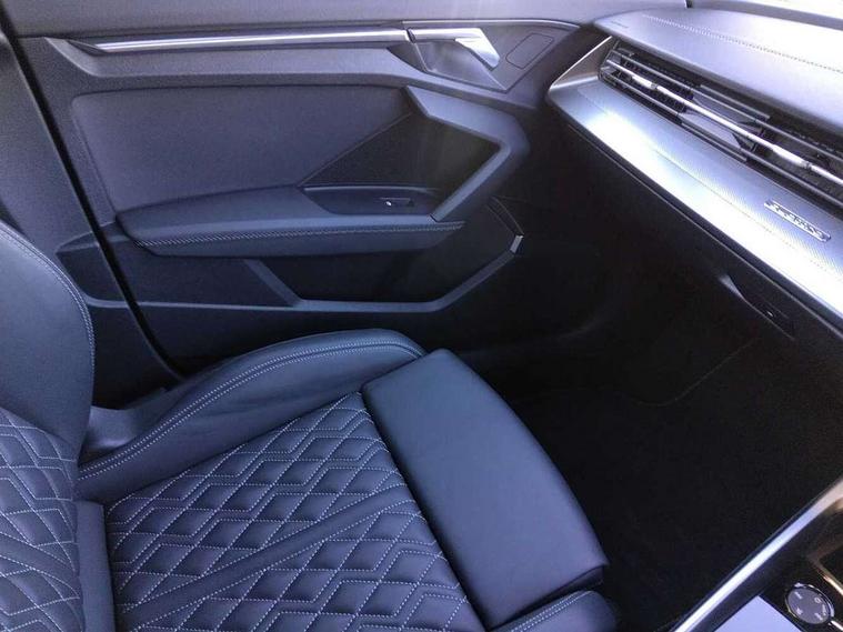 Audi connect emergency call and service, Audi drive select (Auto, Comfort, Dynamic, Efficiency and Individual), Audi smartphone interface, Audi Virtual Cockpit - 10.25" digital and colour instrument cluster, Automatic start/stop system with recuperation, Bluetooth interface, Collision avoidance assistant, Lane departure warning system, MMI Navigation Plus with high resolution 10.1" colour touch screen display, Progressive steering, Service indicator, Voice control system with natural language interaction, Quattro permanent all wheel drive, S sport suspension with spring damper adjustment and lowering by 15mm, 2x USB Type C ports (for charging and data transfer), 6 passive loudspeakers, CD player, DAB Digital radio, 3rd brake light, Acoustic glass windscreen, Audi Beam uses LEDs to project the Audi logo onto the ground as you exit your S3, Auto dimming frameless rear view mirror, Electrically adjustable/heated/folding/auto dimming door mirrors with integrated LED indications + kerb view function for passenger side, Front electric windows, Headlight washers, Illuminated door sills with aluminium inserts at the front with S logo, LED daytime running lights, LED headlights with LED rear lights and dynamic rear indicators, Light and rain sensors, Model and engine designation badges at rear, Privacy glass - dark tinted rear window, rear door and side windows, Rear boot, Rear electric windows, Rear side wing doors, 12V socket and storage compartment in front centre console, 3 seat bench in 2nd row, 40/20/40 split folding rear seat bench with cupholder, Black cloth headlining, Dual zone electronic climate control, Front and rear centre armrest in leather, Front and rear headrests, Front/rear floor mats, Heated front seats, Height and reach adjustable steering wheel, Illuminated vanity mirror, Interior lighting - glove compartment light and right hand side, Luggage compartment floor covering, Single front passenger seat, Stainless steel pedals and front footrest in black, Body styling design pack - S3, LED interior lighting pack - A3 Saloon, Storage pack - A3/S3 Saloon, 3x3 point rear seat belts, Driver and front passenger airbag with passenger airbag deactivation, Electronic Stabilisation Control (ESC) including ABS, ASR and EDL, First aid kit with warning triangle and 2 safety vests, Front side airbags with head airbags and interaction airbag, Hill hold assist, Pre-sense front with pedestrian and cyclist detection, Seatbelt monitoring, Tyre pressure loss indicator, Anti theft alarm, Anti-theft wheel bolts, Electronically operated child locks, Immobiliser, Remote control central locking, Aluminium air vent surrounds, Aluminium trim elements, Dark spectrum aluminium inlays, accent surfaces in the dashboard and centre console in platinum grey silk effect paint finish,