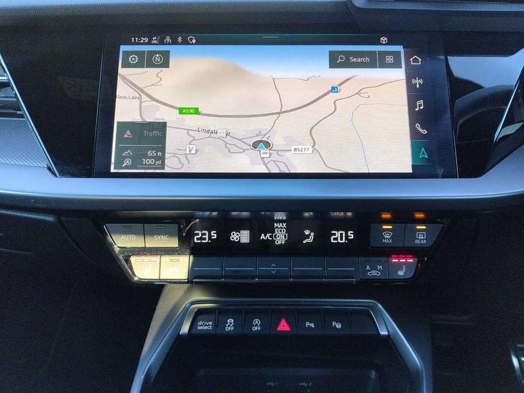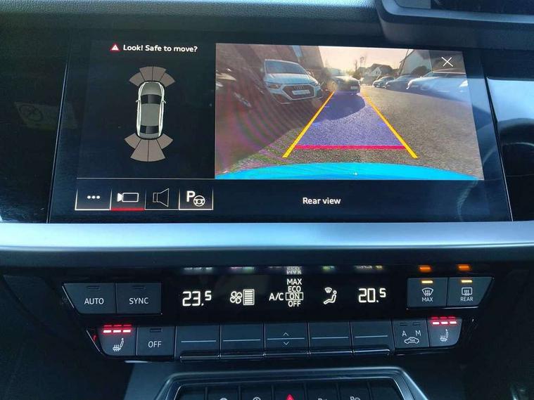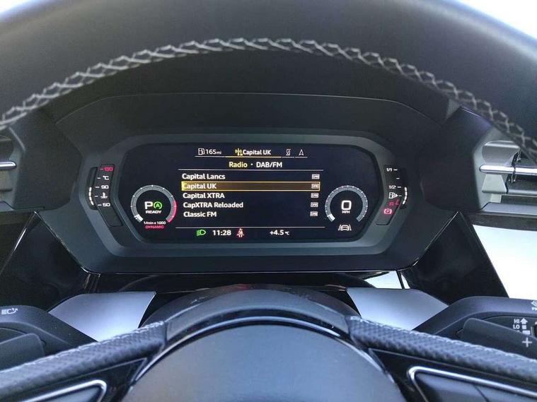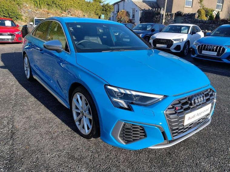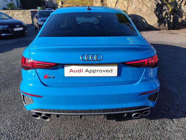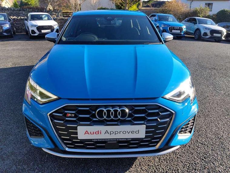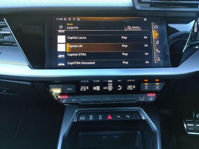 Audi connect emergency call and service, Audi drive select (Auto, Comfort, Dynamic, Efficiency and Individual), Audi smartphone interface, Audi Virtual Cockpit - 10.25" digital and colour instrument cluster, Automatic start/stop system with recuperation, Bluetooth interface, Collision avoidance assistant, Lane departure warning system, MMI Navigation Plus with high resolution 10.1" colour touch screen display, Progressive steering, Service indicator, Voice control system with natural language interaction, Quattro permanent all wheel drive, S sport suspension with spring damper adjustment and lowering by 15mm, 2x USB Type C ports (for charging and data transfer), 6 passive loudspeakers, CD player, DAB Digital radio, 3rd brake light, Acoustic glass windscreen, Audi Beam uses LEDs to project the Audi logo onto the ground as you exit your S3, Auto dimming frameless rear view mirror, Electrically adjustable/heated/folding/auto dimming door mirrors with integrated LED indications + kerb view function for passenger side, Front electric windows, Headlight washers, Illuminated door sills with aluminium inserts at the front with S logo, LED daytime running lights, LED headlights with LED rear lights and dynamic rear indicators, Light and rain sensors, Model and engine designation badges at rear, Privacy glass - dark tinted rear window, rear door and side windows, Rear boot, Rear electric windows, Rear side wing doors, 12V socket and storage compartment in front centre console, 3 seat bench in 2nd row, 40/20/40 split folding rear seat bench with cupholder, Black cloth headlining, Dual zone electronic climate control, Front and rear centre armrest in leather, Front and rear headrests, Front/rear floor mats, Heated front seats, Height and reach adjustable steering wheel, Illuminated vanity mirror, Interior lighting - glove compartment light and right hand side, Luggage compartment floor covering, Single front passenger seat, Stainless steel pedals and front footrest in black, Body styling design pack - S3, LED interior lighting pack - A3 Saloon, Storage pack - A3/S3 Saloon, 3x3 point rear seat belts, Driver and front passenger airbag with passenger airbag deactivation, Electronic Stabilisation Control (ESC) including ABS, ASR and EDL, First aid kit with warning triangle and 2 safety vests, Front side airbags with head airbags and interaction airbag, Hill hold assist, Pre-sense front with pedestrian and cyclist detection, Seatbelt monitoring, Tyre pressure loss indicator, Anti theft alarm, Anti-theft wheel bolts, Electronically operated child locks, Immobiliser, Remote control central locking, Aluminium air vent surrounds, Aluminium trim elements, Dark spectrum aluminium inlays, accent surfaces in the dashboard and centre console in platinum grey silk effect paint finish,
