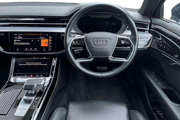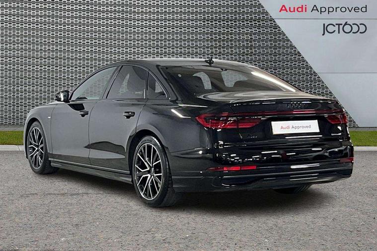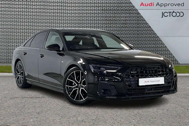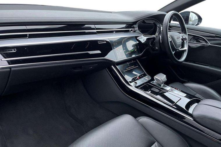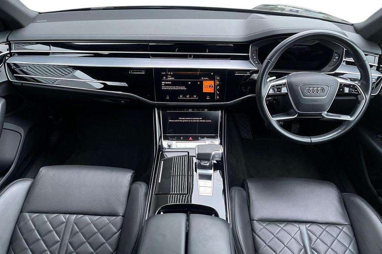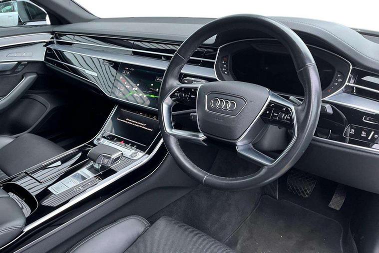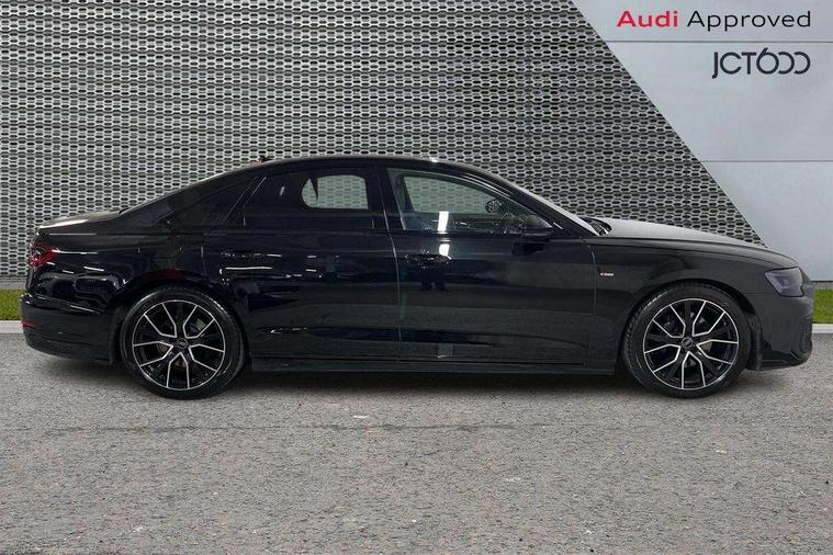'Lights On' Reminder warning buzzer, Adaptive cruise control with cruise assist, emergency assist, efficiency assist, swerve assist, turn assist and speed limiter, Audi connect safety and service (e-call), Audi drive select, Audi parking system plus with front and rear sensors, Audi smartphone interface with app store includes wireless Apple carplay, Android auto and Amazon alexa integration, Audi virtual cockpit, Bluetooth interface, Camera based traffic sign recognition, Convenience key, Electro - mechanical power assisted steering, Head up Display, MMI navigation plus with MMI touch + Twin touch screens with haptic feedback, Operating buttons in black, glass look with haptic feedback including extended aluminium look, Power door closure, Power operated tailgate, Rear view camera, Remote fuel filler release, Service interval indicator, 24 litre AdBlue tank, 48V Mild hybrid technology, 8 speed transmission with hill hold assist, 82 litre fuel tank, Adaptive air suspension, Diesel particulate filter, Quattro all wheel drive with self locking centre differential, Audi music interface, Audi sound system, DAB digital radio module, DVD System, MMI radio plus, USB connection, Acoustic double glazing, All-weather, manoeuvring, position, static cornering, turning and motorway lights with automatic dynamic headlight range control, Audi space frame, Auto dimming rear view mirror, Body colour bumpers, Body colour side protection with aluminium trim strips, Electric front windows, Electric rear windows with isolation switch, Electric sunblinds for rear window and rear door windows, Electrically adjustable heated folding + automatically dimming exterior mirrors with memory function and integrated LED indicators, Front wash/wipe with interval delay, HD matrix LED headlights with dynamic light presentation and dynamic indicators, Headlight cleaning system, Heat insulating darkened glass in side and rear windows, Heat insulating glass windscreen, Heated rear window, Heated windscreen washer jets, High beam assist, LED brake lights, LED daytime running lights, LED third brake light, OLED rear lights with changeable rear light signature, Privacy glass, Rear boot, Rear side wing doors, Side skirts, Welcome/leaving lighting, 12V socket, 2 zone automatic air conditioning, 3 seat rear bench with centre armrest in 2nd row, 4 way electric lumbar support for driver and front passenger, Audi phone box light, Black cloth headlining, Centre console with cupholders, Comfort centre armrest, Door pockets with bottle holder, Driver and front passenger side sunvisors with illuminated vanity mirrors, Dust/pollen filters, Electric front seats with memory function, Front floor mats, Glove compartment cooling, Heated front seats, Height/reach electric steering column with easy exit function, Illuminated door sill trims with aluminium inlays and S diamond emblem, Isofix child seat mounting points on outer rear seats, Leather gearknob, Passenger footwell storage net, Reading lights, Rear floor mats, Rear headrests, Roof mounted sunglasses holder, Single front passenger seat, Stainless steel pedals and footrest, Valcona leather upholstery with front sports seats in diamond quilted with S embossed logo, Black exterior styling pack - A8 Black Edition, Chrome exterior pack - A8, Extended LED Interior multi coloured light pack - A8, 3 point seatbelts on all rear seats, ABS/EBD, Active front headrest system, ASR traction control, Audi pre sense basic, Audi pre sense front, Black brake calipers, Driver/Front Passenger airbags, EDL traction control, Electromechanical parking brake, ESP, Extended pedestrian protection measures, Front and rear disc brakes, Front and rear side airbags with head airbag system, Front passenger airbag deactivation, Rear child proof door locks, Seatbelt reminder + electric contact in buckle + advanced safety equipment, Tyre pressure loss indicator, Warning triangle and first aid kit, Anti theft alarm tow away protection, Anti-theft wheel bolts and wheel loosening detection, Remote central locking, Carbon vector upper inlays, Dark matt brushed aluminium lower inlays,