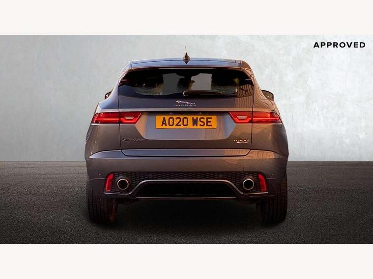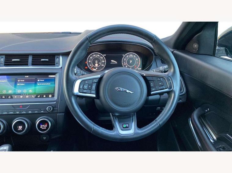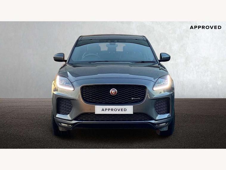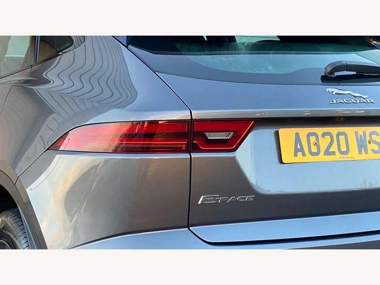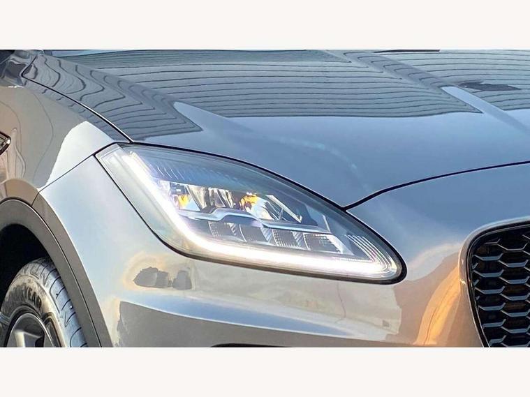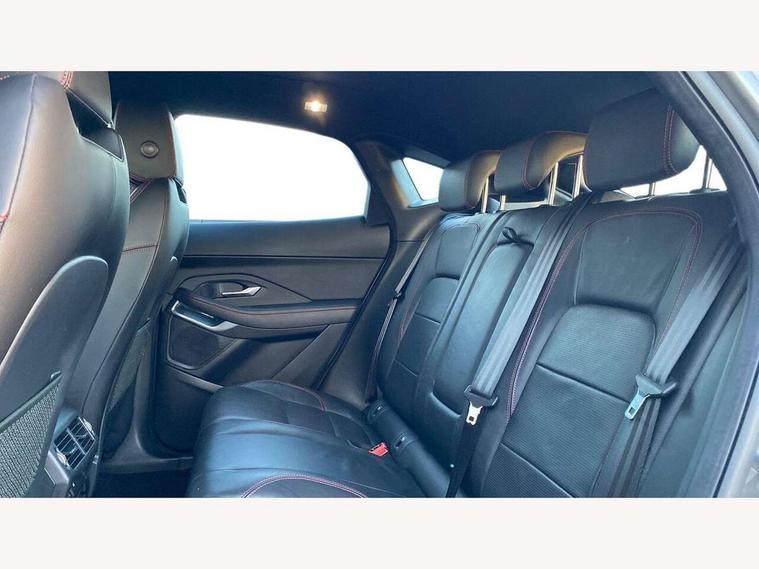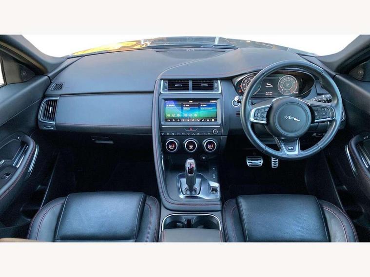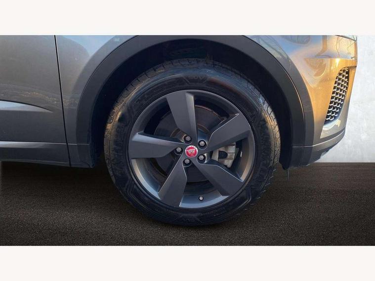 Driver condition monitor, Eco driving style assistant, Electric power assisted steering, InControl remote, InControl Touch navigation pro, Interactive Driver display instrument cluster, Lane keep assist, Outside temperature gauge, Push button starter, Speed proportional steering, Start up sequence with movement in dials and lighting, Traffic sign recognition with adaptive speed limiter, Trip computer, Voice control system, Efficient Driveline, Passive suspension, AM/FM DVD MP3 radio, Bluetooth connectivity including audio streaming, DAB Digital radio, Dynamic volume control, 3 flash lane change indicators, Approach Illumination, Auto dimming rear view mirror, Automatic headlights, Body colour side cladding, Chequered Flag badge in side vents, E Pace badge, Electric front/rear windows with one touch/auto up/down, Fixed panoramic glass sunroof, Front fog lights, Heated front windscreen, Heated rear window with timer, Heated washer jets, Jaguar script and leaper, Metal treadplates with Chequered Flag branding, P200 AWD badge, R Dynamic body colour bumpers, Rain sensor windscreen wipers, Rear fog lights, Tailgate/boot lid spoiler, Twin tailpipes with finishers, 12V power socket in rear, 2nd row 60/40 split/fold, 2nd row air vents, 3 seat bench in 2nd row, 4 Load area hooks, Black gearshift paddles, Bright metal pedals, Centre armrest console, Centre headrest in row 2, Ebony morzine headlining, Elasticated loadspace side strap, Front head restraints, Grained Leather upholstery with front sports seats, ISOFIX on outer rear seats, JaguarDrive selector, LED lighting in overhead console, Loadspace cover, Loadspace lamp, Passive front headrests, R branded leather steering wheel, Storage net in luggage compartment, Sunvisors with illuminated vanity mirrors, Tie down hooks in luggage area, Twin front cupholders, Two zone climate control, Black exterior pack - E-Pace, Connect pro pack - E-Pace, Smartphone pack - E-Pace, 350mm front brakes, 3x3 point rear seatbelts, ABS, All surface progress control (ASPC), Customer configurable autolock, DSC - Dynamic Stability Control, Electronic brake force distribution, Electronic parking brake, Emergency brake assist, Front airbags with passenger seat occupant detector, Front and rear curtain airbags, Front and rear seatbelt reminder, Front side airbags, Hill start assist, Low friction launch, Power child locks, Torque vectoring brake, Tyre pressure monitoring system, Intrusion sensor and alarm, Keyless entry, Locking wheel nuts,