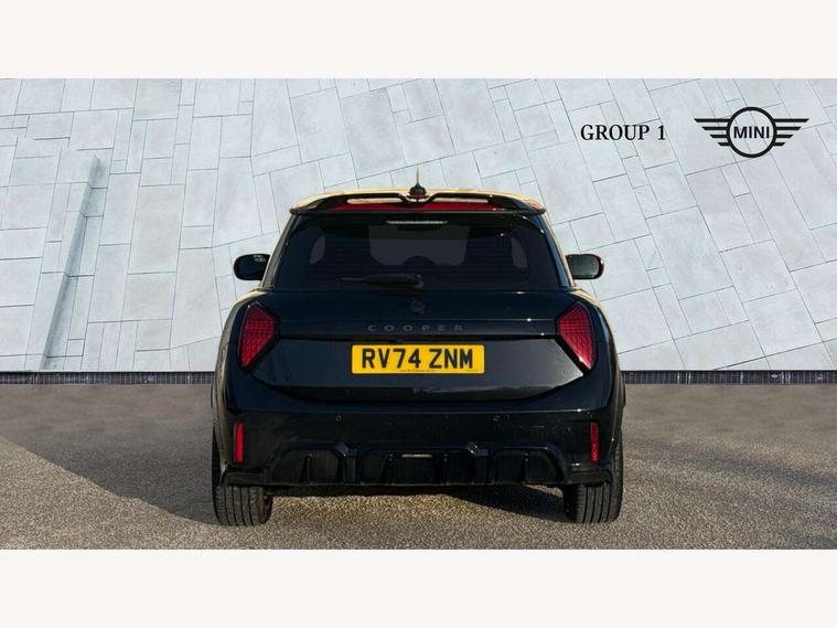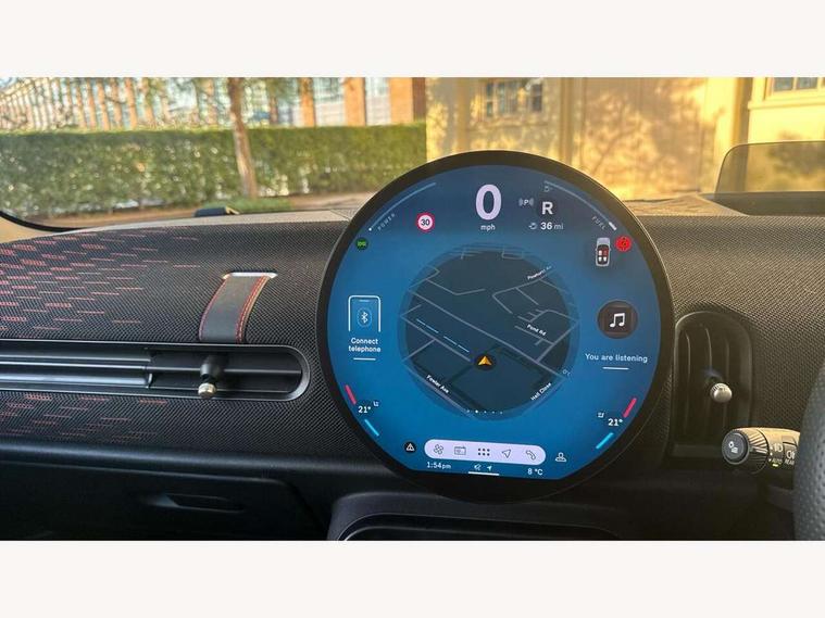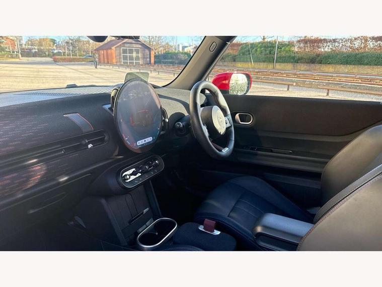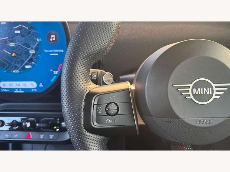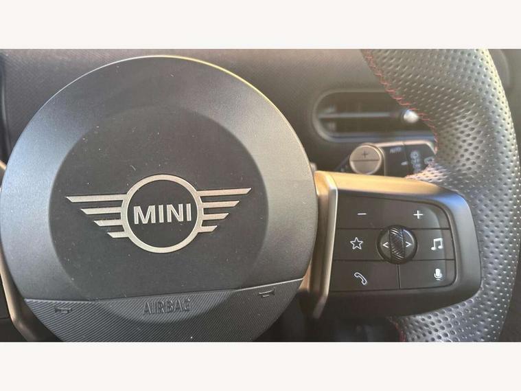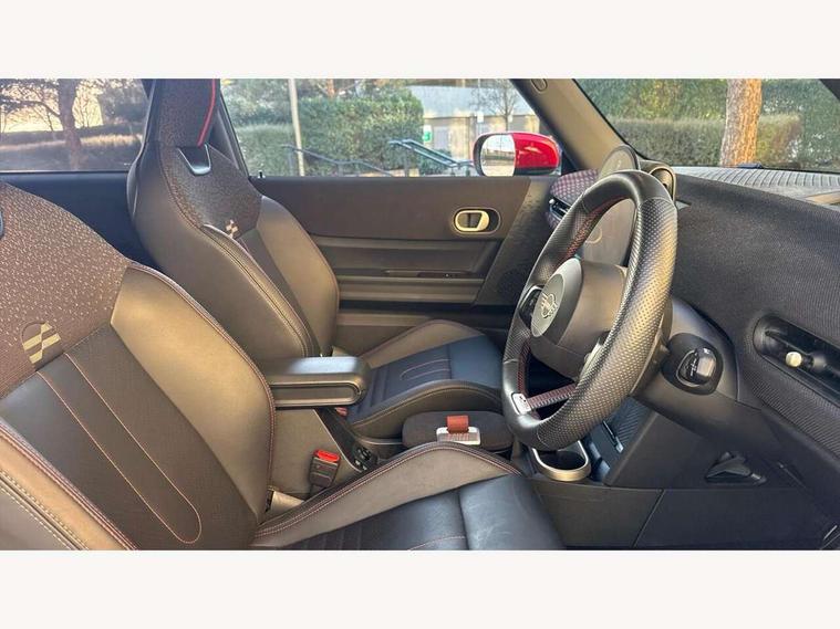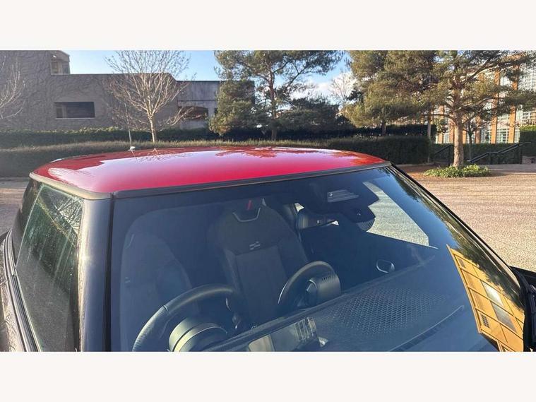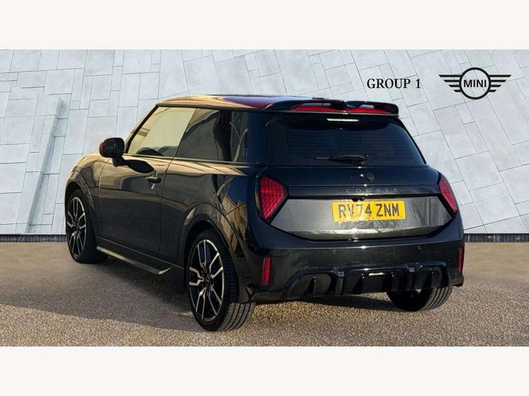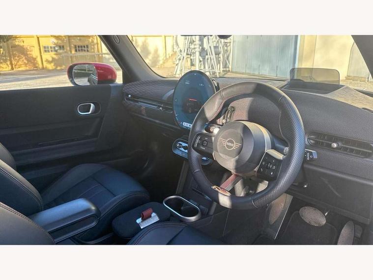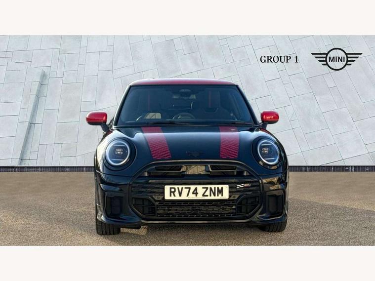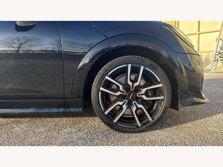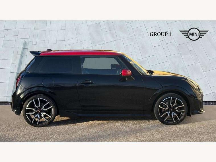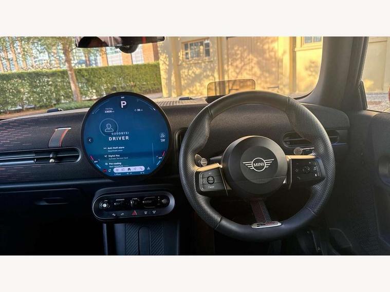 Central toggle bar, Circular OLED Screen, Compatible mobile phone bluetooth with audio streaming, Cruise control, Digital instrument cluster, Electro-mechanical speed dependant steering assistance, Emergency call service, MINI Experience Modes, Mini navigation system, On board computer, Service interval indicator, 7 speed steptronic sport transmission with double clutch, Adaptive suspension, DAB Digital radio, Personal eSim, Auto headlights, Electric adjustable heated door mirrors, Electric front windows, Front and rear apron, Heated rear window, Heated windscreen washer jets, High gloss black wheel arches, High gloss hexagonal patterned grille surround, JCW body kit, LED daytime running lights, LED Headlights, LED indicator lights, LED rear lights, Rain sensor window wipers, Rear fog lights, Rear roof spoiler with airblades, Rear window wiper, 2 seat bench in second row, 2 zone automatic air conditioning, 60/40 rear seat bench, Ambient lighting, Black lower band in high gloss, Cupholders, Dark headliner, Floor mats, Front and rear head restraints, Front compact armrest, Heated steering wheel, Height adjustable passenger seat, Lidded storage box in Black/Red knit, Luggage compartment lighting, Partially perforated vescin steering wheel with red accent, black/red decorative strap, Single front passenger seat, Steering wheel paddle shift, Sunvisors with vanity mirrors, Vescin/Cord upholstery, Driving assistant pack - Cooper Hatchback, Park assistant pack - Cooper Hatchback, 3 point seatbelts on all four seats, 6 Airbags - front, side, head and seat belt tensioners, Acoustic pedestrian protection, Anti-lock braking system (ABS), Brake caliper in Black with JCW badge, DSC - Dynamic Stability Control, Electronic parking brake, Front and rear disc brakes, Front ISOFIX (iSize), Front passenger airbag deactivation, JCW Sport Brakes, Traction control, Tyre pressure monitoring system, Alarm, Immobiliser, Remote central locking, Black/Red decorative dash strap, JCW Black/Red dashboard knit, Tyre repair kit,
