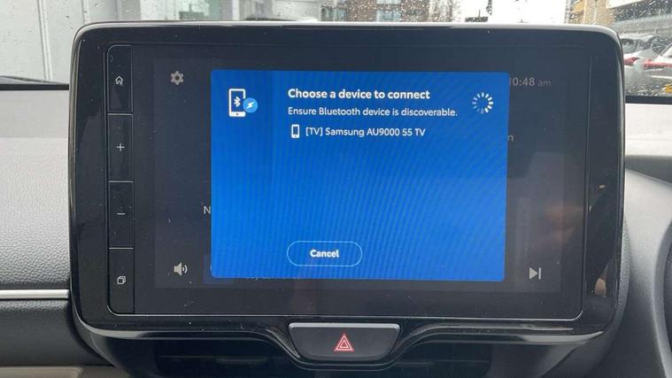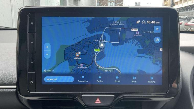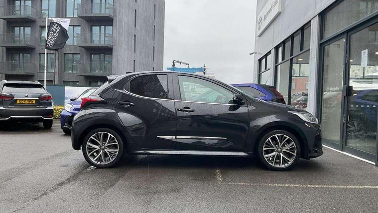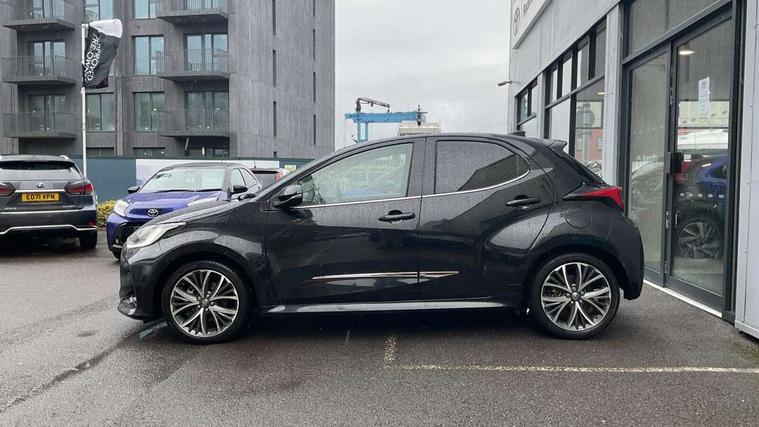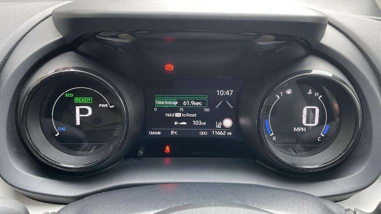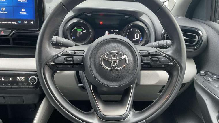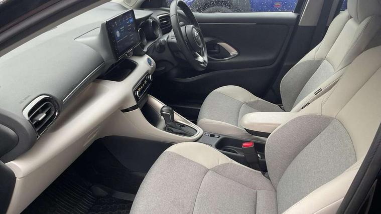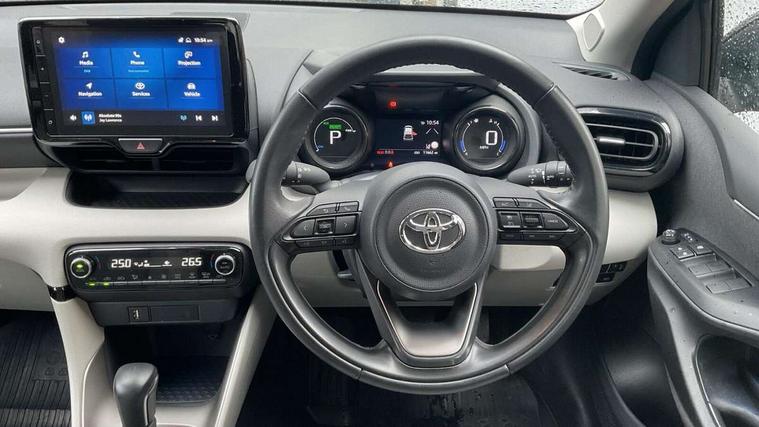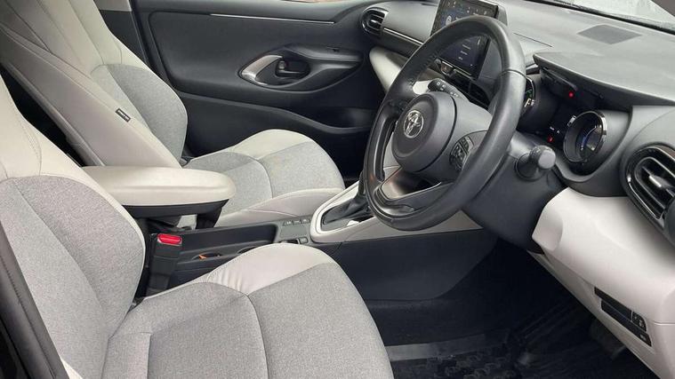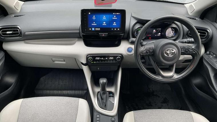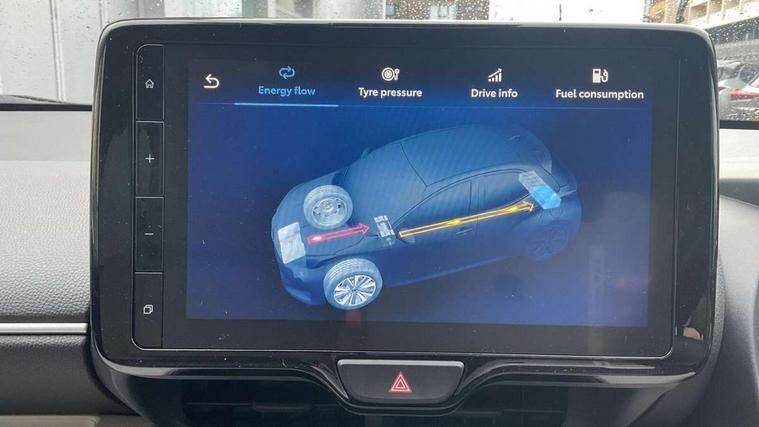 Adaptive cruise control, Adjustable speed limit with speed warning, Blind spot monitoring, Bluetooth connectivity, Colour binocular inspired displays with digital speedometer, E-call, Electric power steering, Hybrid energy display, Multi information display switches on steering wheel, Reversing camera, Smartphone integration with Apple CarPlay and Android auto, Tailgate, Touch 2 navigation system, Voice recognition, Vehicle Stability Control (VSC), 6 speakers, 9" HD multimedia display touch screen with Toyota smart connect, USB connection, Acoustic windscreen glass, Auto windscreen wipers, Automatic headlights, Automatically retractable door mirrors, Body coloured door mirrors, Electric adjustable heated door mirrors, Follow me home headlights, Front auto power windows with anti jam protection, Full LED rear lights, LED daytime running lights, LED front fog lights, LED front light guide, LED Headlights, LED High mounted stop lamp, LED Indicators, LED rear light guide, Manual headlight levelling, Painted chequered front grille, Rain sensor, Rear auto power windows with anti jam protection, Rear privacy glass, Rear side wing doors, Rear spoiler, Rear wiper, Satin lower front grille, Shark fin antenna, Turning signal integrated indicators in door mirrors, Variable front intermittent wipers, 3 adjustable rear headrests, 3 seat bench in 2nd row, 3 spoke leather steering wheel, 60/40 split folding rear seat, Active headrests, Adjustable boot height, Coat hooks in rear grab handles, Cup holders (2 front & door), Data Communication Module (DCM) connected services, Dual zone automatic air conditioning, Fabric seat with partial synthetic leather upholstery, Front armrest, Front sport seats, Glovebox, Grey roof lining, Height adjustable driver's seat, Height adjustable passenger seat, Isofix seat fixing, Leather gearshift, Map pockets on the backs of the front seats, Pollen filter, Shopping bag hooks, Single front passenger seat, Tilt/telescopic steering column, Parking pack - Yaris, 3 point seatbelts on all rear seats, ABS+EBD+Brake assist, Electronic parking brake, Emergency brake light system (EBS), Front passenger airbag on/off switch, Front seatbelt reminder, Hill start assist control (HAC), Rear child proof door locks, Rear seat belt reminder, Supplemental Restraint System (SRS) 8 airbags: Driver & passenger's airbags, dual side curtain airbags, side impact airbags, front centre airbag, Toyota Safety Sense 2, Precollison + Night time Pedestrian & Cyclist Detection, Lane Trace Assist, Auto High Beam, Intelligent ACC & Road Sign Assist, Tyre pressure warning system, 2x Master key, Alarm/immobiliser, Keyless smart entry with push button start, Remote AC via MyT, Remote locking via MyT, Remote powered central double locking doors, Satin chrome interior styling, Soft touch instrument panel, Space saver spare wheel,