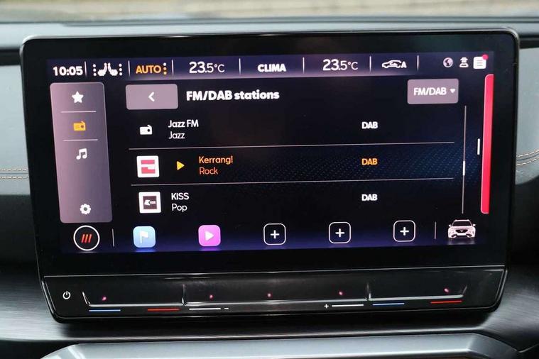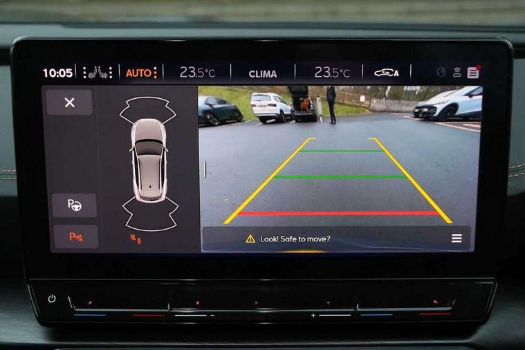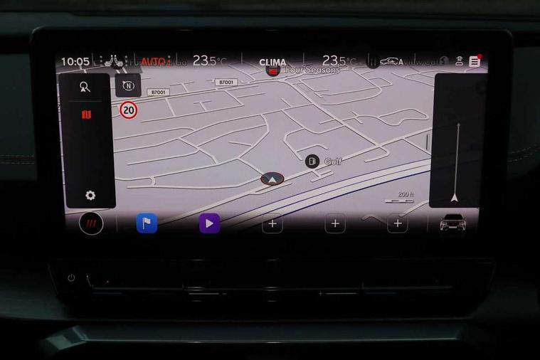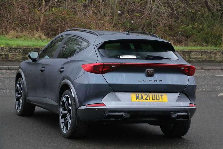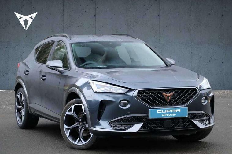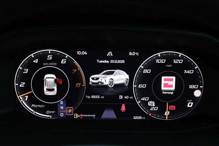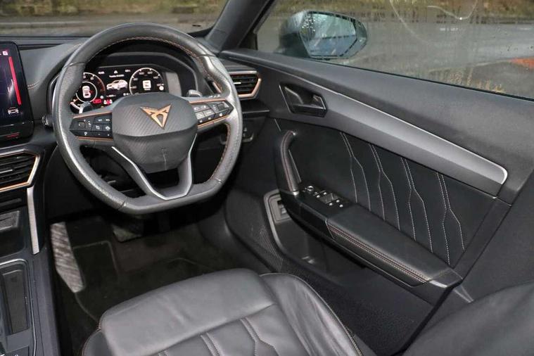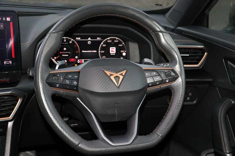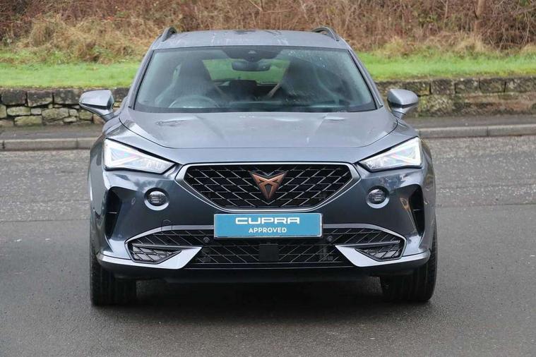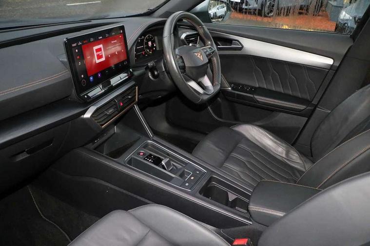 Digital cockpit and configurable dashboard, Driver alert system, Driving profile selection, Forward collision warning with automatic braking, Park assist (inc front/rear parking sensors), PAS, Predictive adaptive cruise control with speed limiter, Rear view camera, RPM, trip computer, outside temp gauge, instrument light brightness, low fuel warning light, lights on reminder, gearshift indicator, Service interval indicator, Start/stop system with regenerative braking, Wireless apple carplay, Wireless phone charger, Electronic locking differential and dynamic traction support, Standard suspension, 2 front and 2 rear USB type C sockets, Auxiliary input socket, DAB radio, Auto dimming rear view mirror, Body colour door handles, Body coloured bumpers, Dark grey wing mirror, Daytime running light with automatic headlight control and coming home feature, Dynamic headlight range control, Electric front/rear windows, Electrically adjustable, heated and folding door mirrors, Front fog lamps with cornering function, Gloss black roof rails and window surrounds, LED Headlights, LED Taillights with dynamic indicator, Rain sensing wipers, Rear diffuser with black simulated exhaust pipes, Rear wash/wipe, Tinted rear windows, Welcome lights, 12v power supply in centre console, 12v socket in loadspace, 2 front and 2 rear reading lights, 230V socket, 60/40 split rear bench seat with armrest and mechanical seat release, Black headlining, Dust/pollen filter, Front and rear head restraints, Front centre armrest, Heated steering wheel, Height/reach adjust steering wheel, Illuminated interior front door sills, Illuminated sunvisor with mirror, Interior ambient lighting, Isofix, Leather multi function steering wheel with gear shift paddles, Luggage tie-down hooks, Three zone climate control, Three zone climate control with control panel in rear, Variable luggage/load compartment floor, Wraparound lighting, Genuine Nappa leather Pack - Cupra, Navigation system pack - Formentor, 3 point seatbelts on all rear seats, ABS, Brake control system - ESC and brake booster, Child proof door locks, Driver and front passenger airbags with front passenger airbag de-activation, Electronic parking brake, Front and rear disc brakes, Front side curtain airbags, Hill hold control, Seat belt reminder for front and rear seats, Tyre pressure monitoring system, Anti theft alarm system, Keyless entry and start system (KESSY), Locking wheel bolts, Copper and aluminium interior detailing, 19" Exclusive machined sport matt black and silver alloy wheels with 94W tyres,