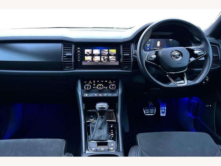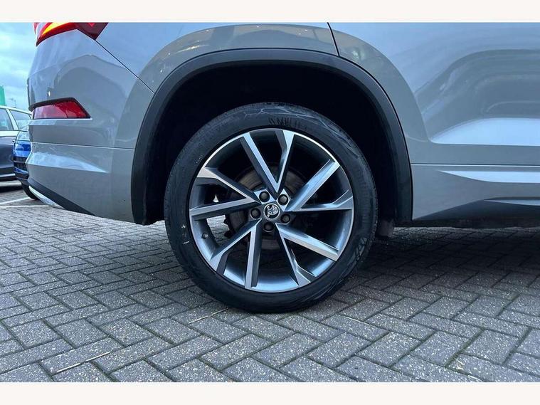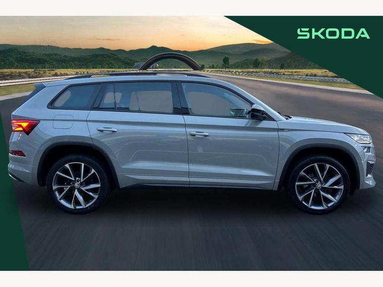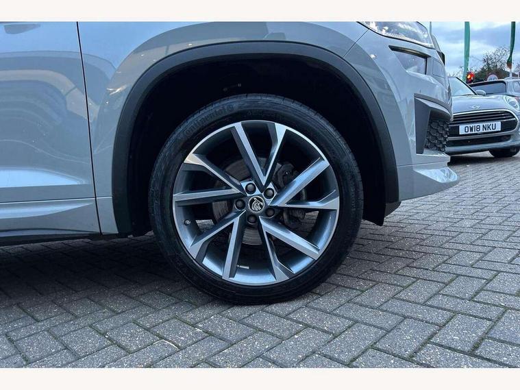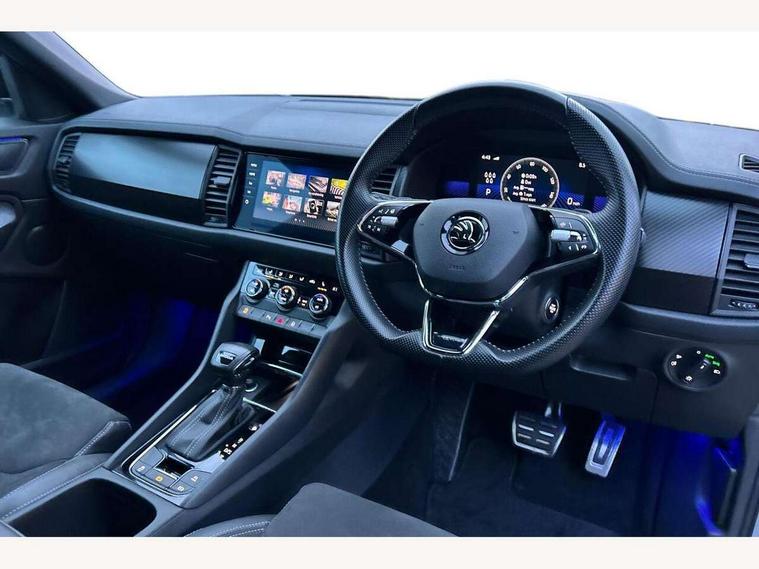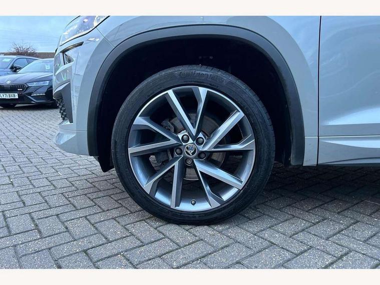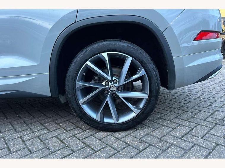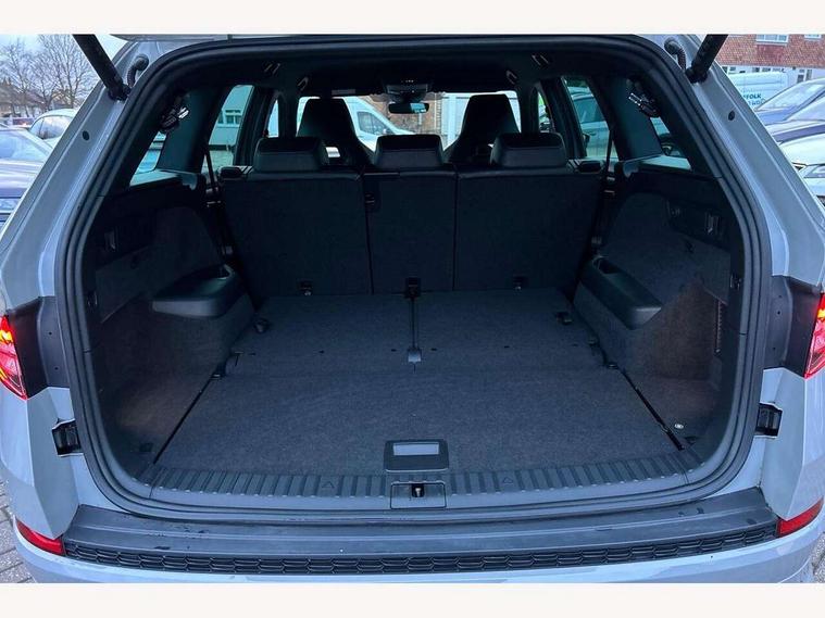 Bluetooth system, Columbus satellite navigation with 9.2" touchscreen, integrated Wi-Fi, web radio, Digital voice enhancement, e call+, ECO Stop/start function, Exterior temperature indicator, Progressive steering, Rear view camera, Smartlink wireless for apple carplay and wired for android auto, Speed limiter, Tailgate unlocking from outside, USB C Port x 2 in front centre console, Wireless charging, 8 Speakers, DAB Digital radio, Aero front windscreen wipers with intermittent function, Aero rear window wiper, Auto dimming rear view mirror, Black roof rails, Black sports styling including front grille and window surrounds, Black wheel arch surrounds, Body colour bumpers, Body colour door handles, Electric adjustable/heated/folding door mirrors, driver side auto dimming with boarding sports and memory function, Electric front and rear windows, Extended rear spoiler with finlets in gloss black, Front fog lights, Full LED matrix headlights with AFS (adaptive front light system), cornering function and AWL (all weather lighting system), Gloss black door mirrors, Headlight washers, Heated rear window, Invisible tailpipe, LED daytime running lights, LED rear fog light, LED third brake light in rear spoiler, Light assistant (coming/leaving home/tunnel light), Off-road style lower front bumper element, Privacy glass, Rain and light sensors, Rear diffuser, Rear LED lights (high functionality) with welcome effect and dynamic indicators, Rear side wing doors, Safety reflectors on front and rear doors, Sportline badge on front fender, Sports front and rear bumpers including lower rear chrome strip, Tailgate lettering in Black, Window control switches with black trim, 12V socket in boot, 2 rails with 2 hooks, 2 seat bench in 3rd row, 3 seat bench in 2nd row, 4 foldable roof handles with rear coat hooks, 60:40 foldable rear seat with sliding adjustment and backrest angle adjustment, Aluminium pedals, Black roof headlining, Bottle holders in door panel in the 1.5 litre front and 1 litre rear, Cargo storage compartments, Chrome headlight control button, Chrome interior door handles, Coat hooks on B pillar, Covered storage compartment on driver side, Decorative door sill covers, Front centre armrest with storage compartment, cup holder and 12V socket, Front courtesy lights, Gear shift lever with chrome frame and black gloss insert, Grey stitching in front and rear armrests and door armrests + door inserts, Height adjustable front headrests, Illuminated and cooled glovebox, Illuminated luggage compartment, Isofix child seat fittings in outer rear seats with top tether, Manually adjustable steering column, Microsuede door panels, Net programme in boot (1x horizontal Net, 2x vertical Nets), Overhead glasses storage compartment, Pollen filter, Rear centre armrest with cupholders, Single front passenger seat, Sliding trunk cover, Small Bags on the inner sides of the front backrests, Sports seats, Sunvisors with illuminated vanity mirrors, Three rear height adjustable headrests, Ticket holder on A Pillar, Umbrella in door panel, Variable boot floor, LED Interior light pack - Kodiaq, Auto door release and activation of warning lights in the event of an accident, Child locks on rear doors, Driver and front passenger airbag with knee airbag and front passenger airbag deactivation, Electronic parking brake with hill start assist, Emergency rear braking signal, ESC (incl. ABS+MSR+ASR+EDS+HBA+DSR+RBS+MKB), Front assist with autonomous emergency braking, Front side airbags with curtain airbags, Fuel cut off safety device, Height adjustable front 3 point seatbelts + pretensioners, Hill hold control, Rear disc brakes, Safety vest holder in door, Seat belt reminder for all seats, Three point rear seat belts, Two tone horn, Tyre pressure monitor, Alarm with interior monitoring and tilt sensor with safe function, Anti-theft wheel bolts, Immobiliser, Keyless entry and start system (KESSY), Remote central locking with 2 keys, Black air vent surround, Carbon finish dashboard and door inserts, Grey stitching in dashboard, 20" Vega Anthracite alloy wheels, Temporary spare wheel (space saver),