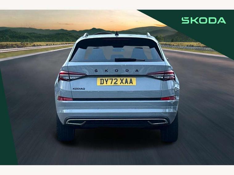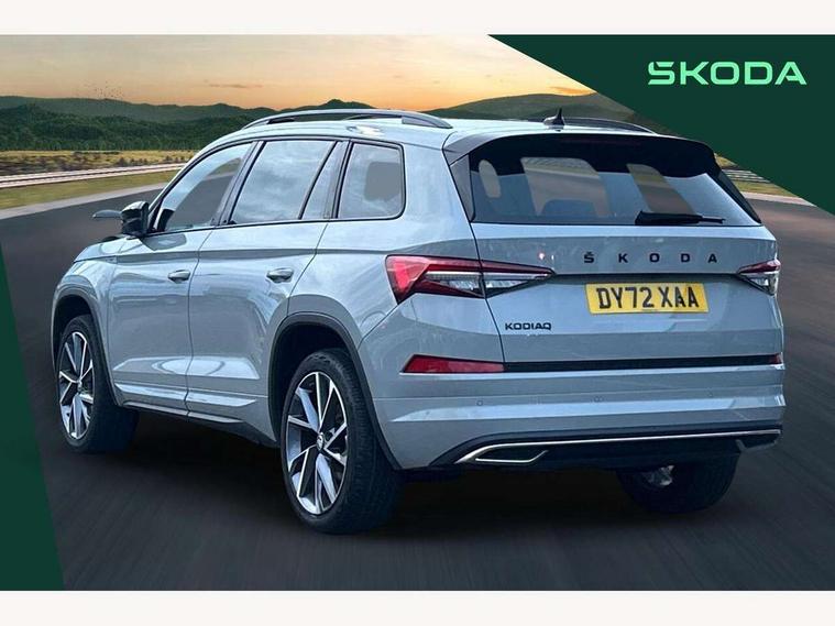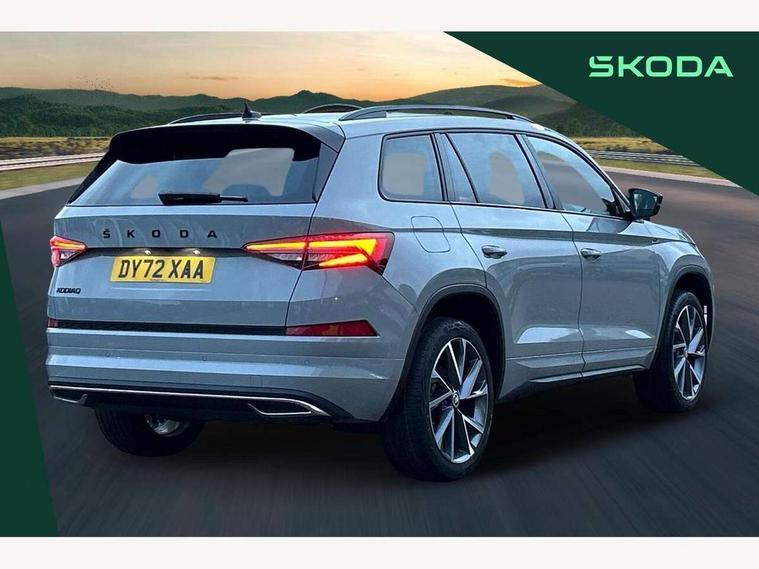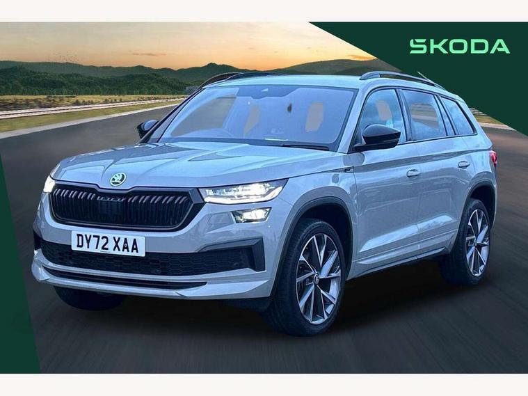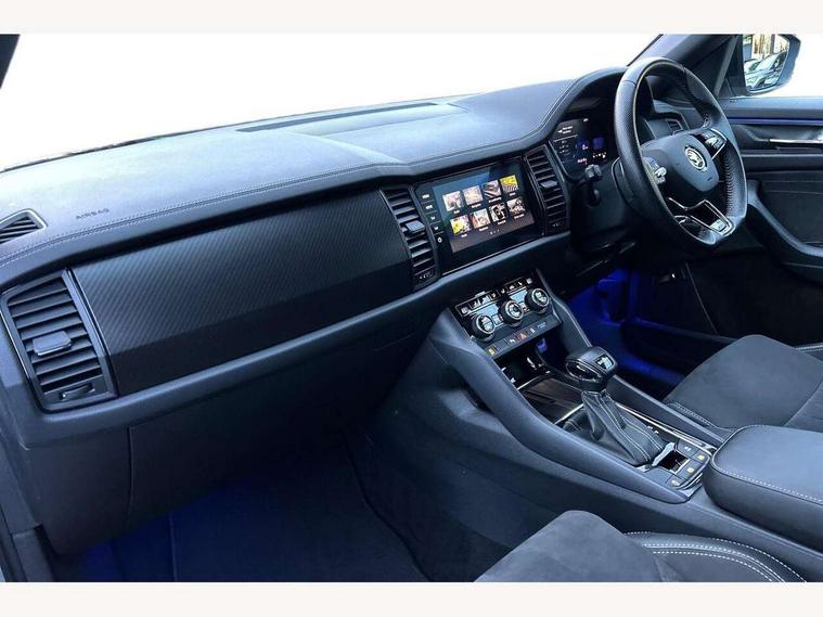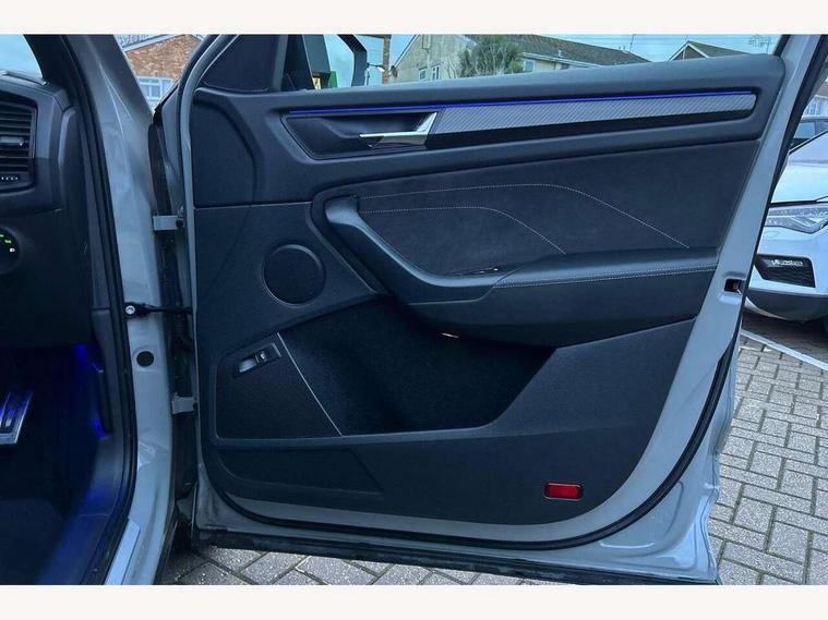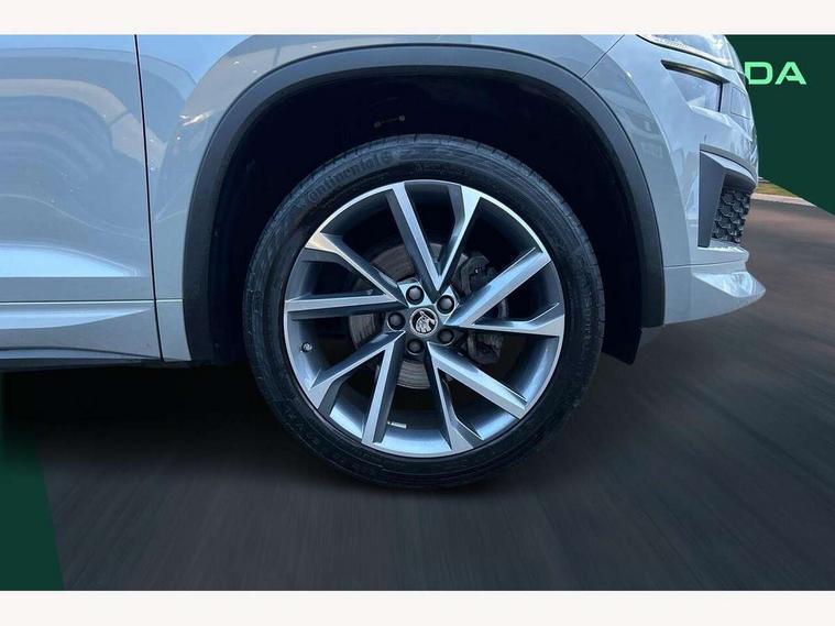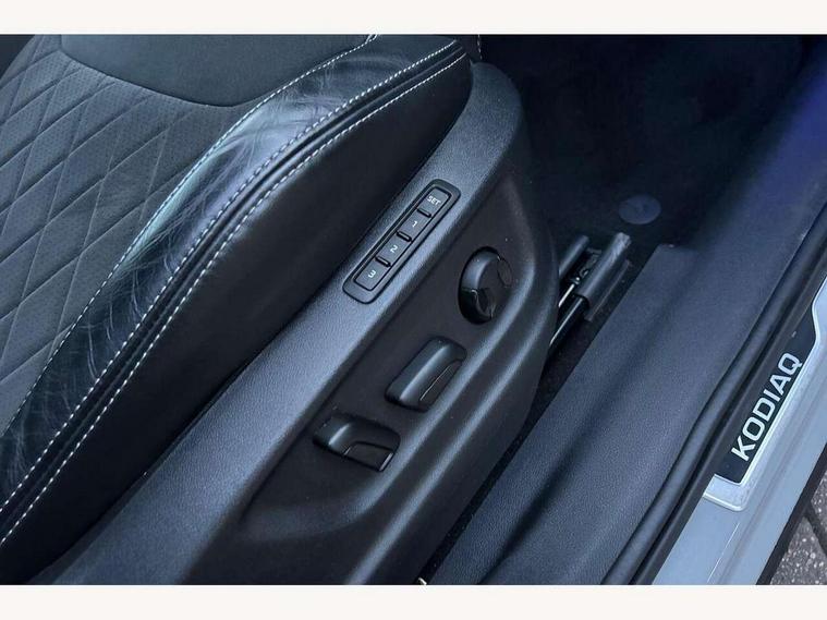Bluetooth system, Columbus satellite navigation with 9.2" touchscreen, integrated Wi-Fi, web radio, Digital voice enhancement, e call+, ECO Stop/start function, Exterior temperature indicator, Progressive steering, Rear view camera, Smartlink wireless for apple carplay and wired for android auto, Speed limiter, Tailgate unlocking from outside, USB C Port x 2 in front centre console, Wireless charging, 8 Speakers, DAB Digital radio, Aero front windscreen wipers with intermittent function, Aero rear window wiper, Auto dimming rear view mirror, Black roof rails, Black sports styling including front grille and window surrounds, Black wheel arch surrounds, Body colour bumpers, Body colour door handles, Electric adjustable/heated/folding door mirrors, driver side auto dimming with boarding sports and memory function, Electric front and rear windows, Extended rear spoiler with finlets in gloss black, Front fog lights, Full LED matrix headlights with AFS (adaptive front light system), cornering function and AWL (all weather lighting system), Gloss black door mirrors, Headlight washers, Heated rear window, Invisible tailpipe, LED daytime running lights, LED rear fog light, LED third brake light in rear spoiler, Light assistant (coming/leaving home/tunnel light), Off-road style lower front bumper element, Privacy glass, Rain and light sensors, Rear diffuser, Rear LED lights (high functionality) with welcome effect and dynamic indicators, Rear side wing doors, Safety reflectors on front and rear doors, Sportline badge on front fender, Sports front and rear bumpers including lower rear chrome strip, Tailgate lettering in Black, Window control switches with black trim, 12V socket in boot, 2 rails with 2 hooks, 2 seat bench in 3rd row, 3 seat bench in 2nd row, 4 foldable roof handles with rear coat hooks, 60:40 foldable rear seat with sliding adjustment and backrest angle adjustment, Aluminium pedals, Black roof headlining, Bottle holders in door panel in the 1.5 litre front and 1 litre rear, Cargo storage compartments, Chrome headlight control button, Chrome interior door handles, Coat hooks on B pillar, Covered storage compartment on driver side, Decorative door sill covers, Front centre armrest with storage compartment, cup holder and 12V socket, Front courtesy lights, Gear shift lever with chrome frame and black gloss insert, Grey stitching in front and rear armrests and door armrests + door inserts, Height adjustable front headrests, Illuminated and cooled glovebox, Illuminated luggage compartment, Isofix child seat fittings in outer rear seats with top tether, Manually adjustable steering column, Microsuede door panels, Net programme in boot (1x horizontal Net, 2x vertical Nets), Overhead glasses storage compartment, Pollen filter, Rear centre armrest with cupholders, Single front passenger seat, Sliding trunk cover, Small Bags on the inner sides of the front backrests, Sports seats, Sunvisors with illuminated vanity mirrors, Three rear height adjustable headrests, Ticket holder on A Pillar, Umbrella in door panel, Variable boot floor, LED Interior light pack - Kodiaq, Auto door release and activation of warning lights in the event of an accident, Child locks on rear doors, Driver and front passenger airbag with knee airbag and front passenger airbag deactivation, Electronic parking brake with hill start assist, Emergency rear braking signal, ESC (incl. ABS+MSR+ASR+EDS+HBA+DSR+RBS+MKB), Front assist with autonomous emergency braking, Front side airbags with curtain airbags, Fuel cut off safety device, Height adjustable front 3 point seatbelts + pretensioners, Hill hold control, Rear disc brakes, Safety vest holder in door, Seat belt reminder for all seats, Three point rear seat belts, Two tone horn, Tyre pressure monitor, Alarm with interior monitoring and tilt sensor with safe function, Anti-theft wheel bolts, Immobiliser, Keyless entry and start system (KESSY), Remote central locking with 2 keys, Black air vent surround, Carbon finish dashboard and door inserts, Grey stitching in dashboard, 20" Vega Anthracite alloy wheels, Temporary spare wheel (space saver),