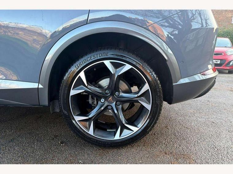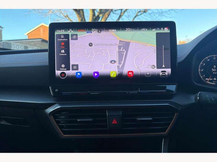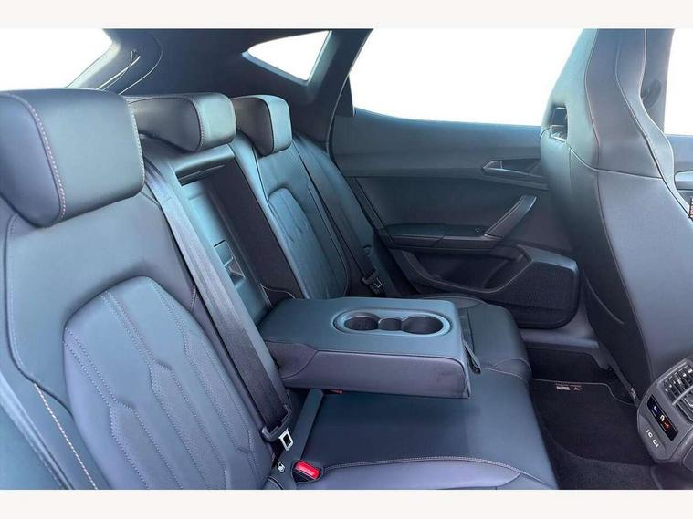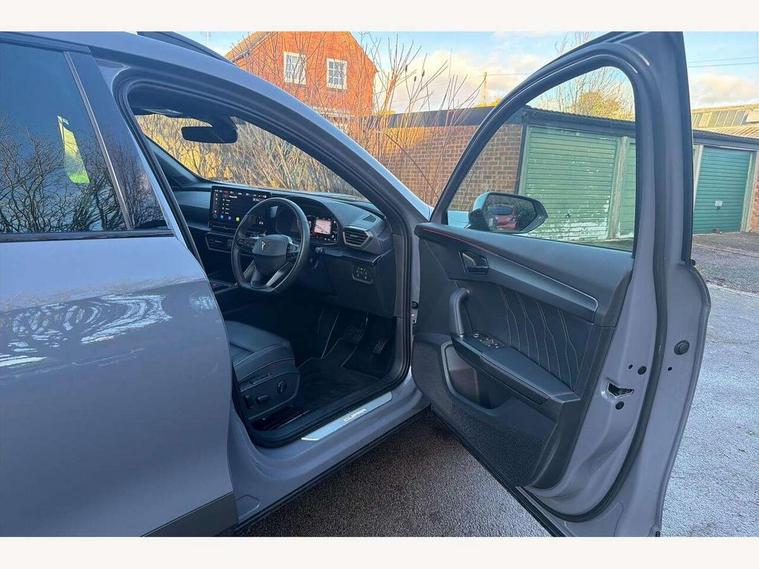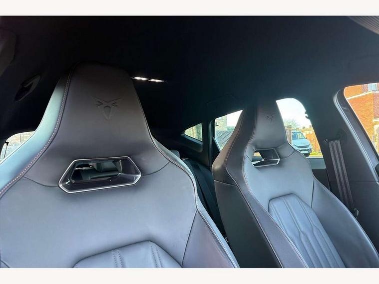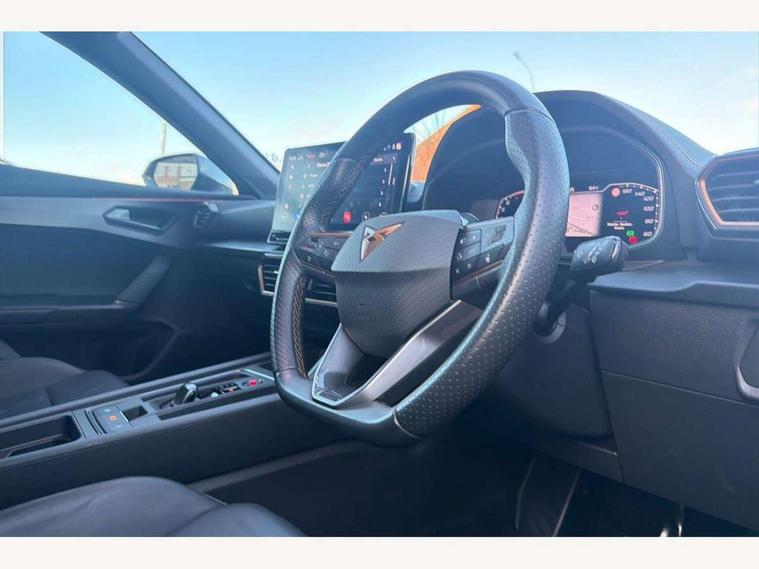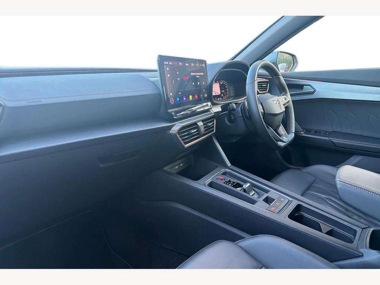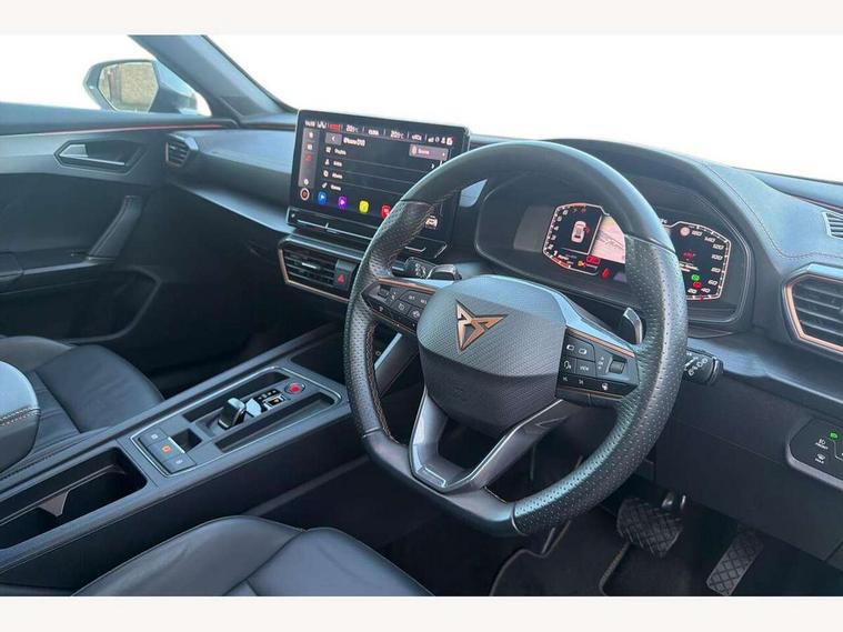 Digital cockpit and configurable dashboard, Driver alert system, Driving profile selection, Forward collision warning with automatic braking, Lane assist, Navigation system with 12'' Touchscreen Display, Park assist (inc front/rear parking sensors), PAS, Predictive adaptive cruise control with speed limiter, Rear view camera, RPM, trip computer, outside temp gauge, instrument light brightness, low fuel warning light, lights on reminder, gearshift indicator, Service interval indicator, Start/stop system with regenerative braking, Voice control system, Wireless apple carplay, Wireless phone charger, Electronic locking differential and dynamic traction support, Standard suspension, 2 front and 2 rear USB type C sockets, Auxiliary input socket, DAB radio, Auto dimming rear view mirror, Body colour door handles, Body coloured bumpers, Dark grey wing mirror, Daytime running light with automatic headlight control and coming home feature, Dynamic headlight range control, Electric front/rear windows, Electrically adjustable heated and folding door mirrors with memory function, Front fog lamps with cornering function, Gloss black roof rails and window surrounds, LED Headlights, LED Taillights with dynamic indicator, Rain sensing wipers, Rear diffuser with black simulated exhaust pipes, Rear side wing doors, Rear wash/wipe, Third brake light, Tinted rear windows, Welcome lights, 12v power supply in centre console, 12V socket, 12v socket in loadspace, 2 front and 2 rear reading lights, 230V socket, 3 seat bench in 2nd row, 60/40 split rear bench seat with armrest and mechanical seat release, Black headlining, Dust/pollen filter, Front and rear head restraints, Front centre armrest, Height/reach adjust steering wheel, Illuminated interior front door sills, Illuminated sunvisor with mirror, Isofix, Leather multi function heated steering wheel with gear shift paddles, Luggage tie-down hooks, Single front passenger seat, Three zone climate control with control panel in rear, Variable luggage/load compartment floor, Wraparound lighting, Genuine Nappa leather Pack - Cupra, 3 point seatbelts on all rear seats, ABS, Brake control system - ESC and brake booster, Child proof door locks, Driver and front passenger airbags with front passenger airbag de-activation, Electronic parking brake, Front and rear disc brakes, Front side curtain airbags, Hill hold control, Public e-call, Seat belt reminder for front and rear seats, Tyre pressure monitoring system, Anti theft alarm system, Keyless entry and start system (KESSY), Locking wheel bolts, Copper and aluminium interior detailing, 19" 'Exclusive' machined sport matte black and silver alloy wheels,