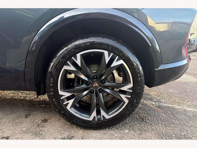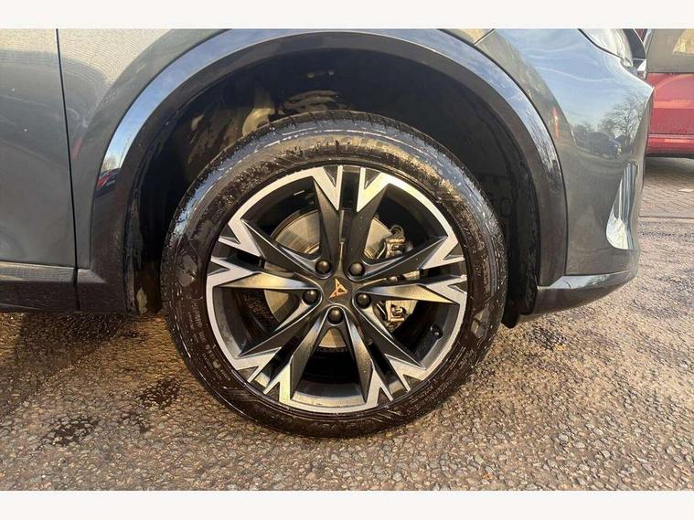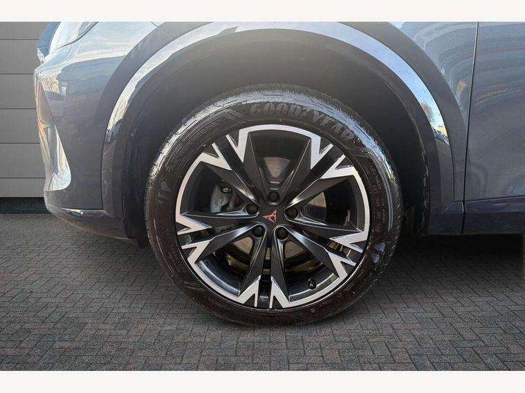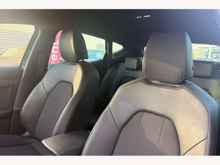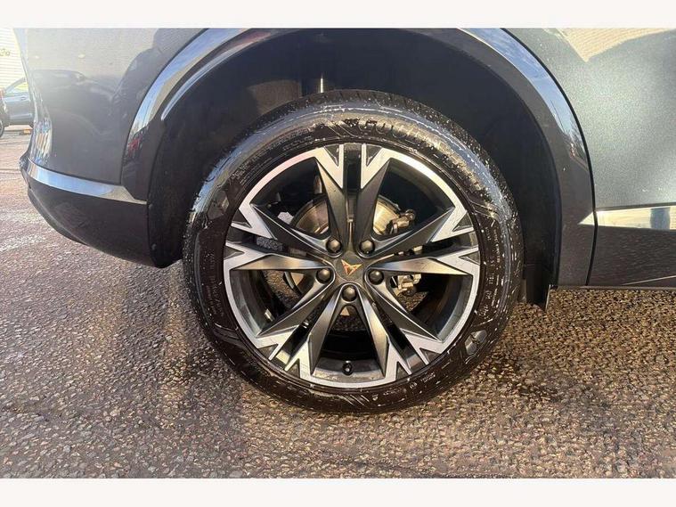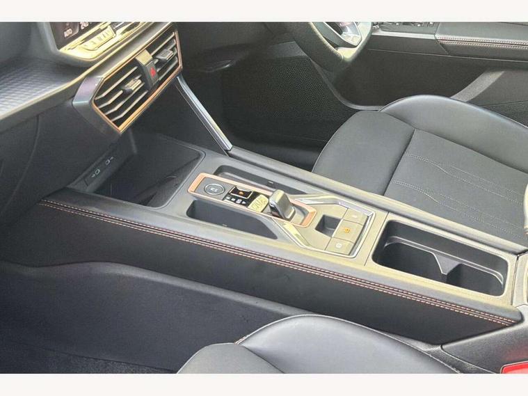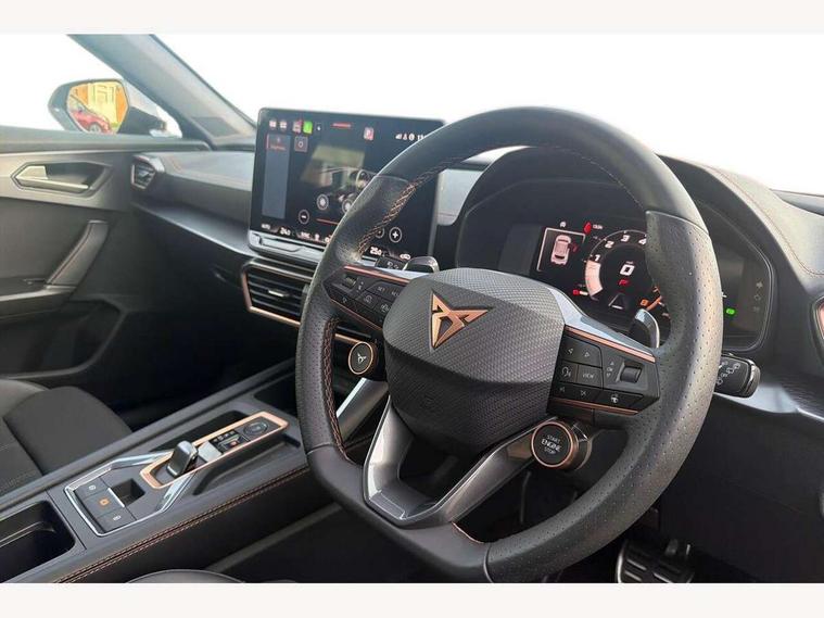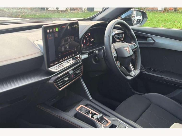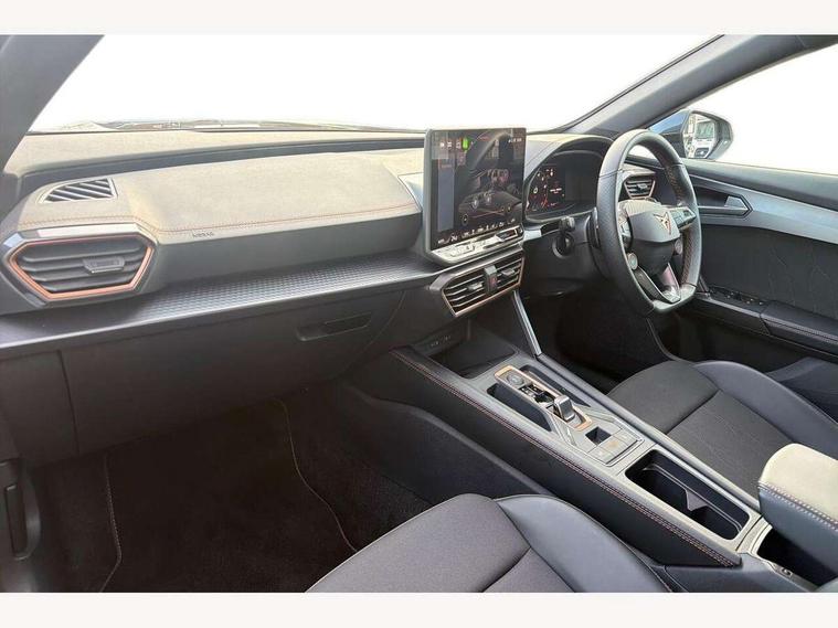 10.25" digital cockpit and configurable dashboard, Adaptive cruise control with follow-to-stop and speed limiter, Advanced driver alert system, Driving profile selection, Dynamic road sign display, Emergency steering support with turn assist, Forward collision warning with automatic braking, Front and rear parking sensors, Full link phone integration, Lane assist, Progressive steering, RPM, trip computer, outside temp gauge, instrument light brightness, low fuel warning light, lights on reminder, gearshift indicator, Service interval indicator, Start/stop system with regenerative braking, Voice control system, Wired Android Auto, Wireless apple carplay, Wireless phone charger, CUPRA sport suspension, Electronic locking differential and dynamic traction support, 2 front and 2 rear USB type C sockets, 7 speakers, Media system with navigation, 12.9" touchscreen display, voice control, DAB, steering wheel mounted controls, Auto dimming rear view mirror, Body colour door handles, Body coloured bumpers, Dark grey wing mirror, Daytime running light with automatic headlight control and coming home feature, Door panel ambient lighting, Dynamic headlight range control, Electric front/rear windows, Electrically adjustable, heated and folding door mirrors, Gloss black roof rails and window surrounds, High beam assist, LED 3rd brake light, LED front fog lamps with cornering function, LED Headlights, LED Taillights with dynamic indicator, Rain sensing wipers, Rear diffuser with black simulated exhaust pipes, Rear fog lights, Rear side wing doors, Rear wash/wipe, Tinted rear windows, Welcome lights (within exterior mirror housing), 12V socket, 2 front and 2 rear reading lights, 3 seat bench in 2nd row, 60/40 split rear bench seat with armrest and mechanical seat release, Black headlining, Black interior roof lining, Cupra sports pedals, Dust/pollen filter, Front and rear head restraints, Front centre armrest, Heated supersports multifunction leather steering wheel with satellite buttons and gear shift paddles, Height/reach adjust steering wheel, Illuminated aluminium doorsteps, Illuminated interior front door sills, Illuminated sunvisor with mirror, Interior ambient lighting, Isofix, Manually adjustable height and lumbar support for front seats, PVC/Cloth upholstery with copper stitching + Sport seats, Satellite steering wheel, Single front passenger seat, Storage pockets on rear of front seats, Three zone climate control with control panel in rear, Variable luggage/load compartment floor, 3 point seatbelts on all rear seats, ABS, Brake control system - ESC and brake booster, Child proof door locks, Driver and front passenger airbags with front passenger airbag de-activation, Electronic parking brake, Front and rear disc brakes, Front side curtain airbags, Hill hold control, Public e-call, Seat belt reminder for front and rear seats, Tyre pressure monitoring system, Anti theft alarm system, Central locking system Keyless Go, Locking wheel bolts, Copper and aluminium interior detailing, 18" Sonora machined silver alloy wheels,