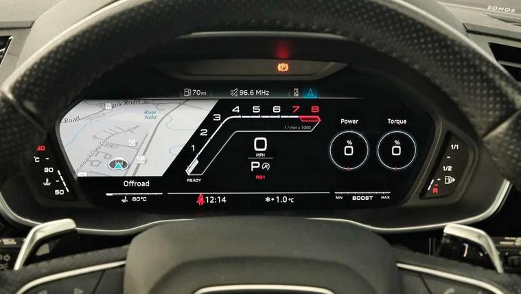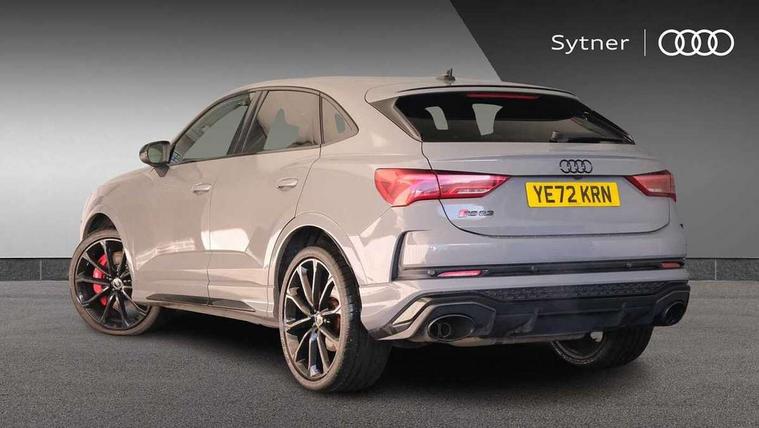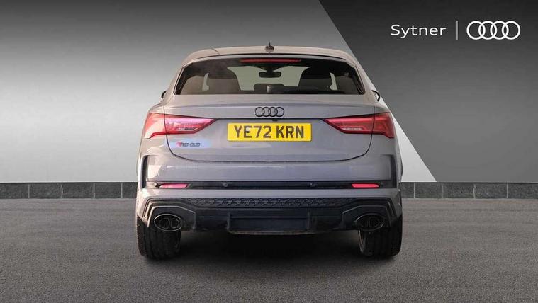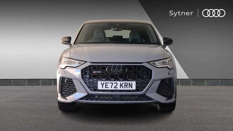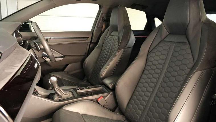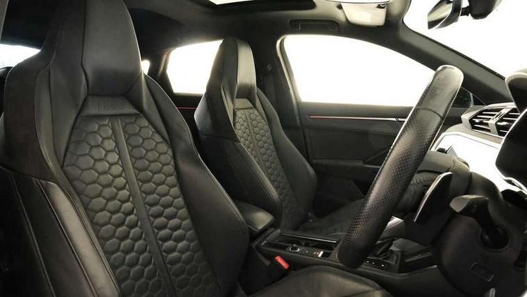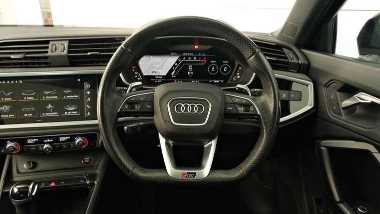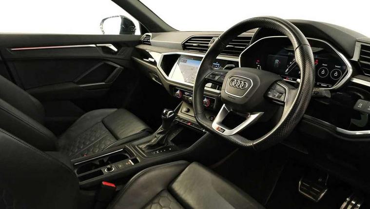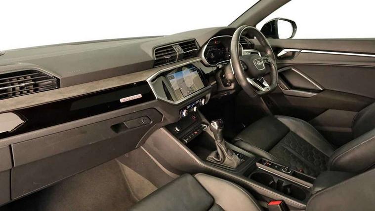 Audi drive select with new RS modes, Audi lane departure warning, Audi parking system plus with front and rear sensors, Audi virtual cockpit plus - 12.3 inch display, Bluetooth interface, Camera based traffic sign recognition, Emergency e-call, MMI Navigation Plus with high resolution 10.1 inch touchscreen colour display, Power operated tailgate, Progressive steering, Smartphone interface includes wireless Apple carplay/Android Auto, Start stop system with recuperation, Voice control system with natural language interaction, Quattro all wheel drive, 2 USB-C ports with charge and data functions, Audi sound system, DAB digital radio module, Acoustic windscreen, Audi Beam uses LEDs to project the Audi Sport logo, Auto dimming frameless rear view mirror, Body colour rear spoiler with lip in gloss black, Electrically folding, adjustable and heated door mirrors with integrated LED side indicators and kerb view function for passenger side, Flared wheel arches, Flat slits on single frame grille, Headlight washers, High gloss black finish B and C pillars, Honeycomb radiator grille in gloss black, Illuminated door sill trims with RS logo, LED headlights with LED daytime running lights and dynamic rear indicator, LED rear lights, LED third brake light, Panoramic glass sunroof, Privacy glass dark tinted rear and rear-side windows (from B-pillar backwards), Rain and light sensors, Rear side wing doors, Rear wiper, RS specific bumpers with large front air inlets in black, RS Sport exhaust system, dual branch with exhaust flap control and gloss black oval tailpipe trims, Tinted rear windows, Variable front intermittent wipers, 3 seat bench in 2nd row, 4 way electric lumbar support for driver and front passenger, Adjustable rear seat bench/backrest with centre armrest and cupholder, Black Alcantara elements - dashboard and the armrests in the front and rear doors, Black cloth headlining, Dual zone electronic climate control, Electrically adjustable front seats, Fine Nappa leather upholstery with front sports seats + honeycomb stitching and RS embossed logo, Front and rear floor mats, Front and rear head restraints, Front centre armrest, Heated front seats, ISOFIX child seat mounting for front passenger with airbag deactivation and outer rear seat including top tether attachment point for outer rear seats, Single front passenger seat, Stainless steel luggage compartment sill finisher, Stainless steel pedals, Ambient lighting pack - RS Q3, Black styling pack - RS Q3, Non smoking pack - RS Q3, 3x3 point rear seatbelts, 6 airbags - Driver, front passenger, curtain and side windows, Audi pre-sense front with pedestrain and cyclist recognition, Electrically operated child locks on rear doors, Electromechanical parking brake, Electronic stabilisation control including ABS, ASR and EDL, Front seatbelt reminder, Hill descent control, Hill hold assist, Pre sense basic, RS brake system, Seatbelt monitoring, Tyre pressure warning, Warning triangle and first aid kit, Advanced key, Anti theft alarm, Anti theft wheel bolts, Immobiliser, Aluminium look interior elements, Detail dashboard around MMI touch colour display in glass look, black with surround in aluminium look, Inlay - Black piano finish, Tool kit, Tyre repair kit,