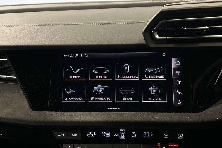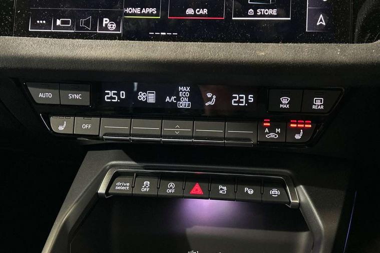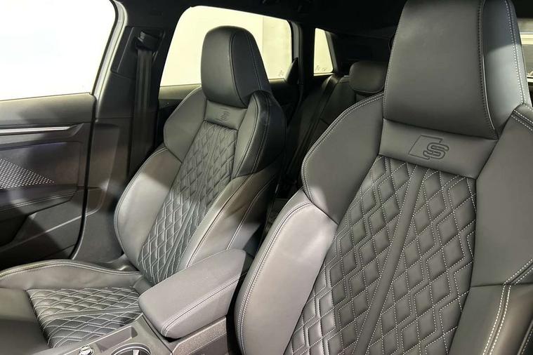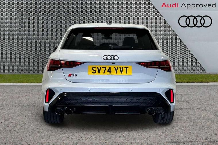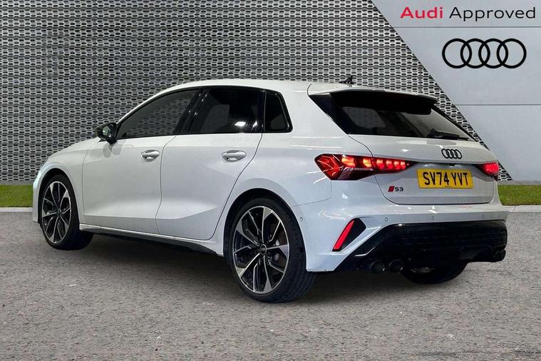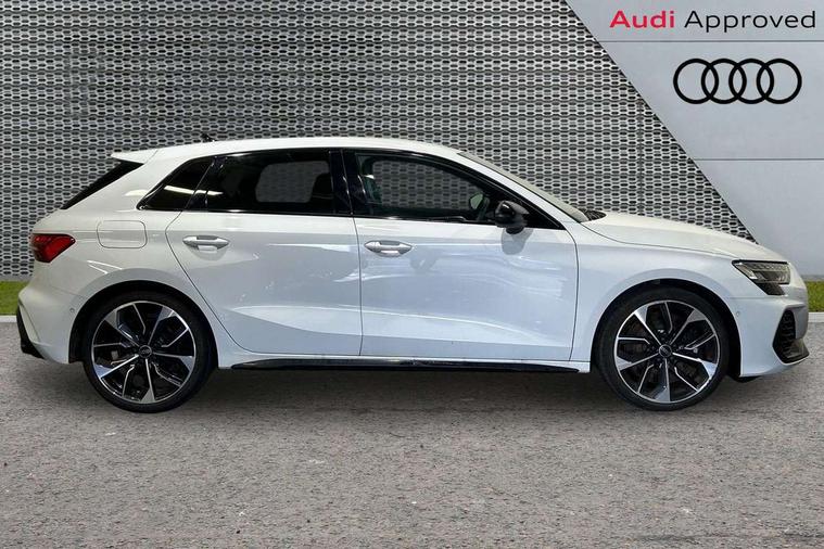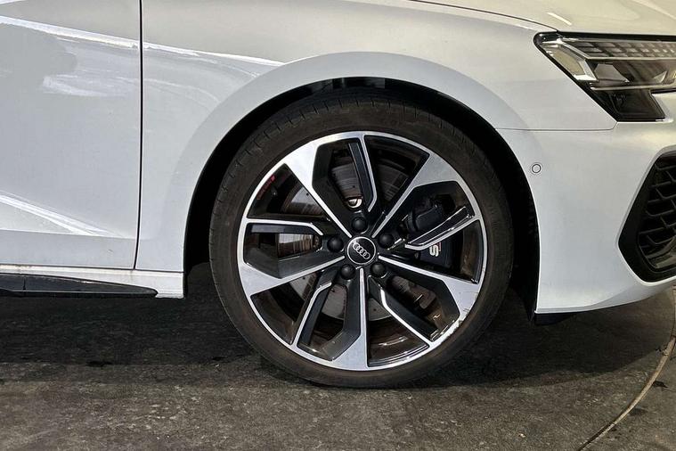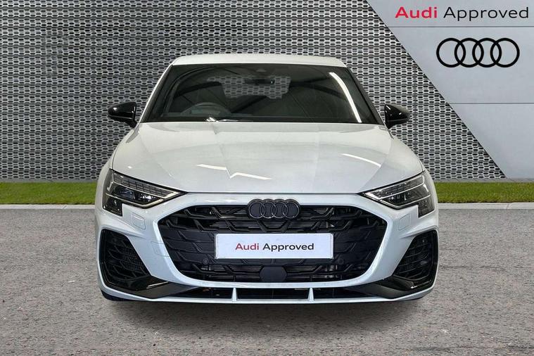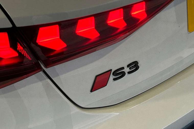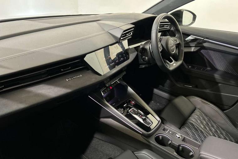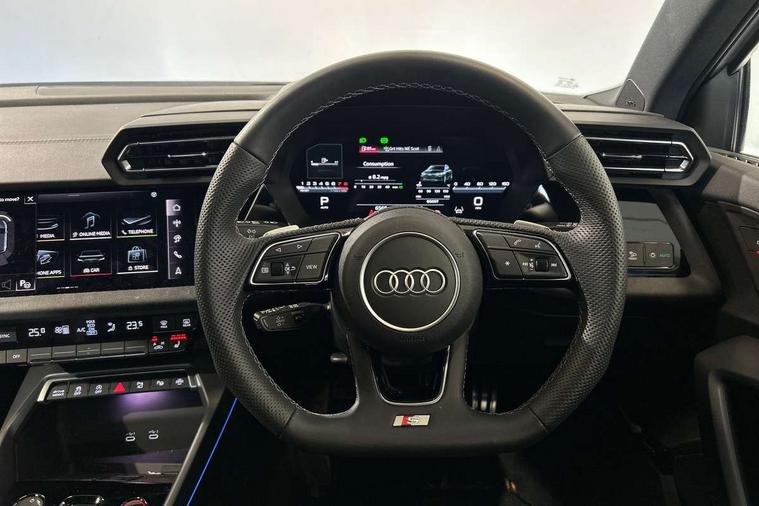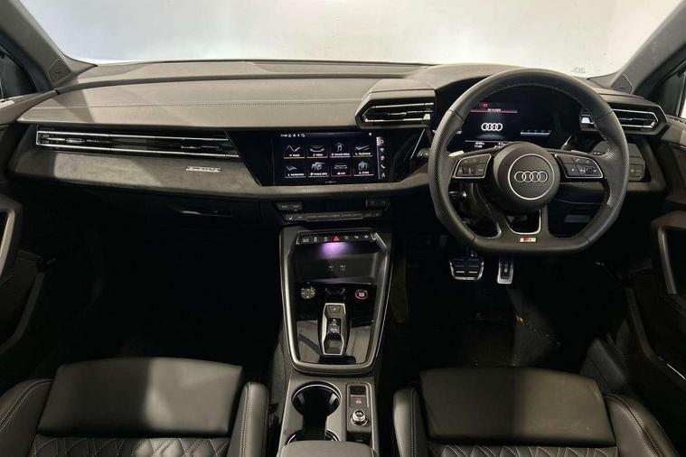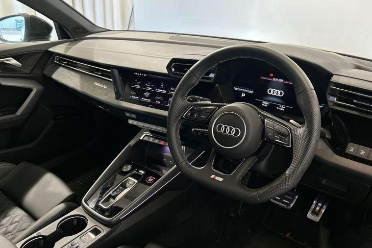 Adjustable speed limiter, Audi drive select, Audi smartphone interface with app store includes wireless Apple carplay, Android auto and Amazon alexa integration, Audi virtual cockpit plus - 12.3" full HD resolution dynamic digital instrument cluster, Automatic start/stop system with recuperation, Bluetooth interface, Camera based traffic sign recognition, Collision avoidance assistant, Distraction and Fatigue warning, e-Call (emergency call), Lane departure warning system, MMI Navigation Plus with high resolution 10.1" colour touch screen display, Park Assist with parking system Plus, Progressive steering, Service indicator, Tailgate, Trip computer, Voice control system with natural language interaction, Quattro permanent four wheel drive, S sport suspension with spring damper adjustment and lowering by 15mm, Audi Phonebox light with wireless charging, DAB Digital radio, USB ports with charging function in the rear, Anthracite grey Audi rings (front and rear), Audi Beam uses LEDs to project the rhombus S logo onto the ground as you exit your S3, Auto dimming frameless rear view mirror, Black accents front and rear bumpers including air inlets, Black accents in front grille and frame, Black accents window trims strips, Electrically adjustable/heated/folding/auto dimming door mirrors with integrated LED indications + kerb view function for passenger side, Exterior model badging, Front electric windows, Headlight washers, Heat insulating glass windscreen, Illuminated door sills with aluminium inserts at the front with S logo, LED 3rd brake light, LED daytime running lights, LED headlights with LED rear lights and dynamic rear indicators, Light and rain sensors, Privacy glass - dark tinted rear window, rear door and side windows, Rear electric windows, Rear side wing doors, Rear wiper, S grille, S3 front bumper with S specific air intake grilles, S3 roof spoiler, 12V socket and storage compartment in front centre console, 3 seat bench in 2nd row, 3 spoke flat bottomed leather multifunction sport steering wheel with gear shift paddles, 3-zone deluxe automatic air conditioning, 4 way electrically adjustable lumbar support for driver and front passenger, 40/20/40 split folding rear seat bench, Black cloth headlining, Fine Nappa leather upholstery with front sports seats S embossed logo, Front and rear centre armrest in artificial leather, Front and rear centre armrest in artificial leather with contrasting stitching on armrests and instrument panel, Front and rear headrests, Front/rear floor mats, Heated front seats, Height and reach adjustable steering wheel, Manual boot compartment lid, Manually adjustable front seats, Rear cup holders, S badging on the steering wheel, Seat side bolsters, Single front passenger seat, Stainless steel pedals and front footrest in black, Aluminium interior elements pack - A3 Sportback, Extended ambient lighting package Pro - S3 Black edition, Storage package - A3, Technology package - A3, 3x3 point rear seat belts, Driver and front passenger airbag with passenger airbag deactivation, Electronic Stabilisation Control (ESC) including ABS, ASR and EDL, First aid kit with warning triangle and 2 safety vests, Front side airbags with head airbags and interaction airbag, Hill hold assist, Pre-sense front with pedestrian and cyclist detection, Seatbelt monitoring, Tyre pressure loss indicator, Anti theft alarm, Anti-theft wheel bolts, Electronically operated child locks, Immobiliser, Remote central locking with safelock, Inlays in black dynamica microfibre, Tyre repair kit,