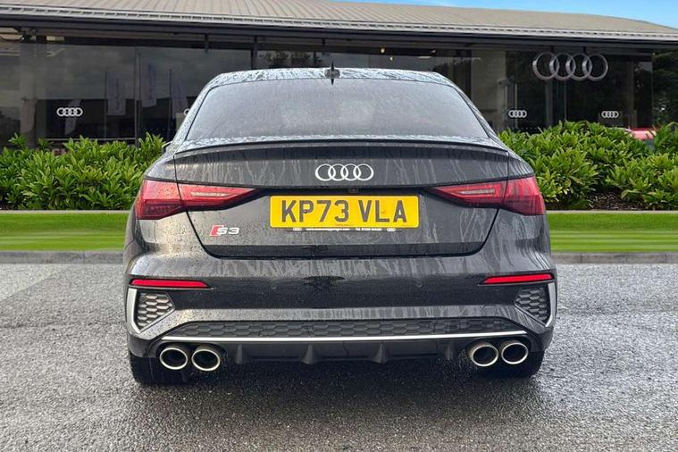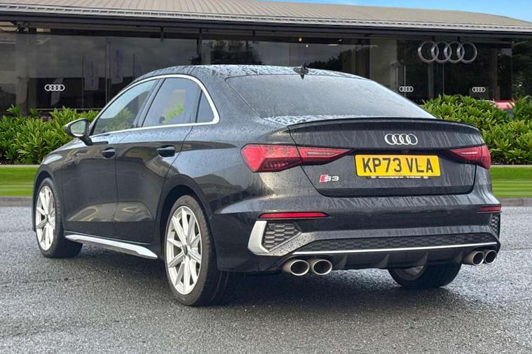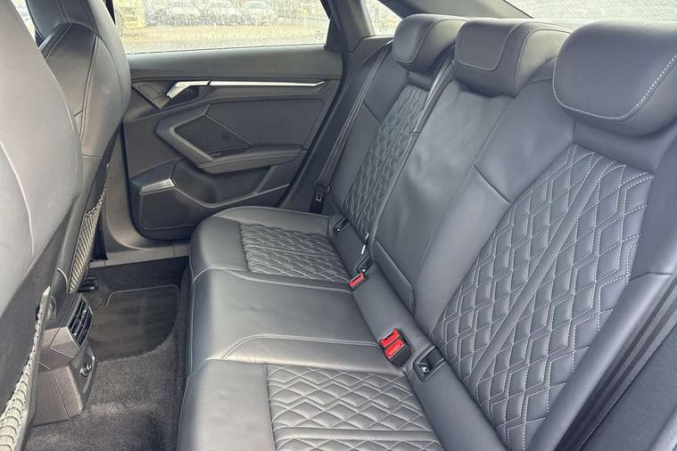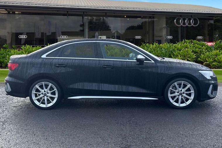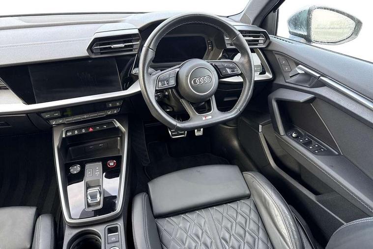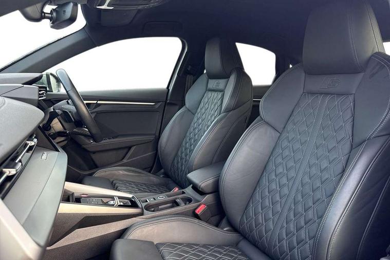 Audi connect emergency call and service, Audi drive select (Auto, Comfort, Dynamic, Efficiency and Individual), Audi smartphone interface, Audi Virtual Cockpit - 10.25" digital and colour instrument cluster, Automatic start/stop system with recuperation, Bluetooth interface, Collision avoidance assistant, Lane departure warning system, MMI Navigation Plus with high resolution 10.1" colour touch screen display, Progressive steering, Service indicator, Voice control system with natural language interaction, Quattro permanent all wheel drive, S sport suspension with spring damper adjustment and lowering by 15mm, 2x USB Type C ports (for charging and data transfer), 6 passive loudspeakers, CD player, DAB Digital radio, 3rd brake light, Acoustic glass windscreen, Audi Beam uses LEDs to project the Audi logo onto the ground as you exit your S3, Auto dimming frameless rear view mirror, Dual branch oval twin tailpipes in chrome plated finish, Electrically adjustable/heated/folding/dimming door mirrors with kerb view includes integrated LED indications + kerb view function for passenger side, Exterior mirror with aluminium look housing, Front electric windows, Headlight washers, Illuminated door sills with aluminium inserts at the front with S logo, LED daytime running lights, LED headlights with LED rear lights and dynamic rear indicators, Light and rain sensors, Model and engine designation badges at rear, Privacy glass - dark tinted rear window, rear door and side windows, Rear boot, Rear electric windows, Rear side wing doors, 12V socket and storage compartment in front centre console, 3 seat bench in 2nd row, 40/20/40 split folding rear seat bench with cupholder, Black cloth headlining, Dual zone electronic climate control, Fine Nappa leather upholstery with front sports seats S embossed logo, Front and rear centre armrest in leather, Front and rear headrests, Front/rear floor mats, Heated front seats, Height and reach adjustable steering wheel, Illuminated vanity mirror, Interior lighting - glove compartment light and right hand side, Luggage compartment floor covering, Manual boot compartment lid, Single front passenger seat, Stainless steel pedals and front footrest in black, Body styling design pack - S3, LED interior lighting pack - A3 Saloon, Storage pack - A3/S3 Saloon, 3x3 point rear seat belts, Driver and front passenger airbag with passenger airbag deactivation, Electronic Stabilisation Control (ESC) including ABS, ASR and EDL, First aid kit with warning triangle and 2 safety vests, Front side airbags with head airbags and interaction airbag, Hill hold assist, Pre-sense front with pedestrian and cyclist detection, Seatbelt monitoring, Tyre pressure loss indicator, Anti theft alarm, Anti-theft wheel bolts, Electronically operated child locks, Immobiliser, Remote control central locking, Aluminium air vent surrounds, Aluminium trim elements, Dark spectrum aluminium inlays, accent surfaces in the dashboard and centre console in platinum grey silk effect paint finish,
