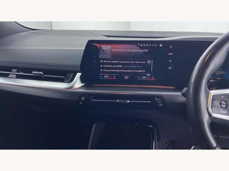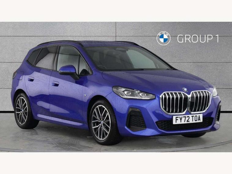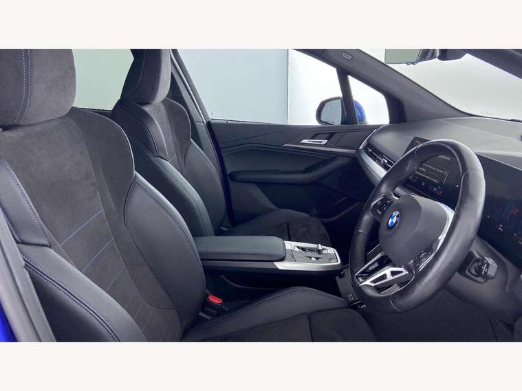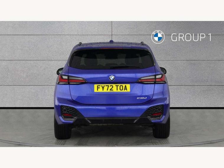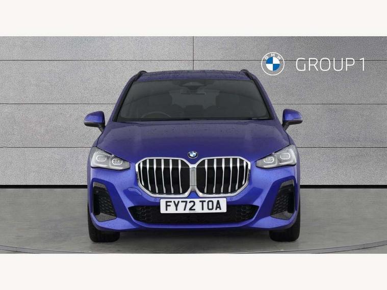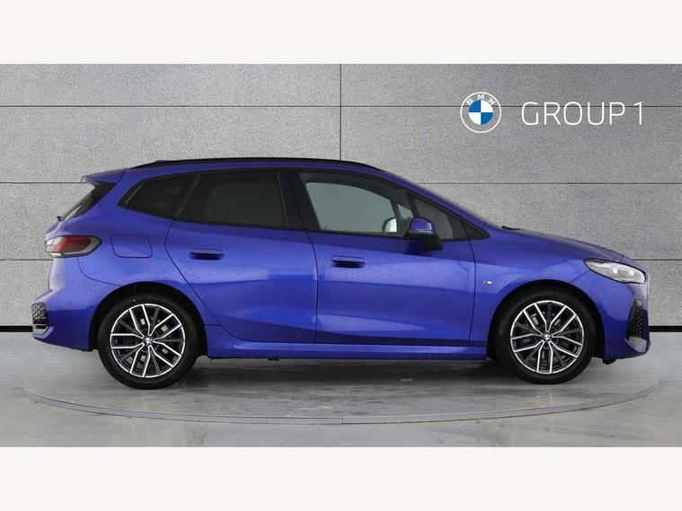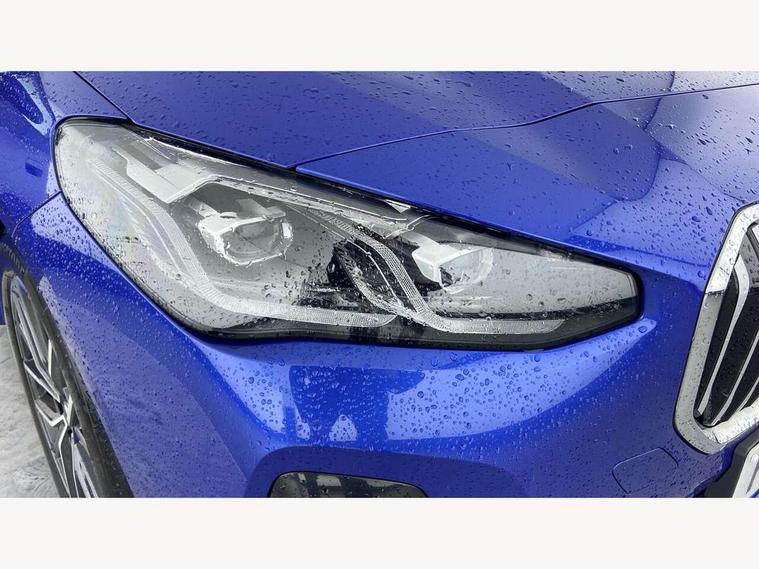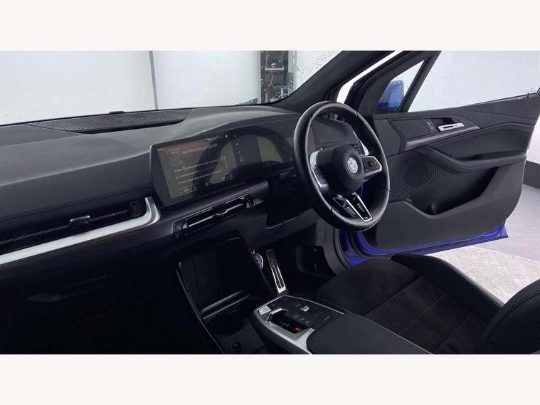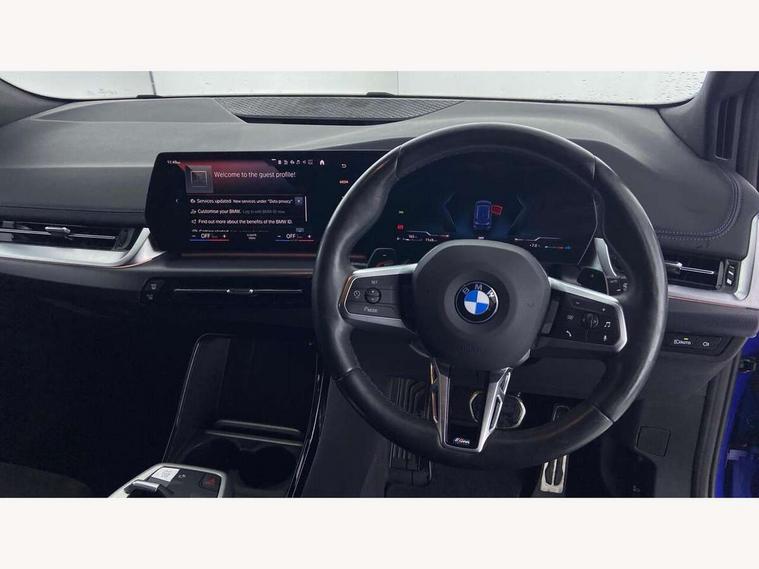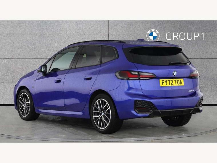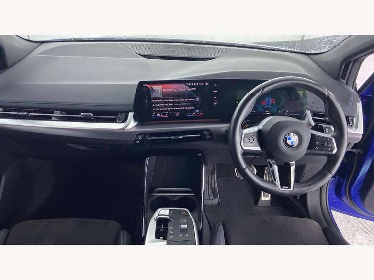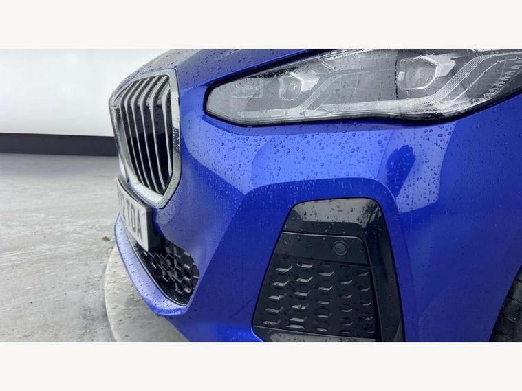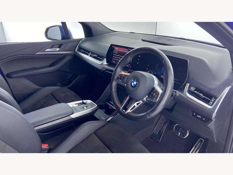 Active Guard incl speed limiting and lane departure functions with auto steering, and front collision warning with brake intervention, Automatic powered tailgate, Automatic start/stop function, BMW Online services, BMW Teleservices, Brake pad wear indicator in front and rear, Condition based service, Drive off assistant, Flat air vents on instrument panel in high gloss black, adjustable slats with elements in pearl chrome, iDrive controller, Language version English, On board computer - average speed+fuel consumption, service interval, clock/date, odometer/trip meter, outside temperature display and ice warning, Parking assistant with active park distance control, reversing assistant, lateral parking aid and rear view camera, Servotronic variable electric power steering (EPS), Smartphone integration, Widescreen display, Diesel particulate filter, Diesel with SCR emission control system, Drive performance control with ECO PRO comfort + sport mode, Gear selector switch with toggle operation, M Adaptive suspension, Steptronic sport transmission with double clutch and gear shift paddles, 2x USB Type C ports in front centre console for charging and data transfer, 2x USB Type C ports in rear centre console for charging, DAB Digital radio, Welcome sound upon opening of the front driver or passenger door, Air inlet middle part on front apron in lines specific design with trim strip in satinised aluminium, Automatic headlights, BMW emblem, engine compartment lid and tailgate, Body colour roof mouldings, Body coloured door mirror caps, Contoured rear roof spoiler in vehicle colour with side aeroblades in black high-gloss, Driver side exterior mirror lighting with BMW logo projection, Dynamic brake lights, Electric adjustable heated door mirrors, Electric windows - front and rear, with open/close fingertip control, anti-trap facility and comfort closing, Folding door handles integrated flush with surface, Front and rear windscreen wipers with heated front washer nozzles, Front bumper cover with independent design in body colour with inserts in black high gloss, Front bumper design elements in satinised aluminium, Front door exit lights, Front door sill finishers aluminium inserts with M inscription, Front entry sills with aluminium inserts + BMW inscription, Front oramental grille with radiator grille bars in satinised aluminium, Heated rear window, Hidden exhaust pipe, High gloss shadow line, High gloss shadowline roof rails, Key with M identification, LED Daytime running lights and parking lights with turn indicators, LED number plate light, LED third brake light in rear spoiler, M identification on sides, Manual headlight range control, Model inscription on right tailgate, Rain sensor, Rear bumper cover with independent design in body colour with inserts in black high gloss, Rear bumper trim strip in satinised aluminium, Rear side wing doors, Shark fin antenna, Side sill covers with independent design in Body colour, Trailer stabilisation logic, Trims on front and rear bumper covers colour-coordinated with side window graphic, Visible VIN plate, Welcome lighting, Windscreen washer nozzle for rear view camera, 12V power socket in luggage compartment and front centre console, 12V socket in right side trim panel, 2 bag hooks in luggage compartment, 2 front reading lights, 2 open cup holders in front centre console, 3 seat bench in 2nd row, 40:20:40 split folding rear seat backrests, Ambient lighting front and rear, Automatic two zone climate control air conditioning, Bottle trays in all doors, Child seat ISOFIX attachment for two outer rear seats and front passenger seat with anchorage points, Driver and front passenger sports seats, Four grab handles integrated in roof lining, Front and rear door pockets, Front and rear footwell lighting, Front and rear side armrest integrated into door trim, Front centre console storage compartment, Front head restraints, Glovebox with light, Heated front seats, Height adjustable 3 rear head restraints, Interior door handle recess light on all doors, Luggage compartment lighting, M Anthracite headlining, M specific floor mats, M sport leather steering wheel, Map pockets, Mechanical rear seats with fore/aft adjustment, Multi-function controls for steering wheel, One piece parcel shelf opens together with tailgate and removable, Rear cloth hooks, Single front passenger seat, Sliding rear seat bench, Stainless steel pedals, Steering wheel column manual adjustment, Storage compartment lighting in centre console and storage tray in centre stack, Storage compartment net in left side trim panel, Storage compartment with folding cover under centre console armrest cushion, Storage tray in right side trim panel, Sunvisors with illuminated vanity mirrors, Three spoke sport leather steering wheel, Connected pack professional - 2 Series Active Tourer, Technology pack - 2 Series Active Tourer - MY22, 3 point seatbelts on all seats, front pyrotechnic belt tensioners, stopper and belt force limiters, rear coded belt buckles, Airbag - Front driver and passenger, front and rear head, front side, curtain head protection, manual deactivation of front passenger airbag possible, Anti lock braking system (ABS) with brake assist, Automatic hold function, BMW emergency call, Brake drying, Braking readiness, Child proof locking system in rear door, Cornering brake control, Crash Sensor - activates hazard/interior lighting + unlocks doors, DSC - Dynamic Stability Control, Dynamic brake control, Dynamic Traction Control - DTC, Electromechanical parking brake, Energy recovery system, Front disc brakes, Integrated braking system, PC iBrake PostCrash approach control warning with light braking function, Rear disc brakes, Tyre pressure monitoring system, Warning triangle and first aid kit, Anti theft alarm system, Closing system with central locking, Engine immobiliser, Locking wheel bolts, Front centre console trim in high gloss black with my mode expressive, Reduced rolling resistance tyres,