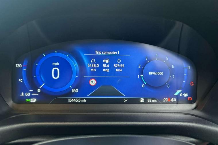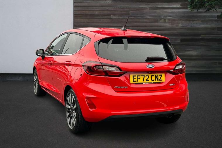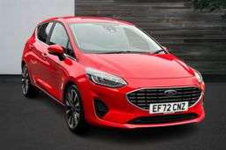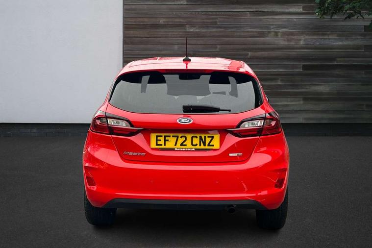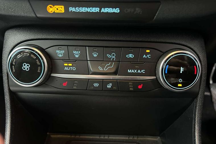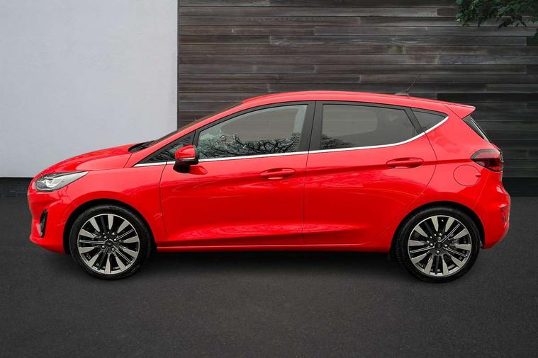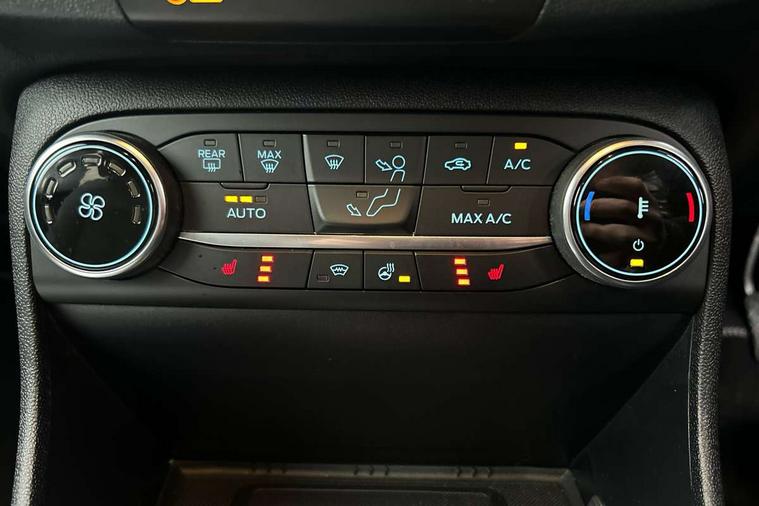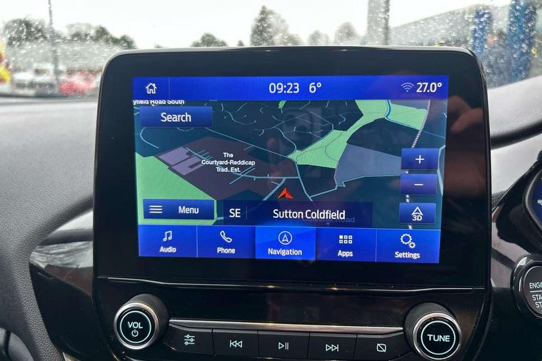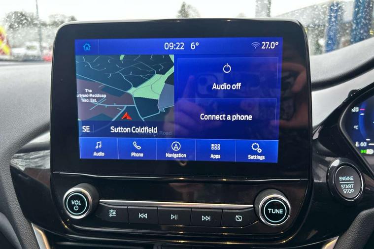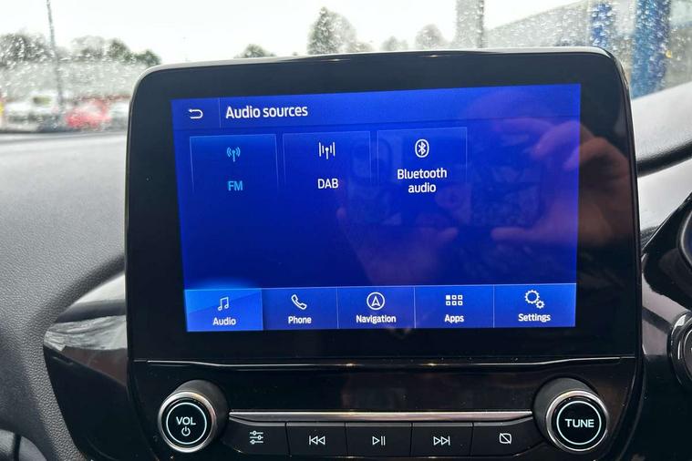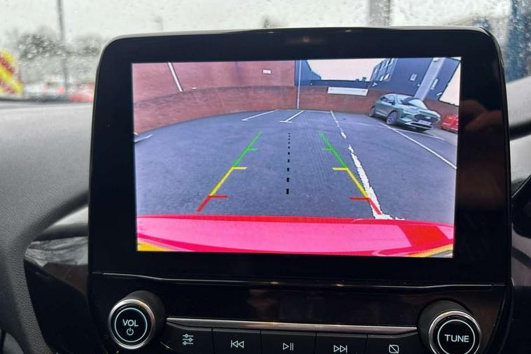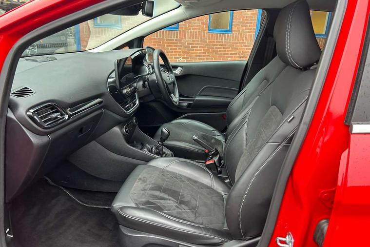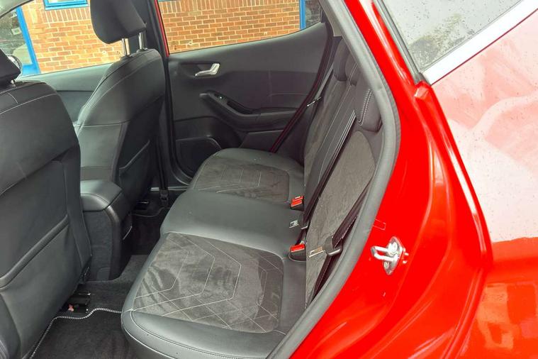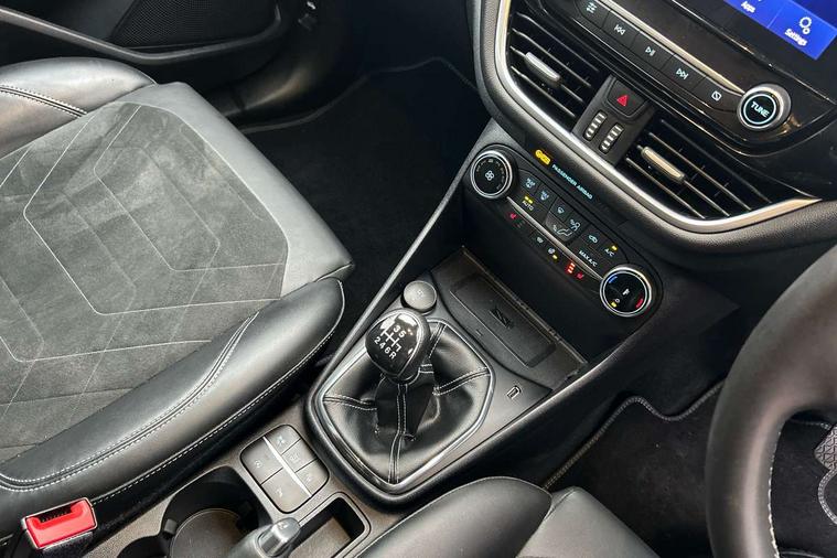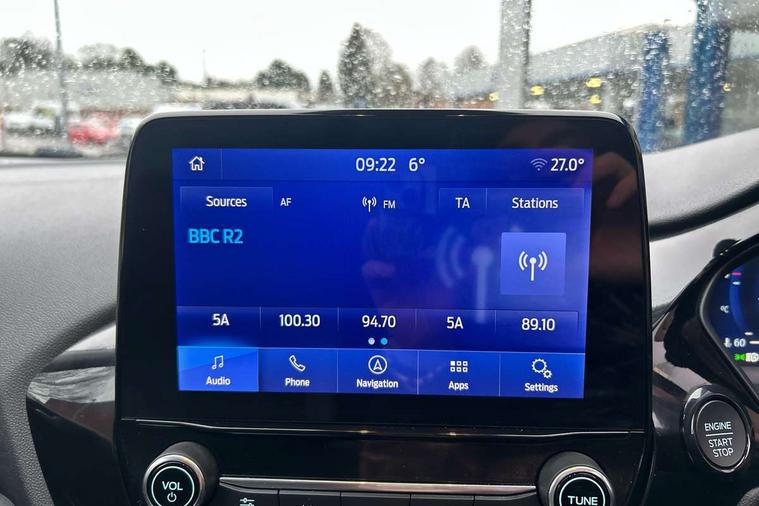 4.2" TFT instrument cluster screen, Bluetooth system, Electric power steering, Ford easy fuel, Rear parking distance sensors, Selectable drive modes (Normal, Sport, Track), Traffic sign recognition, Trip computer, 2 USB ports, Auxiliary input socket, B&O Premium audio system with 8" touchscreen, 10 speakers, 360 degree sound system, Ford SYNC 3 navigation system and Ford pass connect, DAB Digital radio, Steering wheel mounted controls, Auto high beam, Body colour bumpers, Body colour door handles, Body colour rear spoiler, Body coloured electrically operated and heated door mirrors with side indicators, Chrome beltline trim, Chrome front grille, Chrome lower window surround, Cornering front fog lights, Electric front windows/one touch facility, Electric rear windows, LED Night signature to rear lights, Power foldable door mirrors with puddle lights, Quickclear heated windscreen, Rain sensing wipers and auto dimming rear view mirror, Rear privacy glass, Rear wiper, 3 spoke leather trimmed steering wheel with audio control, 60/40 split folding rear seat, Adjustable head restraints, Boot carpet, Centre console with opening armrest, 2x cupholders, 12v and USB, Chrome inner door handles, Drivers and Passenger lumbar support, EATC - Electronic Auto Temperature control, Footwell illumination, Front floor mats in velour, Front map reading lights, Front seat and rear pockets, Height adjustable passenger seat, Illuminated glovebox, Leather gaiter, LED ambient lighting, Load area light, Luxury woven headliner, Manual 4-way driver seat adjust, Overhead console with sunglasses holder, Pollen filter, Rake/reach adjustable steering wheel, Sensico partial premium upholstery, Sensico wrapped steering wheel, NCAP Pack - Fiesta, 3 point seatbelts on all rear seats, ABS+EBA, Curtain airbags, Driver and passenger airbags, Drivers knee airbag, Electronic stability control with hill start assist, Front passenger airbag deactivation, Front side airbags, Seatbelt warning, Two tone horn, Tyre pressure monitoring system, Ford keyfree system with Keyless entry and keyless start, MyKey system, Remote central locking & engine immobiliser, Thatcham Cat.1 alarm, 17" 8 spoke alloy wheels,