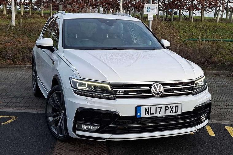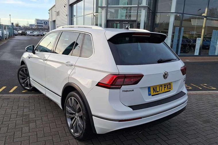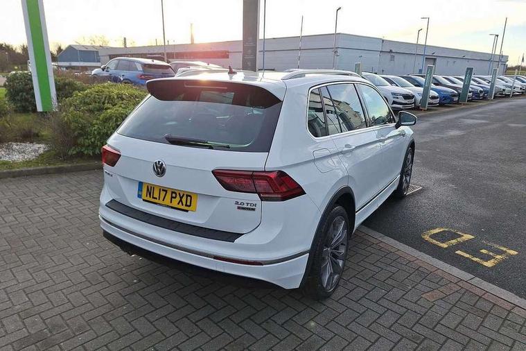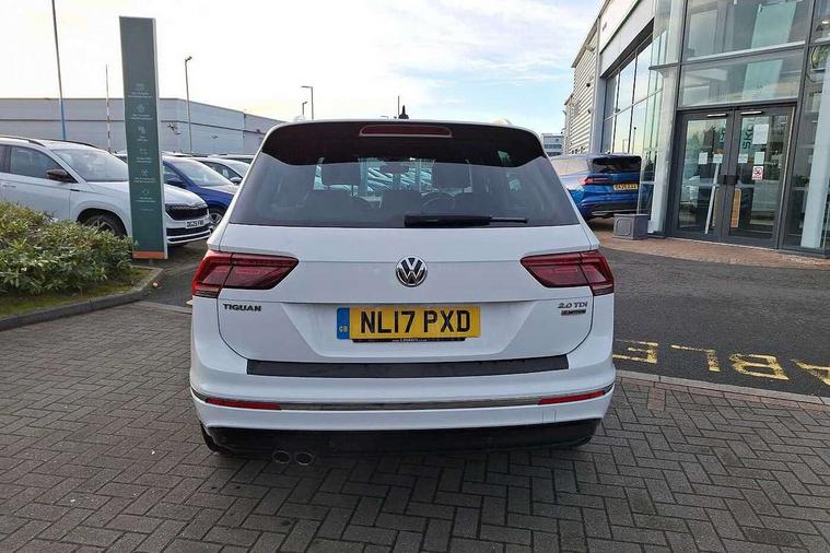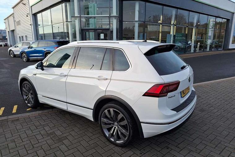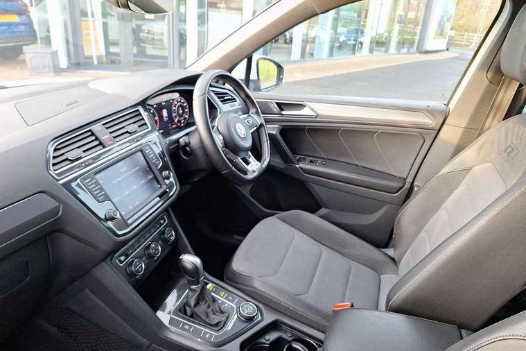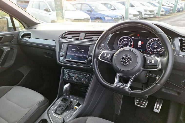 Active information display, Adaptive cruise control, App-Connect, Bluetooth phone integration system, Instrument cluster, Lane assist, Low washer fluid warning light, Outside temperature display, Service interval indicator, Speed limiter, Warning lights, Diesel particulate filter, Sports suspension, XDS electronic differential lock, Aux-in socket, DAB Digital radio, SD card slot, USB connection, Auto dimming interior mirror, Automatic activation of hazard warning lights, Black roof rails, Body colour door handles, Body colour door mirrors, Body colour rear spoiler, Body coloured bumpers, Chrome side window surrounds, Chrome trimmed radiator grille, Coming/leaving home lighting function, Dual chrome exhaust, Dusk sensor + auto driving lights, Electric folding door mirrors, Electric heated + adjustable door mirrors, Electric panoramic sunroof with sunblind, Front and rear electric windows, Heated rear window, LED headlights with dynamic light assist daytime running lights and cornering front fog lights, LED rear lights, Piano black rear diffuser, R Line body kit, Rain sensor windscreen wipers, Rear windscreen washer and wiper with interval delay, Silver under body guard, Tinted windows (B pillar backwards), Twin trapezoid chrome exhaust pipes, 12V Accessory socket in centre console, 3 rear headrests, 3 zone climate control, 4 load lashing points, 40:20:40 split folding rear seats, Bag hook in luggage compartment, Black headlining, Driver + front passenger lumbar support, Foldable passenger seatback, Front + rear carpet mats, Front centre armrest with 12v socket, Front centre armrest with storage + rear 2 air vents + cupholders, Front seatback folding tables, Height/reach adjust steering wheel, Illuminated driver/passenger vanity mirrors, Illuminated scuff plates, Interior light with delay, Isofix Preparation 2 Rear child seats, Leather gear knob, Lockable cooled glovebox, Luggage compartment lighting, Luggage compartment side storage, Map pockets on front seats, Passenger seat height adjuster, Rear cupholders, Removable luggage cover, Sliding/reclining rear seats, Stainless steel pedals, Storage compartment in driver's door, Storage compartment in passenger's door, Storage tray on dashboard, Sunglasses storage, Variable boot floor, Ambient lighting pack - Tiguan, 3 rear 3 point seatbelts, ABS+EBD+Brake assist, Active bonnet, Active pedestrian safety system, Curtain airbags, Driver/Front Passenger airbags, Driver/Passenger whiplash optimised head restraints, Drivers knee airbag, Electronic parking brake with auto hold, ESP with EDL + ASR, First aid kit, Front assist including city emergency braking, Front side airbags, Head airbag system, Height adjustable front 3 point seatbelts + pretensioners, Hill hold control, Passenger airbag deactivate switch, Passenger knee airbag, Pre crash system, Rear side airbags, Seatbelt warning lamp and buzzer, Two tone horn, Warning triangle, Alarm with interior protection, Electronic engine immobiliser, Remote central locking with 2 remote folding keys, Chrome door trim inserts, Piano black interior trim, 20" Suzuka alloy wheels + anti theft wheel bolts, Steel space saver spare wheel,