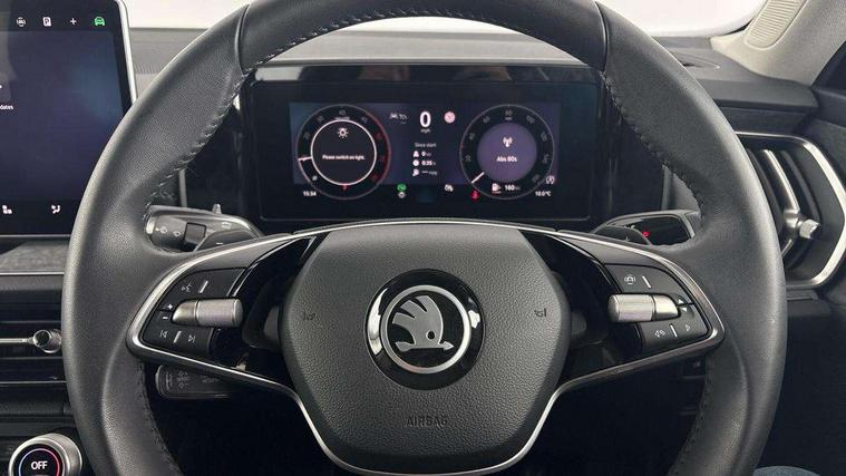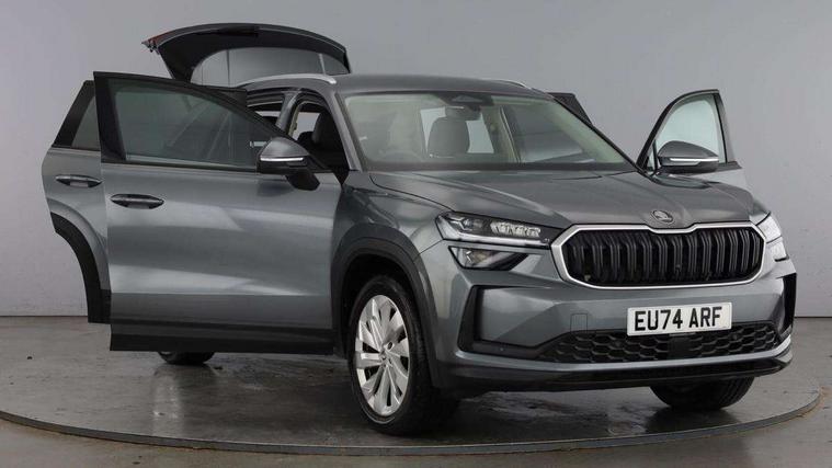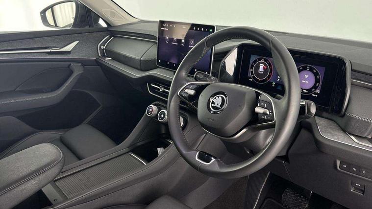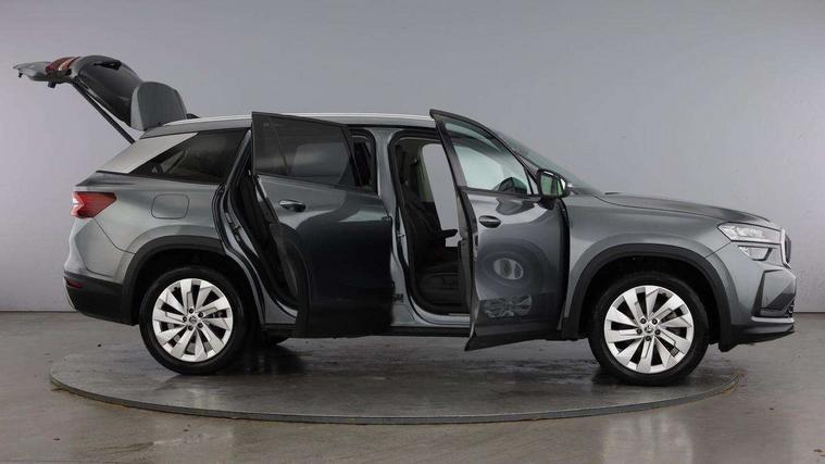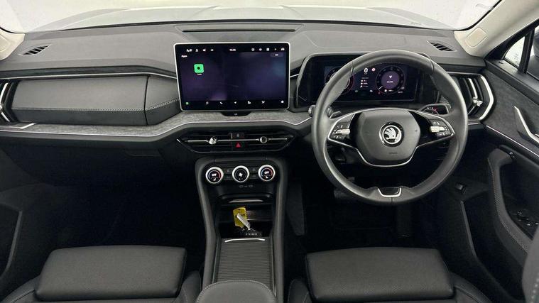 13" satellite navigation touchscreen display, Blind spot detection with door exit warning, Bluetooth system, ChatGPT functionality, Drive mode selector, Driver alert with fatigue sensor, Driver drowsiness alert system, Dry display cleaner, e call+, Front cross traffic assist, Lane assist, PAS, Rear traffic assist, Tailgate unlocking from outside, Traffic sign recognition, USB C Port x 2 in front centre console, Virtual Cockpit - 10.25" digital display, Voice control system, Wireless charging for two smartphones (15W) with cooling function, Wireless SmartLink for Apple CarPlay and Android Auto, Stop/start function, 2x USB-C in the rear, DAB Digital radio, Aero front windscreen wipers with intermittent function, Auto dimming rear view mirror, AWL (all weather lighting) and all weather light with cornering function, Black wheel arch surrounds, Body colour bumpers, Body colour door mirrors and handles, Cornering light and poor weather light, Electric folding /adjustable/separted heated/folding door mirrors, auto dimming with boarding sports and memory function, Electric front and rear windows, Exterior black decorative trims, Heat insulating glass in windshield, Heated rear window, Ice scraper in fuel tank cap, Invisible tailpipe, LED daytime running lights, LED rear fog light, LED third brake light in rear spoiler, Light assistant with automatic headlight control and coming home feature, Logo projection in door mirrors, Privacy glass, Rear side wing doors, Rear spoiler, Rear window wiper, Red decorative strip between rear LED lights, Safety reflectors on front and rear doors, Window control switches with black trim, Windscreen wipers with rain sensor, Without engine designation, 1.5l bottle holder points in all door, 12V socket in boot, 1x centre rear reading light, 2 seat bench in 3rd row, 3 configurable smart dials with 32mm coloured display, 3 seat bench in 2nd row, 4 foldable roof handles with rear coat hooks, Ambient interior lighting - Dashboard, front-door stowage compartments, front and rear door panels and footwell lighting, Automatic gear selector on steering wheel, Chrome interior door handles, Driver/front passenger reading lights, Fabric headlining, Fixed bench 40:60:40 split folding backrests, Front and rear floor mats, Front centre armrest with jumbo box storage compartment, cup holder and 12V socket, Front courtesy lights, Height adjustable front headrests, Isofix child seat fittings in outer middle row rear seats and front passenger with top tether, Manually adjustable steering column, Pollen filter, Rear centre armrest with cupholders, Rear seat boot backrest release, Retractable luggage compartment cover, Single front passenger seat, Sliding trunk cover, Small Bags on the inner sides of the front backrests, Storage pocket including mobile phone pockets on the backs of the front seats, Sunvisors with illuminated vanity mirrors, Three rear height adjustable headrests, Ticket holder on A Pillar, Tri zone climate control, Umbrella in door panel x1 made from sustainable materials, Upper and lower glovebox with card holder and coin compartment, USB C port by rear view mirror for charging only (15W), Exterior styling pack - Kodiaq, Auto door release and activation of warning lights in the event of an accident, Driver and front passenger airbag with knee airbag and front passenger airbag deactivation, Electric child locks, Electronic parking brake, ESC (incl. ABS+EMD+MSR+ASR+EDL+HBA+DSR+RBS+ESBS+MCB+TSA+XDS), Front assist with braking reaction to vehicles, pedestrians and cyclists, Front disc brakes, Fuel cut off safety device, Height adjustable front 3 point seatbelts + pretensioners, Hill hold control, Junction assist with automatic emergency braking, Rear disc brakes, Safety vest holder in door, Seat belt reminder for all seats, Three point rear seat belts, Two tone horn, Tyre pressure monitor, Anti-theft wheel bolts, Immobiliser, Remote central locking with 2 keys, Breakdown kit,