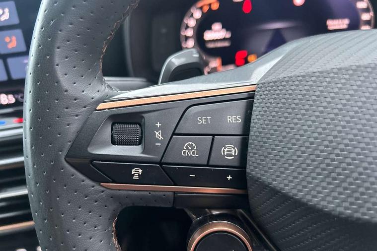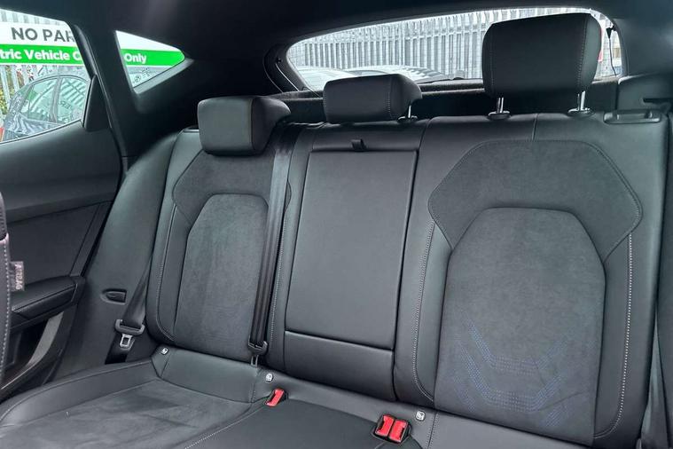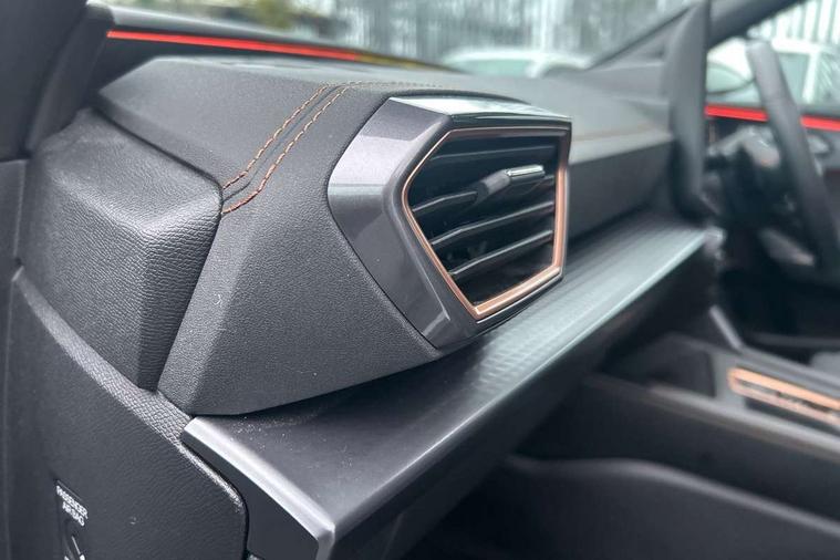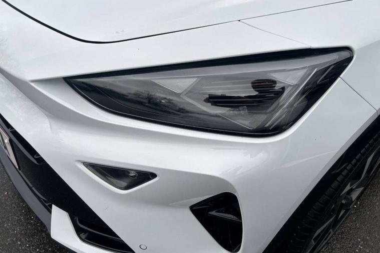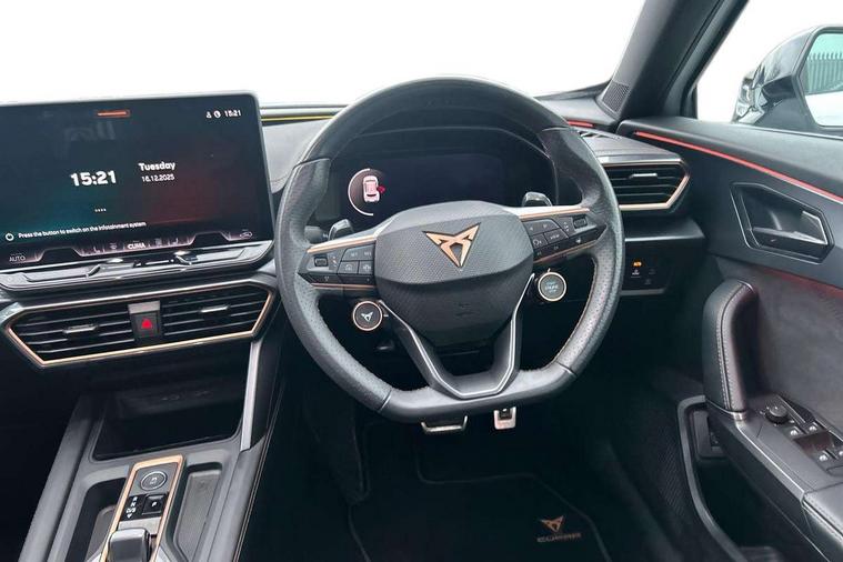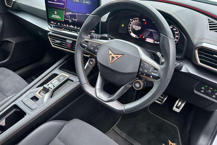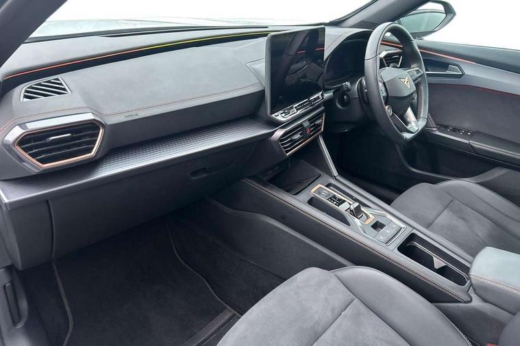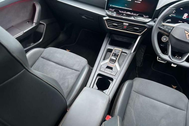 10.25" digital cockpit and configurable dashboard, Adaptive cruise control with follow-to-stop and speed limiter, Advanced driver alert system, Driving profile selection, Dynamic road sign display, Emergency steering support with turn assist, Forward collision warning with automatic braking, Front and rear parking sensors, Full link phone integration, Lane assist, Progressive steering, Rear view camera, RPM, trip computer, outside temp gauge, instrument light brightness, low fuel warning light, lights on reminder, gearshift indicator, Service interval indicator, Start/stop system with regenerative braking, Virtual pedal and electric tailgate, Voice control system, Wired Android Auto, Wireless apple carplay, Wireless phone charger, CUPRA sport suspension, Electronic locking differential and dynamic traction support, 2 front and 2 rear USB type C sockets, Media system with navigation, 12.9" touchscreen display, voice control, DAB, steering wheel mounted controls, Auto dimming rear view mirror, Body colour door handles, Body coloured bumpers, Dark grey wing mirror, Daytime running light with automatic headlight control and coming home feature, Door panel ambient lighting, Dynamic headlight range control, Electric front/rear windows, Electrically adjustable heated and folding door mirrors with memory function, Gloss black roof rails and window surrounds, High beam assist, LED 3rd brake light, LED front fog lamps with cornering function, LED Headlights, LED Taillights with dynamic indicator, Rain sensing wipers, Rear diffuser with black simulated exhaust pipes, Rear fog lights, Rear side wing doors, Rear wash/wipe, Tinted rear windows, Welcome lights (within exterior mirror housing), 12V socket, 2 front and 2 rear reading lights, 3 seat bench in 2nd row, 60/40 split rear bench seat with armrest and mechanical seat release, Black headlining, Black interior roof lining, Cupra sports pedals, Dust/pollen filter, Electrically adjustable driver's seat with memory and lumbar support, Front and rear head restraints, Front centre armrest, Heated front seats, Heated supersports multifunction leather steering wheel with satellite buttons and gear shift paddles, Height/reach adjust steering wheel, Illuminated aluminium doorsteps, Illuminated interior front door sills, Illuminated sunvisor with mirror, Isofix, Leather dashboard, door insert and side trim panel, LED smart wraparound lighting, PVC/Dinamica microfiber upholstery + bucket seats, Satellite steering wheel, Single front passenger seat, Storage pockets on rear of front seats, Three zone climate control with control panel in rear, Variable luggage/load compartment floor, 3 point seatbelts on all rear seats, ABS, Brake control system - ESC and brake booster, Child proof door locks, Driver and front passenger airbags with front passenger airbag de-activation, Electronic parking brake, Front and rear disc brakes, Front side curtain airbags, Hill hold control, Public e-call, Seat belt reminder for front and rear seats, Tyre pressure monitoring system, Anti theft alarm system, KESSY Advanced - Keyless start, keyless entry with SAFELOCK, Locking wheel bolts, Copper and aluminium interior detailing, 19" Sandstorm machined sport black and silver alloy wheels,