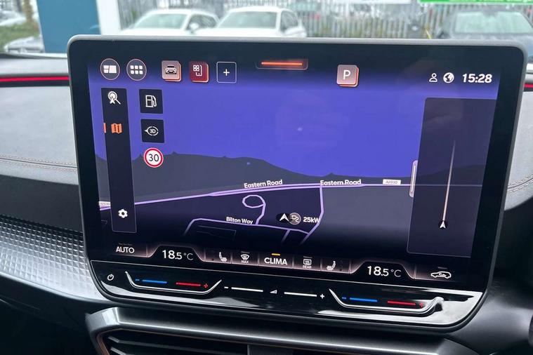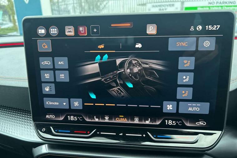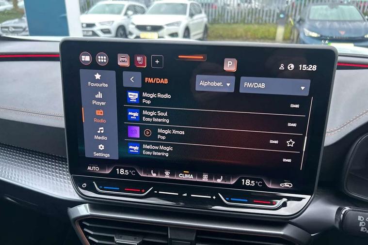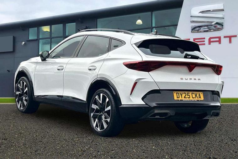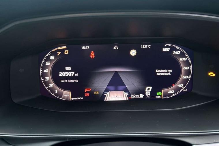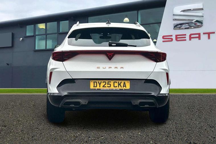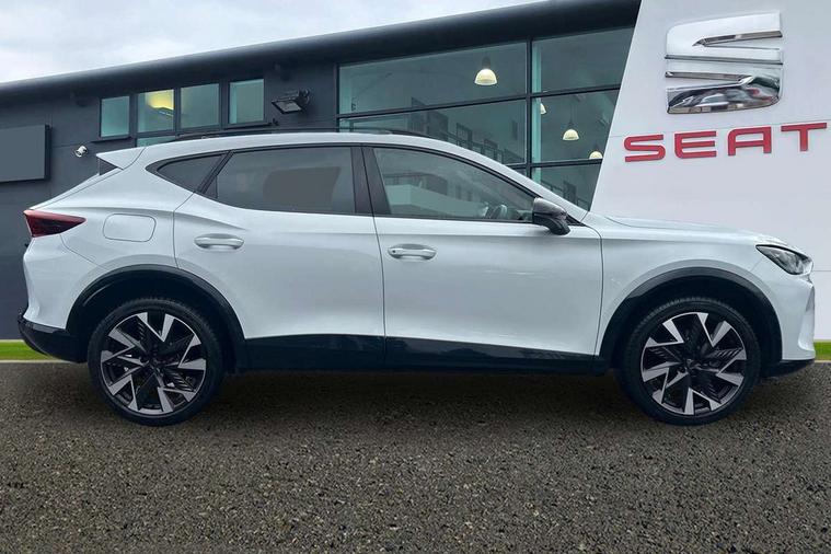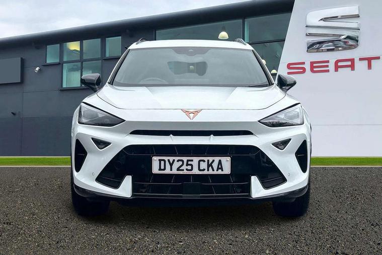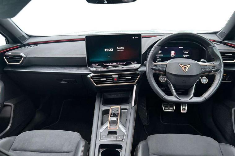 10.25" digital cockpit and configurable dashboard, Adaptive cruise control with follow-to-stop and speed limiter, Advanced driver alert system, Driving profile selection, Dynamic road sign display, Emergency steering support with turn assist, Forward collision warning with automatic braking, Front and rear parking sensors, Full link phone integration, Lane assist, Progressive steering, Rear view camera, RPM, trip computer, outside temp gauge, instrument light brightness, low fuel warning light, lights on reminder, gearshift indicator, Service interval indicator, Start/stop system with regenerative braking, Virtual pedal and electric tailgate, Voice control system, Wired Android Auto, Wireless apple carplay, Wireless phone charger, CUPRA sport suspension, Electronic locking differential and dynamic traction support, 2 front and 2 rear USB type C sockets, Media system with navigation, 12.9" touchscreen display, voice control, DAB, steering wheel mounted controls, Auto dimming rear view mirror, Body colour door handles, Body coloured bumpers, Dark grey wing mirror, Daytime running light with automatic headlight control and coming home feature, Door panel ambient lighting, Dynamic headlight range control, Electric front/rear windows, Electrically adjustable heated and folding door mirrors with memory function, Gloss black roof rails and window surrounds, High beam assist, LED 3rd brake light, LED front fog lamps with cornering function, LED Headlights, LED Taillights with dynamic indicator, Rain sensing wipers, Rear diffuser with black simulated exhaust pipes, Rear fog lights, Rear side wing doors, Rear wash/wipe, Tinted rear windows, Welcome lights (within exterior mirror housing), 12V socket, 2 front and 2 rear reading lights, 3 seat bench in 2nd row, 60/40 split rear bench seat with armrest and mechanical seat release, Black headlining, Black interior roof lining, Cupra sports pedals, Dust/pollen filter, Electrically adjustable driver's seat with memory and lumbar support, Front and rear head restraints, Front centre armrest, Heated front seats, Heated supersports multifunction leather steering wheel with satellite buttons and gear shift paddles, Height/reach adjust steering wheel, Illuminated aluminium doorsteps, Illuminated interior front door sills, Illuminated sunvisor with mirror, Isofix, Leather dashboard, door insert and side trim panel, LED smart wraparound lighting, PVC/Dinamica microfiber upholstery + bucket seats, Satellite steering wheel, Single front passenger seat, Storage pockets on rear of front seats, Three zone climate control with control panel in rear, Variable luggage/load compartment floor, 3 point seatbelts on all rear seats, ABS, Brake control system - ESC and brake booster, Child proof door locks, Driver and front passenger airbags with front passenger airbag de-activation, Electronic parking brake, Front and rear disc brakes, Front side curtain airbags, Hill hold control, Public e-call, Seat belt reminder for front and rear seats, Tyre pressure monitoring system, Anti theft alarm system, KESSY Advanced - Keyless start, keyless entry with SAFELOCK, Locking wheel bolts, Copper and aluminium interior detailing, 19" Sandstorm machined sport black and silver alloy wheels,
