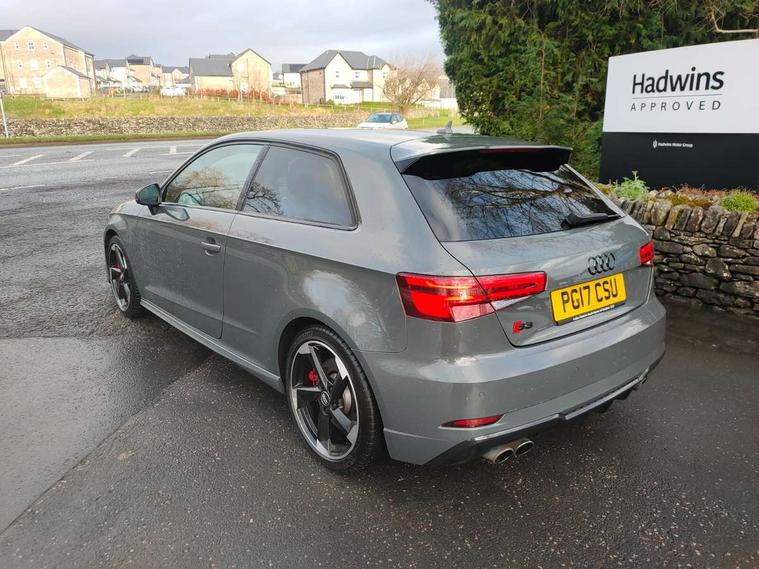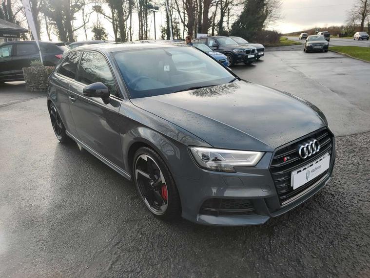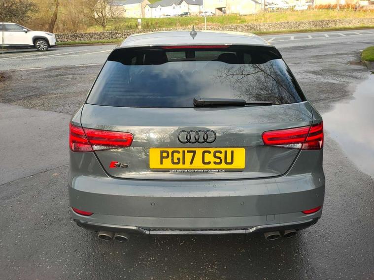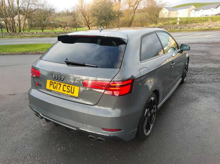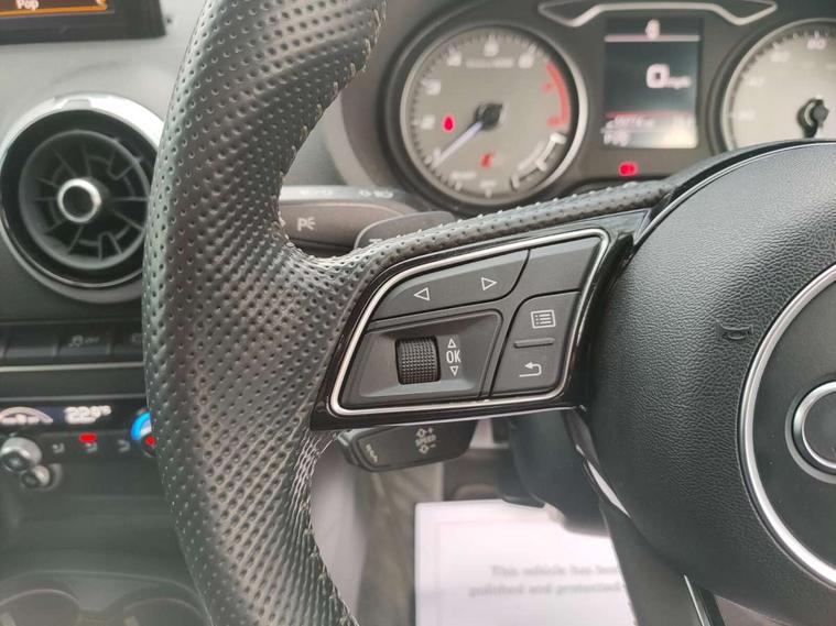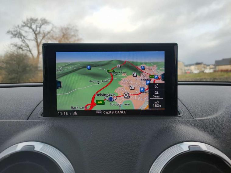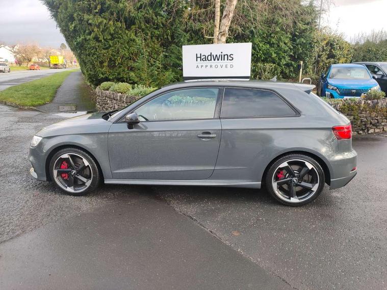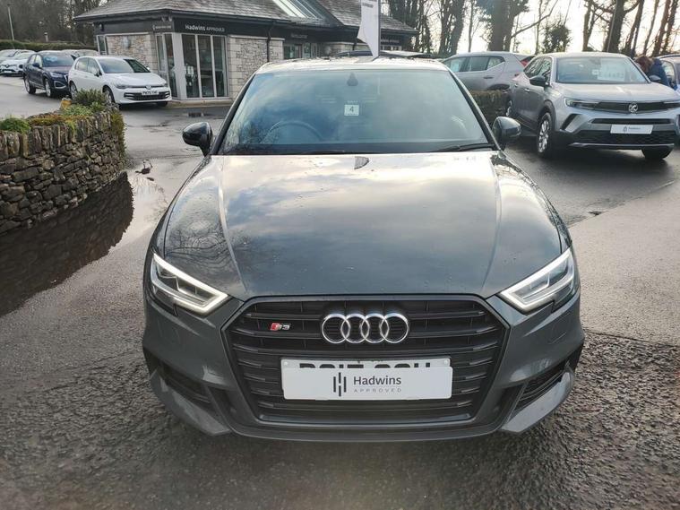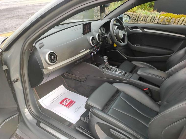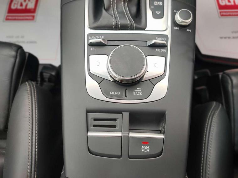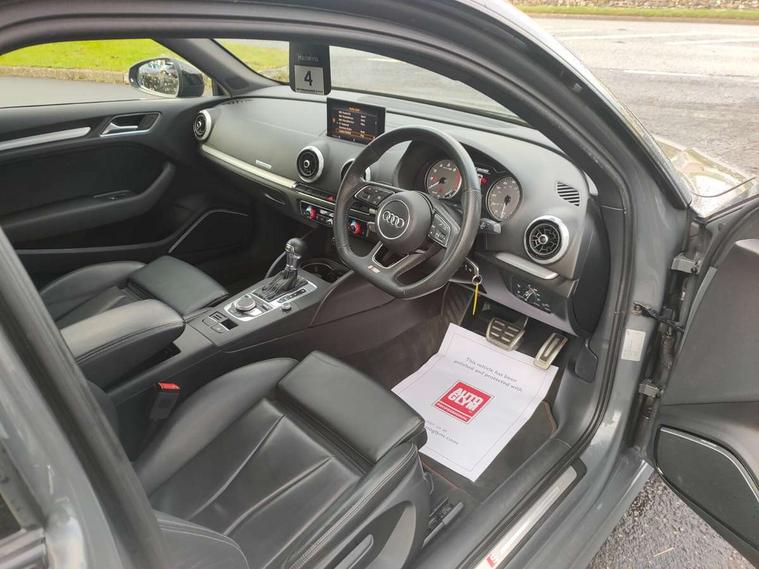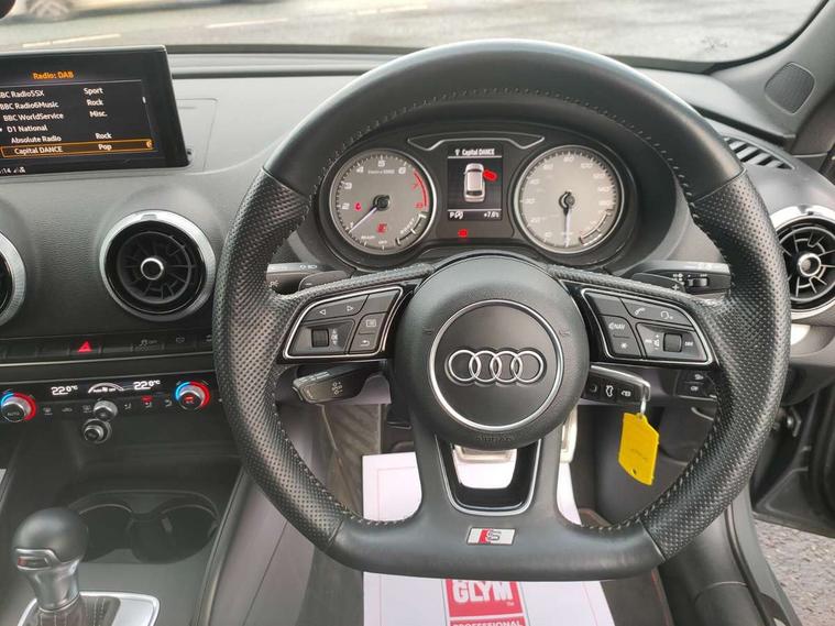 Audi connect, Audi drive select, Audi smartphone interface, Colour driver's information system display, Mobile telephone preparation - bluetooth interface, Progressive power assisted steering, SD card based satellite navigation system, Service interval indicator, Speed limit display, Voice control system, S sports suspension, 2 USB ports, Audi music interface, Auxiliary input socket, Bang + Olufsen advanced sound system, CD player, DAB Digital radio, MMI radio plus with 7" colour MMI screen and MMI controller, Auto dimming rear view mirror with light and rain sensors, Black door mirrors, Black window surrounds, Body colour bumpers with black insert, Body colour roof spoiler, Electric front windows, Electric operated/heated door mirrors, Headlight washers, Heated windscreen washer jets, LED daytime running lights, Matt black radiator grille, Platinum grey radiator grille with double chrome bars, Privacy glass, Rear wiper, S body styling, Twin oval chrome trimmed exhaust tailpipes, 3 adjustable rear headrests, 3 spoke flat bottomed multi-function leather steering wheel, 4 lashing points to secure luggage, Adjustable front armrest, Dual zone electronic climate control, Front and rear interior lights with delay, Front passenger seat isofix location point, Front/rear floor mats, Heated front seats, Height/depth adjustable steering column, Illuminated door sills, Illuminated glovebox, ISOFIX child seat preparation+airbag deactivation, Jack and tool kit, Rock grey headlining, Stainless steel pedals, Steering wheel gearshift paddles, Storage compartment in centre console, Storage compartment under front seats, Storage compartments in doors, Black styling pack - A3/S3, LED interior light pack - A3/RS3, Non smoking pack - A3, Storage and luggage pack - A3/RS3, 3 point seatbelts on all seats, ABS/EBD, Active bonnet, Active front headrests, ASR, Curtain airbags, Driver and passenger side airbags, Driver/Front Passenger airbags, Drivers knee airbag, EDL, Electromechanical parking brake, ESC - Electronic Stability Control + traction control, Front passenger airbag deactivation, Manual rear child locks, Multi-Collision braking, Seatbelt warning, Tyre pressure warning, Warning triangle and first aid kit, Anti theft alarm, Anti-theft wheel bolts, Remote control central locking, Thatcham category 1 alarm + immobiliser, Aluminium air vent surrounds, Aluminium trim elements, Space saver spare wheel,