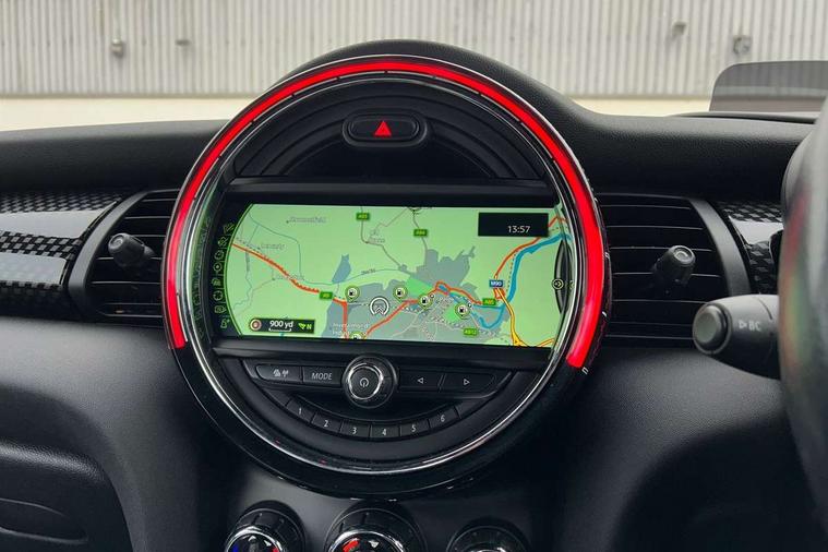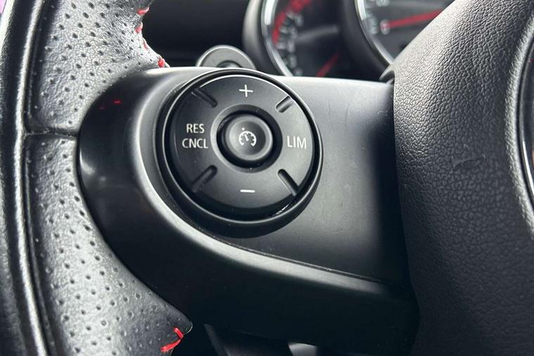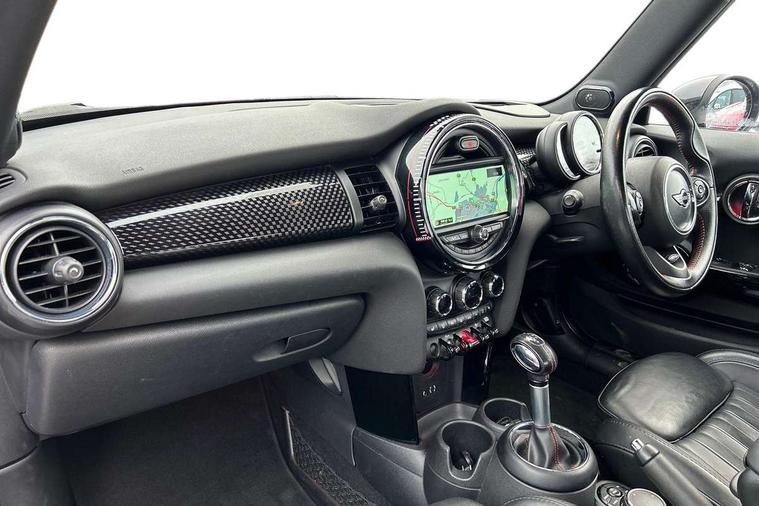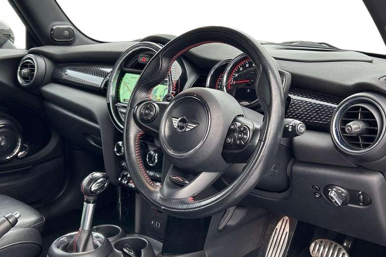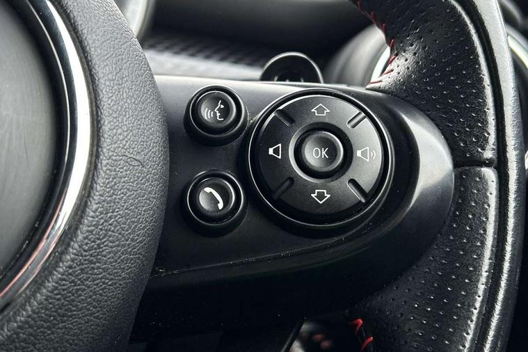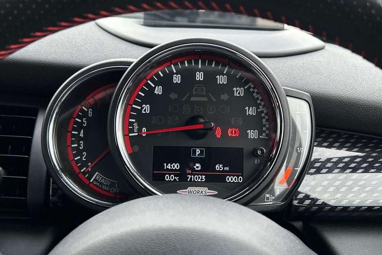 Acoustic seat-belt warning, Brake fluid level warning light, Brake pad wear indicator warning light, DTC - Dynamic traction control, Exterior temperature gauge, Intelligent emergency call, MINI Driving Modes - centre toggle switch to control driving setting (sport, mid and green), MINI TeleServices, Oil level indicator, On board computer, Push button starter, Service interval indicator, Servotronic PAS, Electronic differential lock, Performance Control, Auxiliary input socket, DAB digital radio module, 2 speed wipers+intermittent wipe, Anti dazzle mirror, Anti trapping/one touch open close front windows, Body colour scoop integrated into engine- compartment lid, Body coloured bumpers, Chili red grille bar, Chrome bezels around rear lights and headlights, Chrome door handles, Chrome plated fuel cap, Chrome plated trim on bottom edge of window, Chrome strip on lower grille, Electric front windows, Electrically adjustable door mirrors, Extended wheel arches, Follow me home headlights, Green tinted heat insulating glass, Heated door mirrors/heated windscreen washers, Heated rear window with auto timer, High gloss black tailgate, Honeycomb radiator grille, John Cooper Works roof spoiler, Metal look door sill finishers, Rear wiper, Side scuttles, Twin chromed exhaust pipes, White indicator lights, 2 rear head restraints, 4 boot load lashing points, 6 way manually adjustable passenger seat, 6-way manually adjustable driver's seat, Active carbon filter, Air recirculation system, Anthracite headlining, Auxiliary socket in centre console storage compartment, Centre console storage, Driver's seat height adjuster, Driver/passenger sunvisors, Easy entry seats, Front and rear cupholders, Front head restraints, Front interior light, Front passenger grab handle, Front seat backrest storage nets, Front sports seats, Gear/selector and handbrake in artificial leather, Internal chrome door handles, Isofix child seat preparation, Luggage compartment lighting, Multifunction steering wheel, Passenger seat height adjuster, Reach + rake adjustable steering column, Rear grab handles, Rear storage trays, Split folding rear seats, Storage compartments in doors, Toolkit in luggage compartment, Vanity mirrors, 3 point seatbelts, ABS/EBD, ASC+T, Brake calipers in red, Cornering brake control (CBC), Crash Sensor - activates hazard/interior lighting + unlocks doors, Driver and passenger airbags, Driver/front passenger side airbags, DSC - Dynamic Stability Control, Fuel cut off safety device, Head airbags, Hill start assist, Manual passenger airbag deactivation function, Seatbelt pretensioners, Tyre pressure warning, Ventilated front disc brakes, Drive away door locking, Locking wheel bolts, Remote central locking/doors+fuel cap+tailgate, Second remote key, Thatcham category 1 alarm + immobiliser,