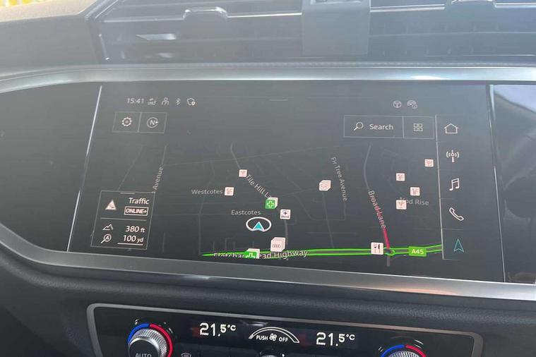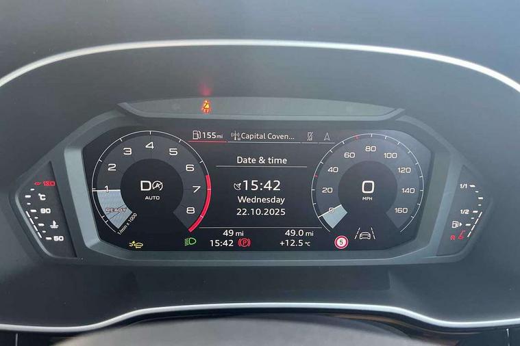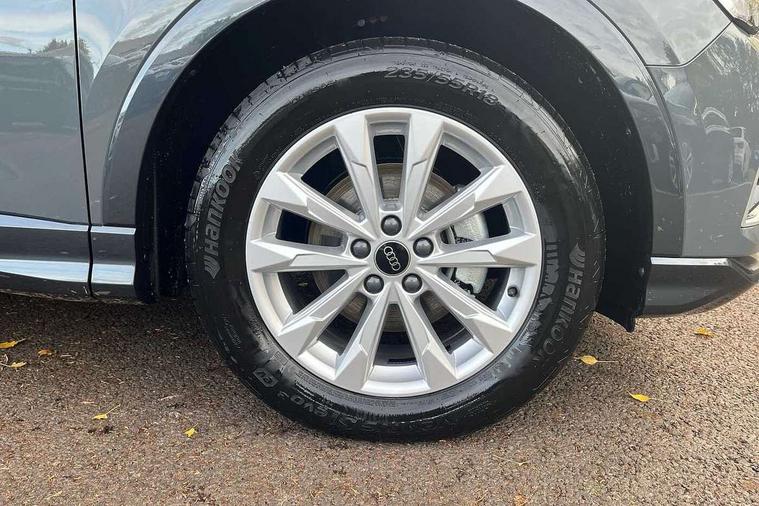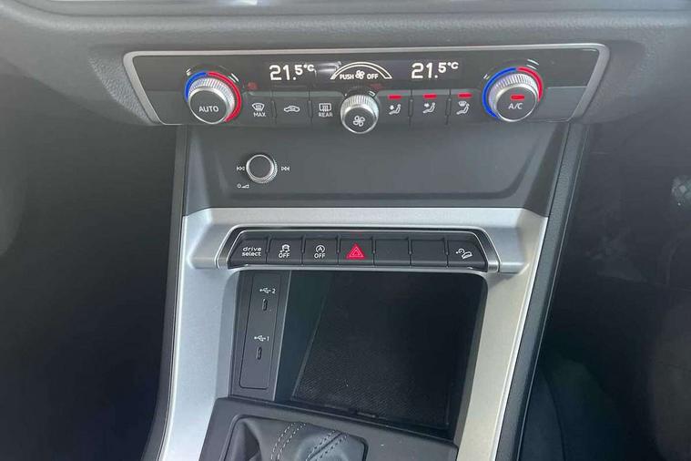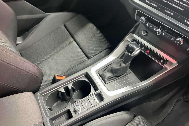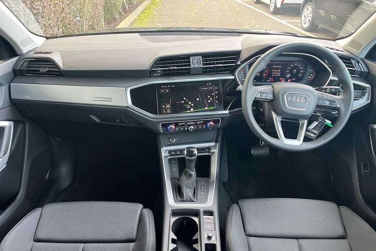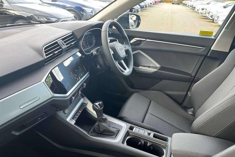 Amazon alexa Integration, Audi connect safety and service, Audi drive select, Audi lane departure warning, Audi Virtual Cockpit - 10.25" display, Bluetooth interface, Camera based traffic sign recognition, Distraction and Fatigue warning, Legal emergency call, MMI Navigation Plus with high resolution 10.1 inch touchscreen colour display, Power operated tailgate, Progressive steering, Service interval indicator, Smartphone interface includes wireless Apple carplay/Android Auto, Start stop system with recuperation, Voice control system with natural language interaction, Standard suspension, 2 USB-C ports with charge and data functions, 6 passive loudspeakers, DAB digital radio module, Acoustic windscreen, Aluminium roof rails, Aluminium window trim, Anthracite black radiator grille, Auto dimming door mirrors, Auto dimming frameless rear view mirror, Electrically folding, adjustable and heated door mirrors with integrated LED side indicators and kerb view function for passenger side, Front and rear bumpers, wheel arch trims and side sill trims in contrasting Manhattan grey paint finish, Front and rear electric windows, Front fog lights, Front side air inlets in matt selenite silver, Front spoiler in matt selenite silver, Grille vertical bars in aluminium silver/Matt, High gloss black finish B and C pillars, LED headlights with LED daytime running lights, LED third brake light, Rain and light sensors, Rear diffuser strip in matt selenite silver, Rear side wing doors, Rear wiper, Variable front intermittent wipers, 12V socket in rear centre console, 3 seat bench in 2nd row, 3 spoke multi-function leather steering wheel, 40:20:40 folding with manual adjustment for 60:40 forwards/backwards position and backrest angle, Black carpet mats, Door sill trims with aluminium inlay, Dual zone electronic climate control, Electric lumbar support, Front and rear floor mats, Front and rear headrests, Front centre armrest, Height and reach adjustable steering wheel, ISOFIX child seat mounting for front passenger with airbag deactivation and outer rear seat including top tether attachment point for outer rear seats, Luggage compartment sill protection in stainless steel, Lunar silver cloth headlining, Manual front seats with height adjustment, Single front passenger seat, Non smoking pack - Q3, 3x3 point rear seatbelts, 6 airbags - Driver, front passenger, curtain and side windows, Audi pre-sense front with pedestrain and cyclist recognition, Electrically operated child locks on rear doors, Electromechanical parking brake, Electronic stabilisation control including ABS, ASR and EDL, Front seatbelt reminder, Hill descent control, Hill hold assist, Pre sense basic, Seatbelt monitoring, Tyre pressure warning, Warning triangle and first aid kit, Anti theft wheel bolts, Immobiliser, Remote central locking, Thatcham approved category 1 anti theft alarm, Aluminium look interior elements, Detail dashboard around MMI touch colour display in glass look, black with surround in aluminium look, Micrometallic silver inlay,