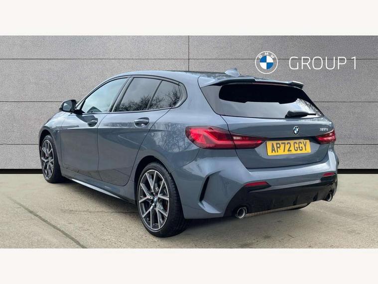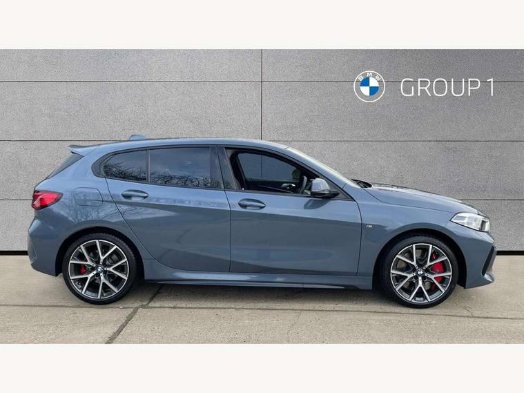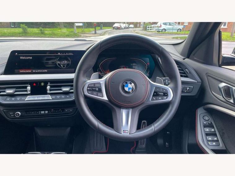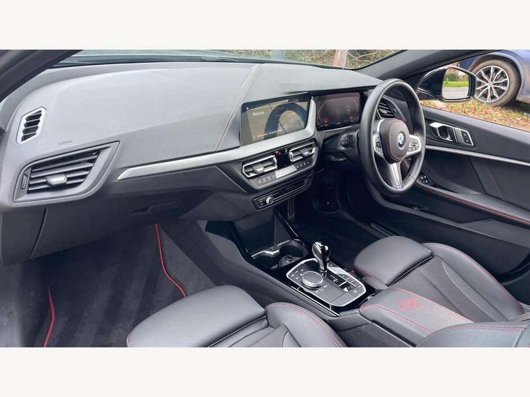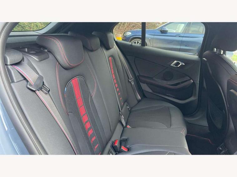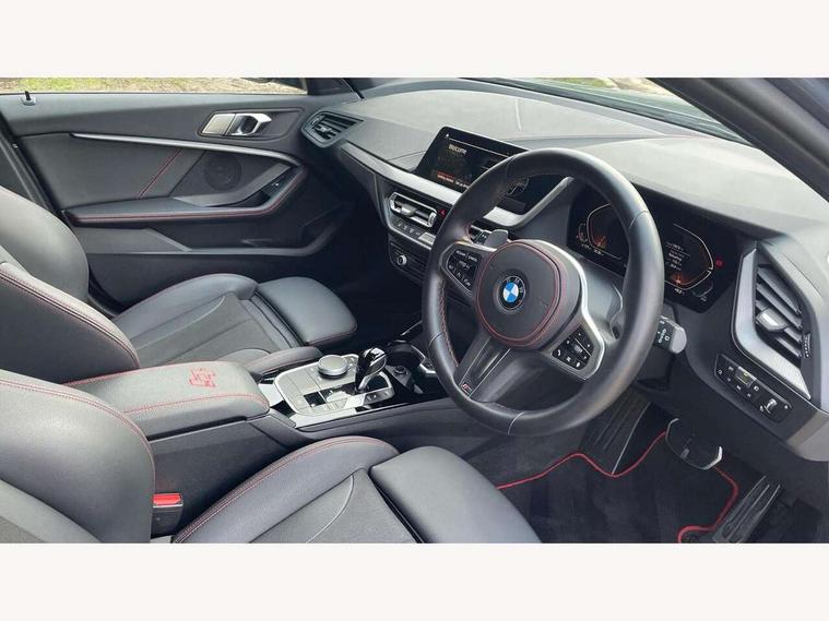 Active guard plus, Attentiveness assist, BMW ConnectedDrive online services, BMW Teleservices, Check Control warning system for monitoring of lights and door/luggage compartment open warning, Cruise control with brake assist, Eco pro mode, Electric power steering with Servotronic steering optimised at all speed ranges, Front axle single joint with specific axle kinematics to minimise drive influences on steering + provide increased rigidity agile driving behaviour, Integrated owners handbook, Lane departure warning system, Oil sensor for level and grade, On board computer, Optimum shift indicator, Personal Profile, Pull away assistant, Rigidly mounted rear subframe - Multi link construction with separate spring / damper configuration and excellent driving characteristics, Speed limit Info including no-overtaking indicator, Speed limiter, Aluminium lightweight construction, Anti roll bar front and rear, Balancer shaft, Double VANOS twin scroll turbocharging system, Drive Performance Control, Eight speed sport automatic transmission with gearshift paddle switches, Electronic differential lock, High precision injection, Larger fuel tank capacity (50 litres), M sport suspension with M128i xDrive specific settings, Petrol Particulate Filter, Twin tube gas filled shock absorbers with degressive characteristic curve, VALVETRONIC engine management, DAB Digital radio, Auto dimming rear view mirror, Automatic headlight beam throw control, Automatic windscreen wipers and automatic headlight, Black chrome tailpipe finishers, BMW individual high gloss shadow line with extended content, Body colour door handles, Body colour mirror caps, Body colour roof trims, Chrome 'M' logo side designation, Chrome kidney grille frame with Satin Aluminium struts, Direction indicator side lights in exterior mirrors, Fading support, Folding side mirrors with auto dimming/folding wing mirrors with auto dimming, Follow me home headlights, Front and rear bumper system with replaceable deformation elements, Front and rear electric windows with open and close fingertip control, anti trap facility and comfort closing, Front door sill finishers in black plastic with M designation in metallic look, Green tinted heat protection glazing, Heated, electrically adjustable exterior mirror aspheric on driver side, convex on passenger side, High gloss shadowline window frame, Recess cover mirror frames and B/C pillar embelisher trim, High level third brake light, Integrated front windscreen with washer jets, Kidney frame and struts in high gloss black extended, LED daytime running lights, LED eyebrow turn indicators, LED front fog lights, LED Headlights, Lightweight engineering, Matt black air guide grilles, Matt black wheel arch trim, Model designation on electric bootlid, Nearside reverse light in rear light cluster, Preparation for high beam assistant, Rear fog lights, Rear side wing doors, Rear window wiper, Shark fin antenna, Trailer stabilisation logic, Visible VIN plate, Welcome lighting, 12V power socket in front centre console with blanking plug, 3 rear seat head restraints, 3 seat bench in 2nd row, Anthracite headlining, Black boot net with lashing eyes, Cargo function on 2nd seat row, Centre armrest in black/red highlight including embroidered 'ti' designation in red, Child seat ISOFIX attachment for two outer rear seats and front passenger seat with anchorage points, Conditioned based service, Driver and front passenger seat heating, Floor mats with red binding, Folding rear clothes hook, Four grab handles integrated in roof lining, Front and rear door pockets with bottle holders, Front and rear side armrest integrated into door trim, Front armrest, Front sports seats, Glove compartment, Height adjustable front head restraints, Instrument panel top section , door armrests and door panels in black/red highlight, Luggage compartment for bag hooks on left and right, foldable luggage compartment liner and four lashing eyelets, Manual adjust steering wheel, Multi-function controls for steering wheel, Single front passenger seat, Storage compartment in centre console, Sun visors with vanity mirrors and insert tab, Three spoke M sport design multi function leather steering wheel in unique red stitching, Two front centre console cupholders, Two zone automatic air conditioning, Additional interior lighting pack - 1 Series, BMW live cockpit professional pack- 1 Series, Connected pack professional - 1 Series, Interior lights pack - 1 Series, M Sport exterior styling aerodynamics pack - 1 Series, 2 tone horn, 3 point seatbelts on all seats, front pyrotechnic belt tensioners, stopper and belt force limiters, rear coded belt buckles, Airbags - Front driver/passenger, front and rear curtain head protection, front side, manual deactivation of front passenger airbag, Anti lock braking system (ABS) with brake assist, BMW emergency call, Brake drying, Braking readiness, Child proof locking system in rear door, City braking function, Comfort modes, Cornering brake control, Crash sensor activating central locking release, hazard warning lights, fuel cut off, interior lighting + activation of safety battery terminal clamp, Driver and front passenger seat belt security check, Dynamic stability control + (DSC+), Dynamic Traction Control - DTC, Electrically operated hand brake including automatic hold function, Front and rear disc brakes, M Sport brakes with red calipers, M Sport seatbelts, Seatbelt warning, Side impact protection, Tyre pressure monitoring system, Warning triangle and first aid kit, Central locking switch for all doors, fuel filler cap and luggage compartment, Deadlocking function system to all doors, Drive away locking system on all doors and luggage compartment with de-activated in iDrive settings, Locking wheel bolts, Remote control with integrated key with High-gloss Black inlay and M designation and 1 button for open/ close lock, window, open luggage compartment, Start/stop button illuminated in centre console with keyless e