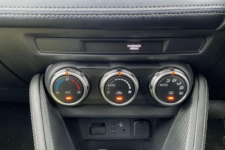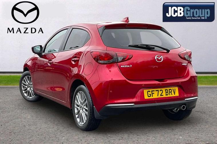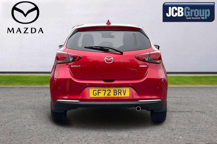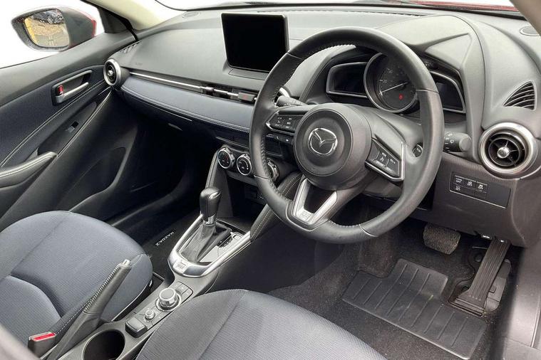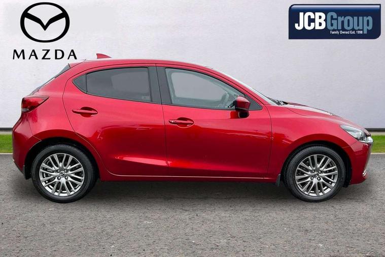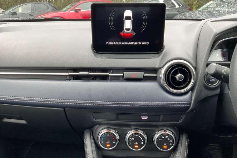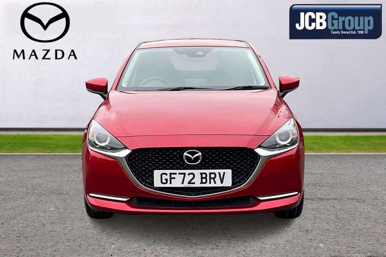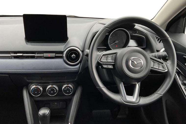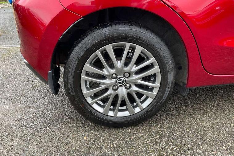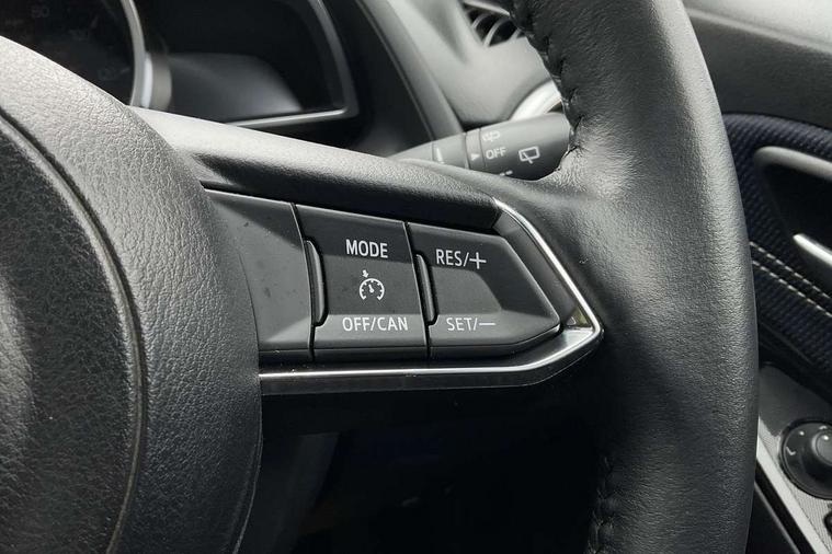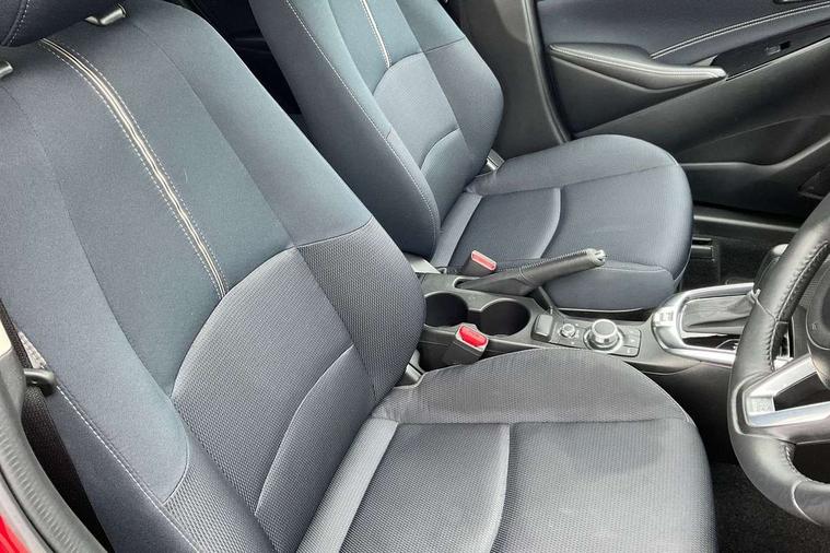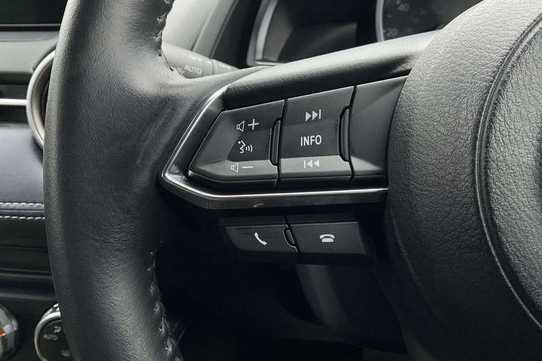 Adjustable speed limiter, Analogue speed display meter, Cruise control, Digital instrument cluster, Digital rev counter, Drive mode selection and paddle shift, E-call, Emergency stop signalling system, Engine start/stop button, Integrated bluetooth, Lane departure warning system, Lane keep assist, Mazda connect with 8" colour touch screen, Navigation system, PAS, Rear parking sensor, Service indicator, Trip computer, Wireless Apple CarPlay and wired Android Auto, i-stop, AM/FM/DAB radio with 6 speakers with USB and AUX inputs, Multimedia Commander including separate volume dial, Steering wheel mounted audio/bluetooth controls, Auto dimming rear view mirror, Auto headlight levelling, Body colour door mirrors, Body coloured front bumper with bright lower bezel, Body coloured rear bumper with bright lower mouldings, Chrome exhaust tailpipes, Chrome finish signature wing on front grille, Chrome front lower bezel, Chrome rear lower bezel, Coming/leaving home lighting function, Dusk sensing headlights, Electric adjustable/heated/folding door mirrors, Electric front/rear windows with one touch auto up/down for driver's window, Gloss black front grille, LED Headlights, LED indicator lights, LED third brake light, Privacy glass, Rain sensing front wipers with adjustable sensitivity and speed, Rear side wing doors, Rear wiper, Shark fin antenna, Signature LED daytime running lights, 3 seat bench in 2nd row, 60/40 split rear seats, Climate control air conditioning, Cloth upholstery, Driver, Front passenger and two rear grab handles with coathooks, Drivers seat manual slide recline and height adjustment, Drivers/front passengers covered vanity mirrors and drivers ticket holder, Folding rear seats, Front centre storage with two cupholders, Front head restraints, Front passenger and driver door pockets, Front passenger seat manual slide, recline and height adjust, Front passenger seatback pockets, Gear shift indicator, Glovebox, Interior courtesy light with integrated spotlight, ISOFIX child seat anchorage points attached on outer rear seats, Leather handbrake, Leather steering wheel and gear knob, Luggage compartment light, Satin silver dials, Single front passenger seat, Three height adjustable rear head restraints, Tilt/telescopic adjustable steering wheel, 2x3 point front seatbelts with pre-tensioners, 3 point seatbelts on all rear seats, Anti-lock braking system (ABS), Autonomous emergency braking, Collision mitigation braking system, Dynamic stability control + Traction control, ESP, Front and rear curtain airbags, Front driver, passenger and rear seat seatbelt warning, Front dual stage driver and single stage front passenger airbags, Front side airbags, Front smart city brake support, G-Vectoring control plus, Hill launch assist, Manual child lock in rear doors, Passenger airbag cut-off switch, Tyre pressure monitoring system, Deadlocking system, Immobiliser, Power door locks, Remote central locking, Smart keyless entry, Thatcham accredited alarm and immobiliser, Dark blue soft touch dashboard, 16" Bright finish alloy wheels, Emergency tyre repair kit,