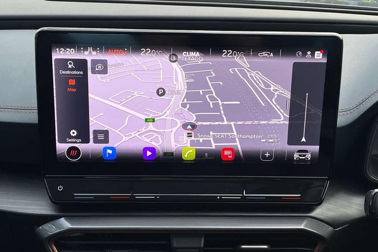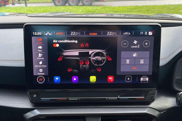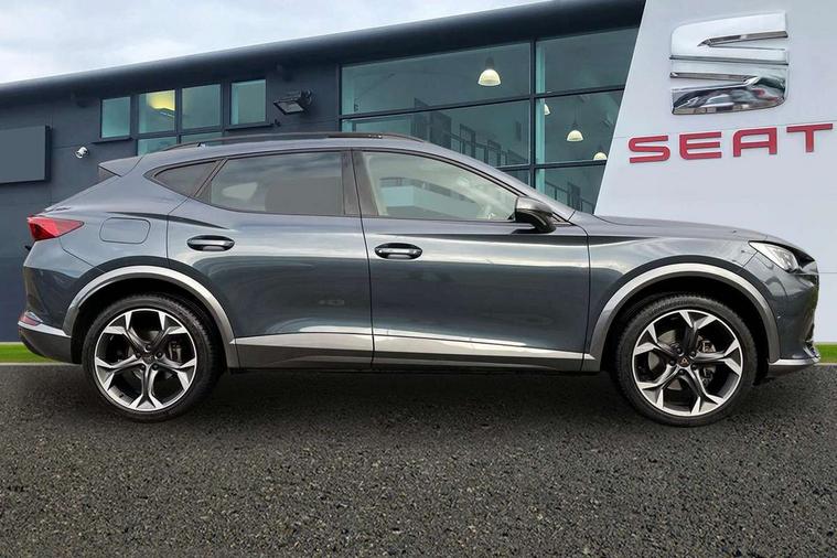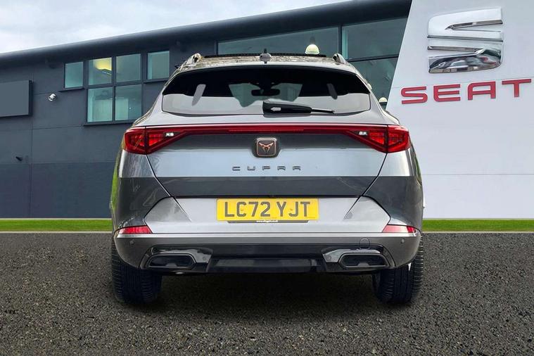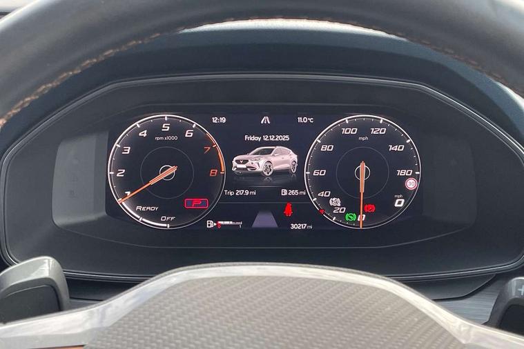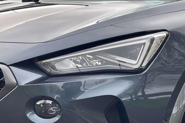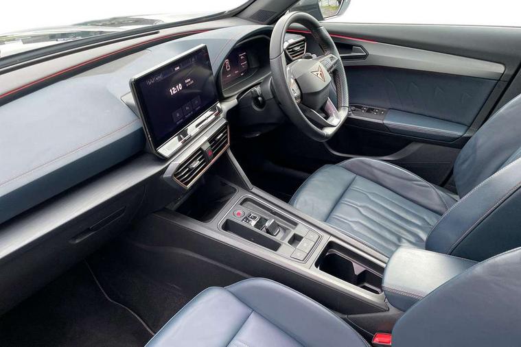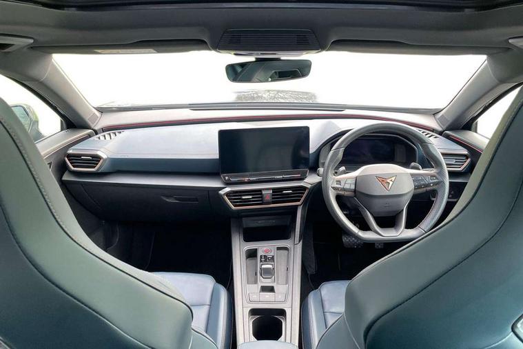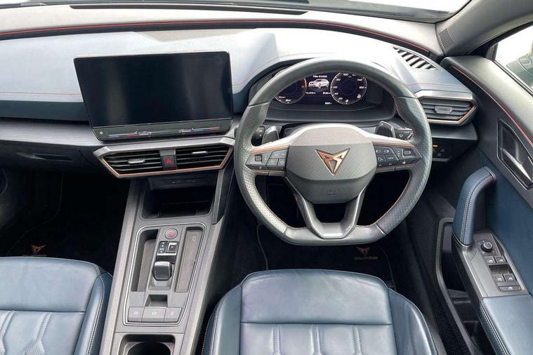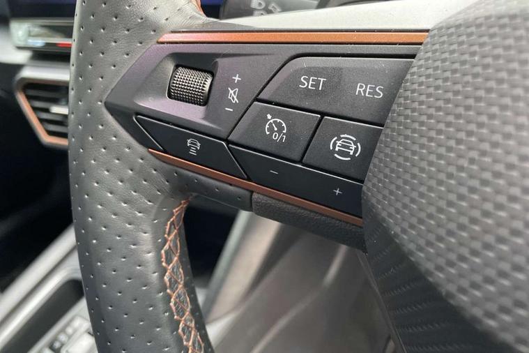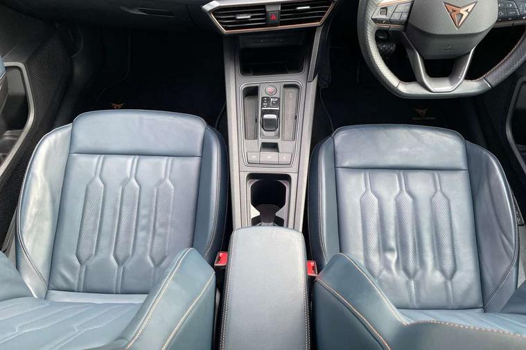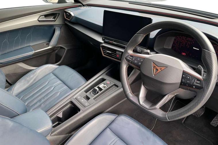 Digital cockpit and configurable dashboard, Driver alert system, Driving profile selection, Forward collision warning with automatic braking, Lane assist, Navigation system with 12'' Touchscreen Display, Park assist (inc front/rear parking sensors), PAS, Predictive adaptive cruise control with speed limiter, Rear view camera, RPM, trip computer, outside temp gauge, instrument light brightness, low fuel warning light, lights on reminder, gearshift indicator, Service interval indicator, Start/stop system with regenerative braking, Voice control system, Wireless apple carplay, Wireless phone charger, Electronic locking differential and dynamic traction support, Standard suspension, 2 front and 2 rear USB type C sockets, Auxiliary input socket, DAB radio, Auto dimming rear view mirror, Body colour door handles, Body coloured bumpers, Dark grey wing mirror, Daytime running light with automatic headlight control and coming home feature, Dynamic headlight range control, Electric front/rear windows, Electrically adjustable heated and folding door mirrors with memory function, Front fog lamps with cornering function, Gloss black roof rails and window surrounds, LED Headlights, LED Taillights with dynamic indicator, Rain sensing wipers, Rear diffuser with black simulated exhaust pipes, Rear side wing doors, Rear wash/wipe, Third brake light, Tinted rear windows, Welcome lights, 12v power supply in centre console, 12V socket, 12v socket in loadspace, 2 front and 2 rear reading lights, 230V socket, 3 seat bench in 2nd row, 60/40 split rear bench seat with armrest and mechanical seat release, Black headlining, Dust/pollen filter, Front and rear head restraints, Front centre armrest, Height/reach adjust steering wheel, Illuminated interior front door sills, Illuminated sunvisor with mirror, Isofix, Leather multi function heated steering wheel with gear shift paddles, Luggage tie-down hooks, Single front passenger seat, Three zone climate control with control panel in rear, Variable luggage/load compartment floor, Wraparound lighting, Genuine Nappa leather Pack - Cupra, 3 point seatbelts on all rear seats, ABS, Brake control system - ESC and brake booster, Child proof door locks, Driver and front passenger airbags with front passenger airbag de-activation, Electronic parking brake, Front and rear disc brakes, Front side curtain airbags, Hill hold control, Public e-call, Seat belt reminder for front and rear seats, Tyre pressure monitoring system, Anti theft alarm system, Keyless entry and start system (KESSY), Locking wheel bolts, Copper and aluminium interior detailing, 19" 'Exclusive' machined sport matte black and silver alloy wheels,