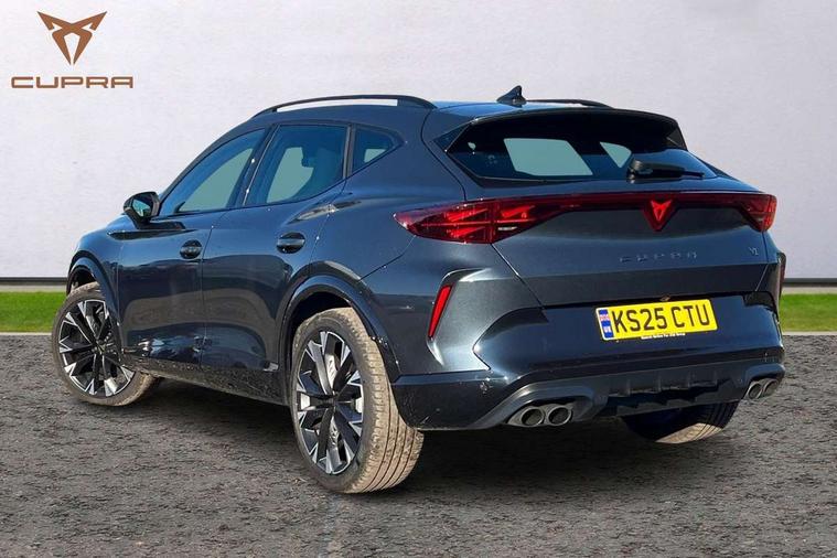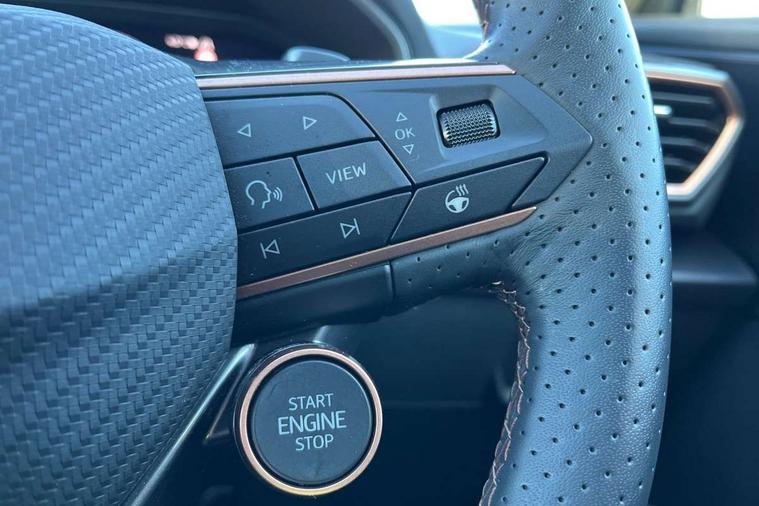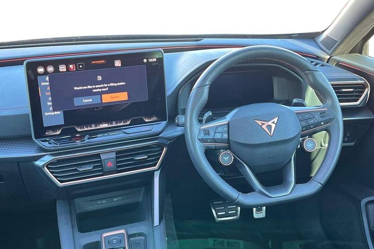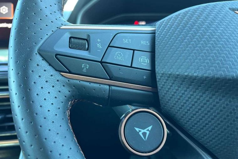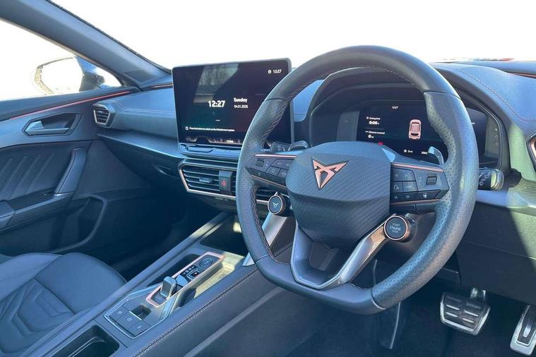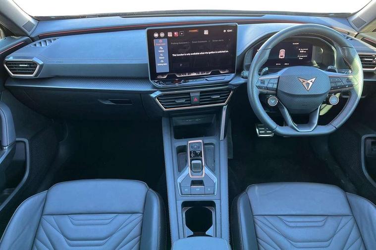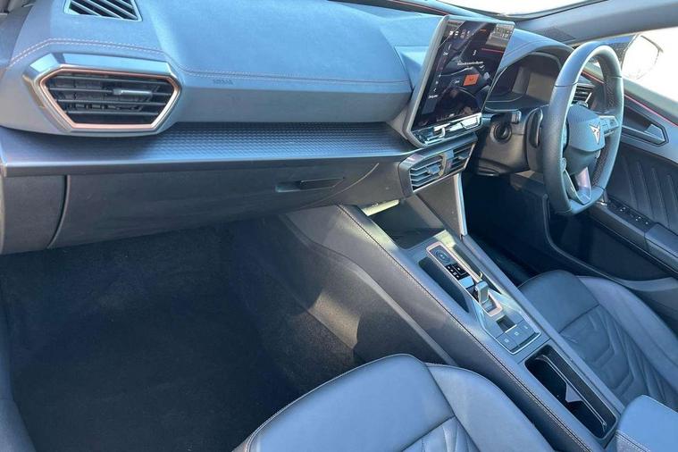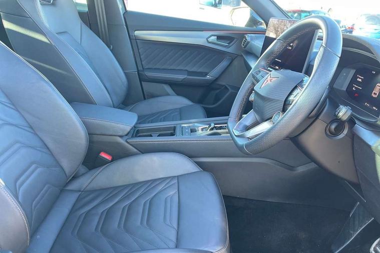 10.25" digital cockpit and configurable dashboard, Adaptive cruise control with follow-to-stop and speed limiter, Advanced driver alert system, Advanced lane assist with semi-automatic vehicle control in a medical emergency and traffic jam assist, Dynamic chassis control with driving profile selection (Comfort, Sport, CUPRA, Individual), Dynamic road sign display, Emergency steering support with turn assist, Forward collision warning with automatic braking, Full link phone integration, Intelligent park assist, RPM, trip computer, outside temp gauge, instrument light brightness, low fuel warning light, lights on reminder, gearshift indicator, Service interval indicator, Side and exit assist, Speed sensitive power steering, Start/stop system with regenerative braking, Top view camera, Virtual pedal and electric tailgate, Voice control system, Wired Android Auto, Wireless apple carplay, Wireless phone charger, Adaptive chassis control with continuous operation, CUPRA sport suspension, Electronic locking differential and dynamic traction support, 2 front and 2 rear USB type C sockets, Media system with navigation, 12.9" touchscreen display, voice control, DAB, steering wheel mounted controls, Auto dimming rear view mirror, Body colour door handles, Body coloured bumpers, Dark grey wing mirror, Daytime running light with automatic headlight control and coming home feature, Door panel ambient lighting, Dynamic headlight range control, Electric front/rear windows, Electrically adjustable heated and folding door mirrors with memory function, Gloss black roof rails and window surrounds, High beam assist, LED 3rd brake light, LED front fog lamps with cornering function, LED Taillights with dynamic indicator, Matrix LED headlights with multifunction camera, Rain sensing wipers, Rear diffuser with twin exhaust pipe on each side, Rear fog lights, Rear side wing doors, Rear wash/wipe, Tinted rear windows, Welcome lights (within exterior mirror housing), 12V socket, 2 front and 2 rear reading lights, 3 seat bench in 2nd row, 60/40 split rear bench seat with armrest and mechanical seat release, Black headlining, Black interior roof lining, Cupra sports pedals, Dust/pollen filter, Electrically adjustable front seats with lumbar support and memory function, Front and rear head restraints, Front centre armrest, Heated front seats, Heated supersports multifunction leather steering wheel with satellite buttons and gear shift paddles, Height/reach adjust steering wheel, Illuminated aluminium doorsteps, Illuminated interior front door sills, Illuminated sunvisor with mirror, Isofix, Leather dashboard, door insert and side trim panel, LED smart wraparound lighting, PVC/Leather upholstery, Satellite steering wheel, Single front passenger seat, Storage pockets on rear of front seats, Three zone climate control with control panel in rear, Variable luggage/load compartment floor, 3 point seatbelts on all rear seats, ABS, Brake control system - ESC and brake booster, Child proof door locks, Driver and front passenger airbags with front passenger airbag de-activation, Electronic parking brake, Front and rear disc brakes, Front side curtain airbags, Hill hold control, Pre-crash front and rear seat belt tensioner, window closure and hazard lights, Public e-call, Seat belt reminder for front and rear seats, Tyre pressure monitoring system, Anti theft alarm system, KESSY Advanced - Keyless start, keyless entry with SAFELOCK, Locking wheel bolts, Copper and aluminium interior detailing, 19" Artic machined sport black and silver alloy wheels, Breakdown and tool kit,