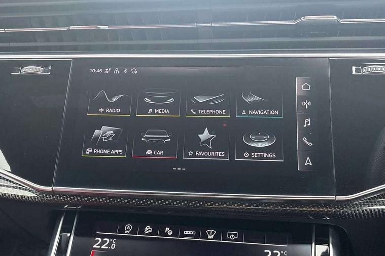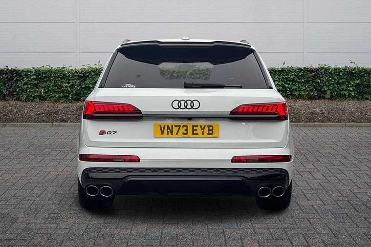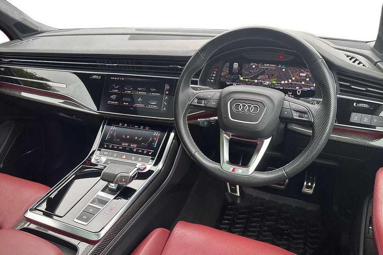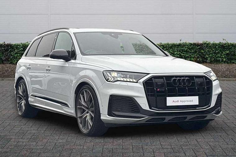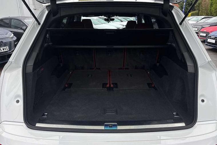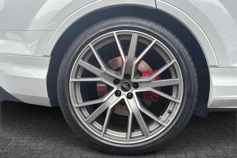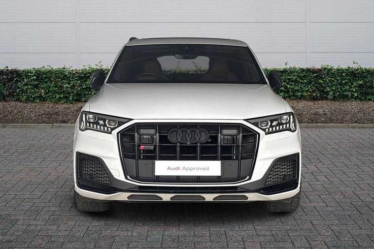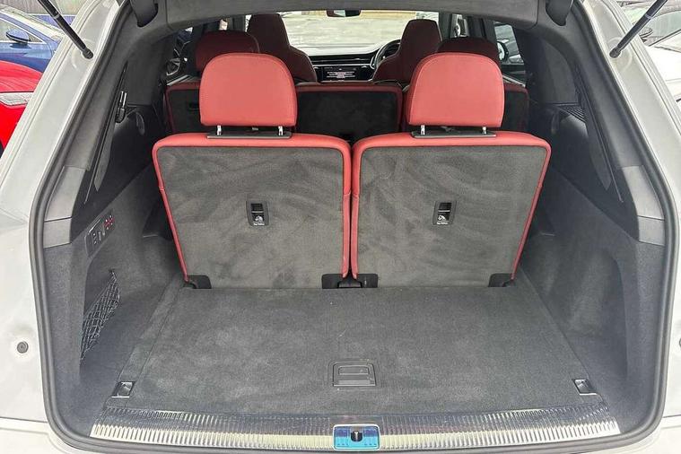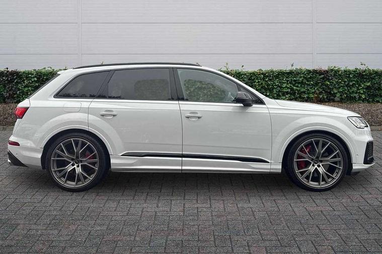 360 degree view camera, Audi connect safety and service (e-call), Audi connect with Amazon Alexa Integration, Audi drive select (Auto, Comfort, Dynamic, Efficiency, Individual, Off-road and All road), Audi phone box light with wireless charging, Audi virtual cockpit plus, Bluetooth interface, Camera based traffic sign recognition, Head up Display, MMI navigation plus with MMI touch screens includes 10.1" and 8.6" screens with haptic feedback, Natural voice recognition, PAS, Power door closure, Power operated tailgate, Smartphone interface includes wireless Apple carplay/Android Auto, Start/stop system, 48V Mild hybrid technology, 85 litre fuel tank, Electromechanical active roll stabilisation, Quattro all wheel drive with self locking centre differential, Quattro with sport differential, S specific adaptive air sport suspension, Audi music interface - front 2 USB-C ports with charger and data functions, Bang + Olufsen premium sound system, DAB digital radio module, 3rd brake light, Adaptive windscreen wipers with integrated washer jets, Audi Beam uses LEDs to project Audi logo onto the ground as you exit your SQ7, Audi HD matrix LED headlights with Audi laser light + dynamic front and rear indicators, Auto dimming frameless rear view mirror, Black roof rails, Electrically adj heated/folding + automatically dimming exterior mirrors with memory + automatic kerb side function for passenger side exterior mirror, Gloss black finish for exterior Audi rings and SQ7 logos, Headlight washers, Heat insulating glass in windshield, Integrated LED indications in door mirrors, LED daytime running lights, LED rear tail lights, Privacy glass - dark tinted rear and rear side windows from B-pillar backwards, Rear side wing doors, Rear wiper, S specific rear bumper with 4 exhaust pipes, 2 seat bench in 3rd row, 3 seat bench in 2nd row, 3 spoke heated leather multi-function sport steering including paddle shift, 4 zone deluxe automatic climate control, 7 seat layout with ISOFIX points for the front passenger seat and rear passenger seat, Ambient lighting in surfaces and edges, Black dinamica headlining, Comfort front centre armrest, Contour lighting accentuates lines and joint contours, Double sun visors with illuminated vanity mirrors, Electric adjustable front seats/backrest bolsters, lumbar support, memory functionality, Electric steering wheel adjustment, Folding rear seats, Front head restraints, Front/rear floor mats, Heated front seats, Illuminated door sill trims with S logo, LED glare-free lights, Luggage compartment sill protection in stainless steel, Manual sunblind for the rear side windows and manual sunblind for the rear window, Rear head restraints, Seat ventilation and massage function in the front, Single front passenger seat, Stainless steel pedals, Valcona leather upholstery with front super sport seat S embossed logo, Anthracite black styling pack - Q7/SQ7, City assist pack - Q7, Extended leather pack - SQ7, Technology Pack Pro S - SQ7, Tour pack with Adaptive cruise assist - Q7, 3 point seatbelts on all rear seats, Audi pre sense front, Child locks on rear doors, Driver and front passenger, front side and curtain airbags, Electromechanical parking brake, Electronic Stabilisation Control (ESC) including ABS, ASR and EDL, Extended pedestrian protection measures, Hill hold assist, Seatbelt monitoring, Tyre pressure loss indicator, Warning triangle and first aid kit, Anti theft alarm, Anti-theft wheel bolts and wheel loosening detection, Remote central locking, 22" 5-V Spoke aluminium star design audi sport matt grey with gloss turned finish alloy wheels, Tool kit, Tyre repair kit,