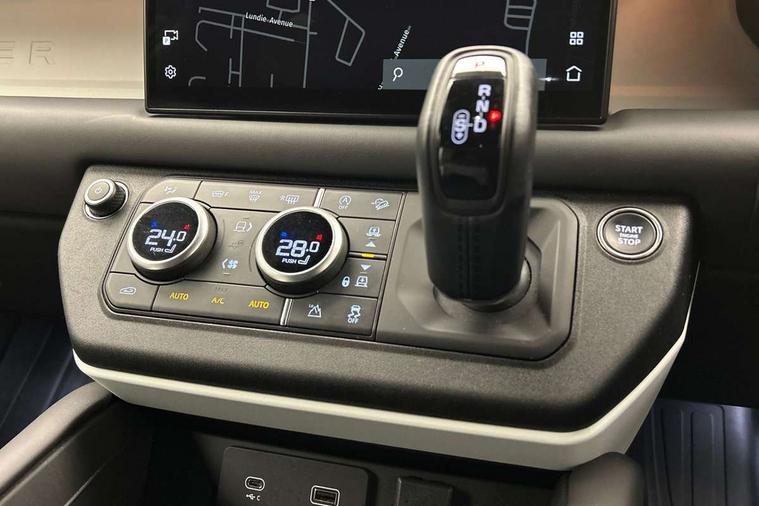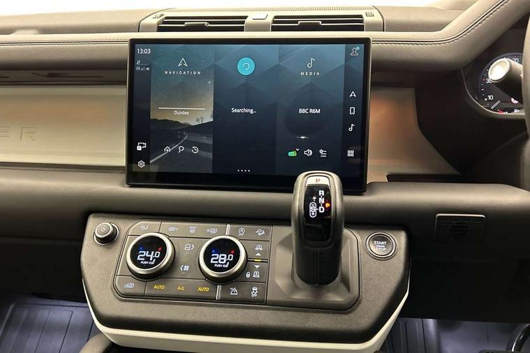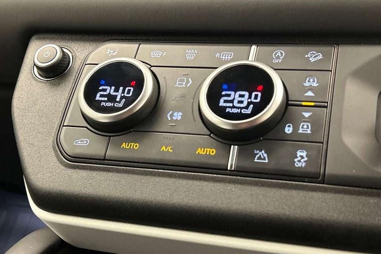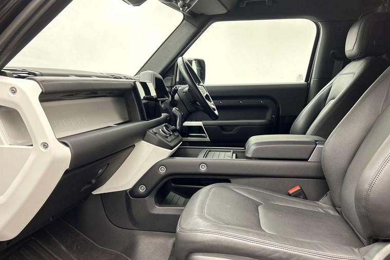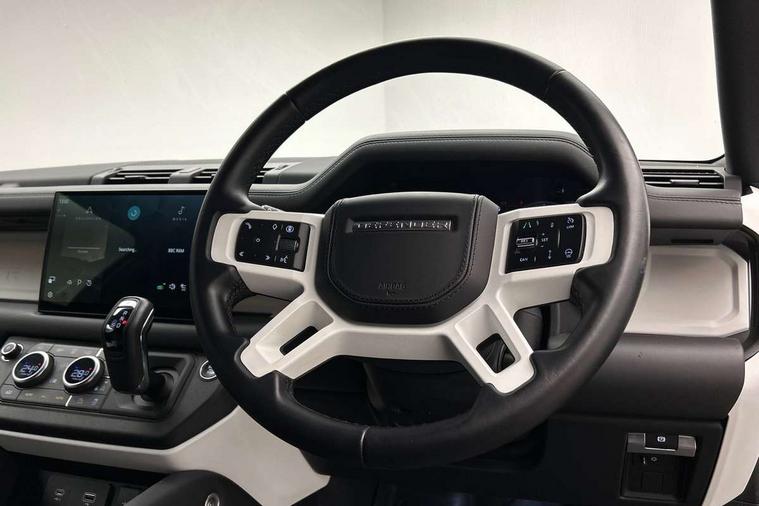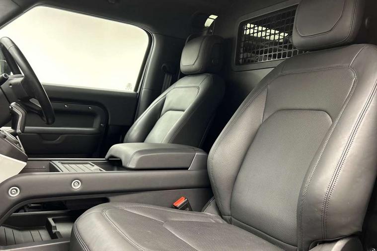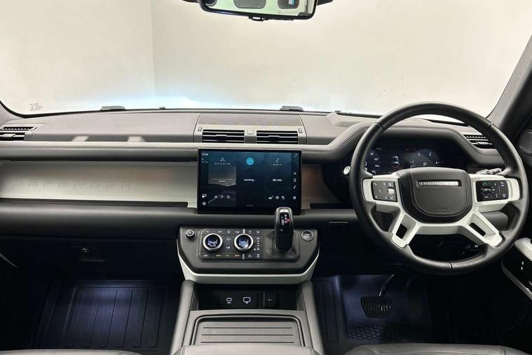 Customer Configurable Autolock, 11.4" touchscreen, 360 parking aid, 3D Surround Camera with 360 View, 180 Rear View, Front Traffic Detection, Forward Vehicle Guidance, Tow Hitch Assist and clear sight Ground View, Adaptive cruise control, Blind spot assist, Brake Hold, Driver condition monitor, Electric power assisted steering (EPAS), Lane keep assist, Low traction launch, Pivi pro connected, Rear collision monitor, Rear traffic monitor, Traffic sign recognition adaptive speed limiter, Trip computer, Tyre pressure monitor, Wade Sensing, Android Auto, Apple CarPlay, DAB Radio (Digital Audio Broadcasting), Meridian 280W sound audio system with 7 speakers with subwoofer, Alpine lights, Assisted tailgate, Auto High Beam Assist, Automatic headlight levelling, Automatic headlights and rain sensitive front wipers, Centre high mounted stop light, ClearSight interior rear view mirror, Electric heated/power fold door mirrors with approach lights and auto dimming driver side, Electric windows with one touch open/close and anti-trap, Exterior signage panel, Follow me home lighting, Front fog lights, Heated rear window with timer, Heated windscreen, LED tail light, Privacy glass, Puddle lights, Rear fog lights, Rear wash wiper, Side-hinged tailgate, Standard roof, Standard tread plates, 14 way heated and cooled electric adjustable memory front seats with 4 way manual headrests, Additional lashing points, Dual zone climate control, Durable rubber cabin flooring, Electric adjustable steering column, Footwell lights, Full height bulkhead behind row 1 seats, Glovebox storage, High sided rubber mats, Loadspace cover, Loadspace hooks, Loadspace rubber mat, Overhead stowage for sunglasses, Rear centre headrest, Rear reading light, Standard seating configuration, Sunvisors with illuminated vanity mirrors, Twin front cupholders with cover, Upgraded loadspace LED lighting, Online pack - Defender with data plan, Brake pad wear indicator, Electronic traction control, Emergency braking, Front airbags, with passenger seat occupant detector, Power operated child locks, Remote for (e-Call, Optimised assistance call, InControl app, Climate, beep and flash and door), Seat belt reminder, Intrusion sensor, Keyless entry system, Locking wheel nuts, 8 speed automatic transmission, ABS and EBA, All wheel drive, CBC - (Cornering brake control), Dynamic stability control, Electronic brake force distribution, Electronic park brake, Gradient acceleration control, Hill Descent Control, Hill start assist, Particulate filter (DPF), Push button start, Roll stability control, Trailer stability assist, Twin speed transfer box (high/low range), Extended leather upgrade,
