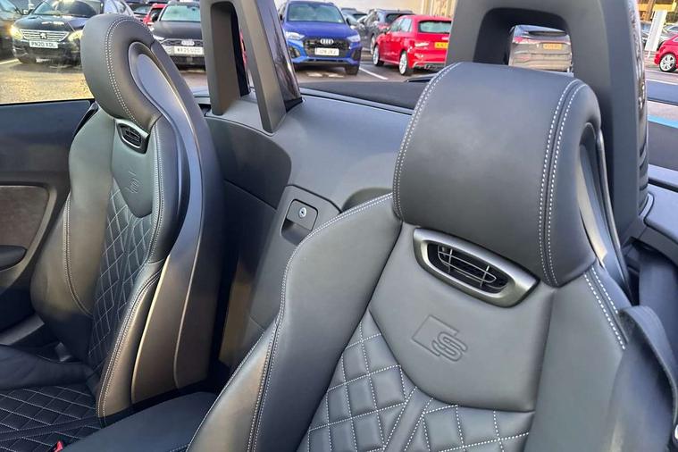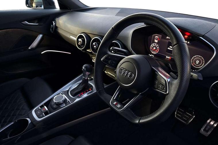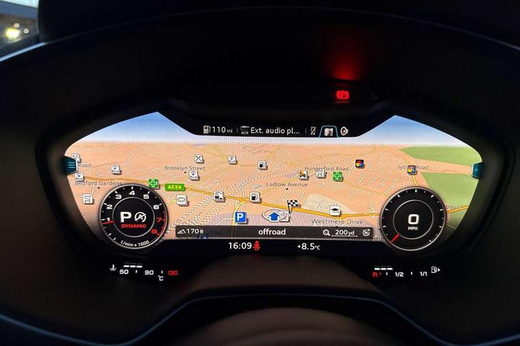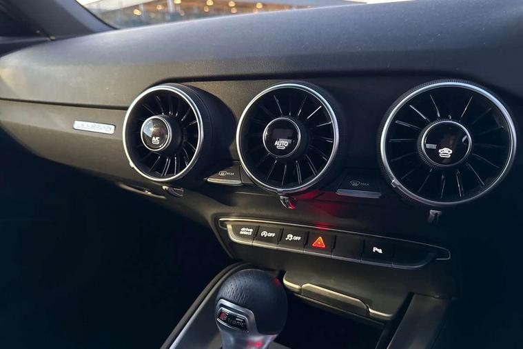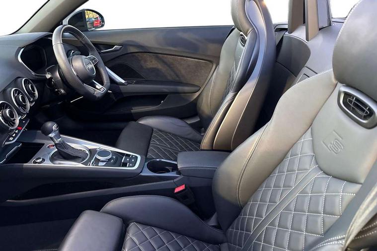 Audi drive select with 4 Pre configured modes, Audi smartphone interface, Cruise control + speed limiter, Emergency call service, MMI touch panel, Mobile phone preparation with bluetooth interface, Progressive power assisted steering, Seat belt microphone, Service interval indicator, Start/Stop system with energy recuperation, TP memo, Sports suspension, AM/FM radio, Bluetooth audio streaming, DAB Digital radio, MMI Radio with CD player and SD/XC card slot, Auto dimming rear view mirror, Auto headlight range control, Black chrome tailpipe, Electric folding door mirrors, Electric front windows, Electrically adjustable and heated door mirrors with integrated LED side indicators, Electrically operated wind deflector, Front fog lights, Fully automatic acoustic hood, Heat insulating glass in windshield, Heat reflecting windows, LED 3rd brake light, LED daytime running lights, LED headlights with LED rear lights + dynamic rear indicators, Light and rain sensors, Rear boot, 12V socket, 3 spoke flat bottomed high multi-function leather sport steering wheel with gearshift paddles, 4 way electric lumbar support for driver and front passenger, Black headlining, Black roll bar, Contrasting silver stitching in steering wheel, Door sill trims, Extended aluminium look with stainless steel pedals, Front centre armrest, Front passenger seat, Front super sports seats, Heated front seats, Height/reach adjust steering wheel, Integrated head restraints, ISOFIX child seat mounting for front passenger seat with airbag deactivation, Manual adjustment of seat height, fore/aft position, seat angle, seat depth and backrest angle, Perforated leather gearknob in black, Tool kit, Black styling pack - TT, Non smoking pack - TT/TT RS, 3 point front seat belts, ABS, ASR traction control, Driver and front passenger airbag with front passenger airbag deactivation, EDL traction control, Electromechanical parking brake, ESP, First aid kit, Front side airbags, Hill hold assist, Seatbelt warning, Tyre pressure loss indicator, Warning triangle, Anti theft alarm, Anti theft wheel bolts, Immobiliser, Keyless Go, Remote central locking, Matt brushed aluminium inlays, 20" 10 Y spoke gloss black diamond cut alloy wheels, Tyre repair kit,