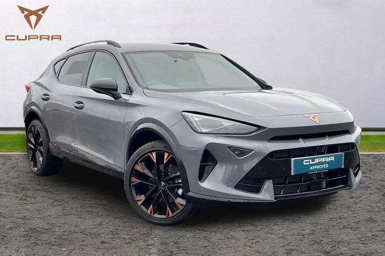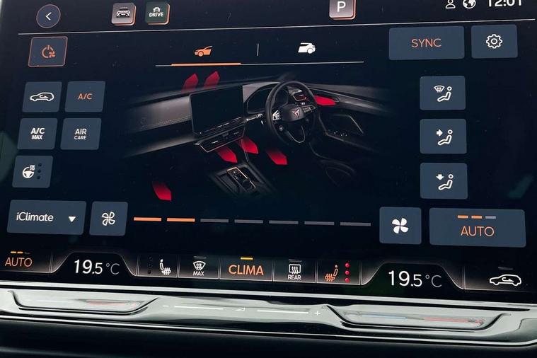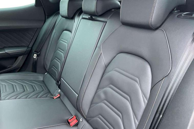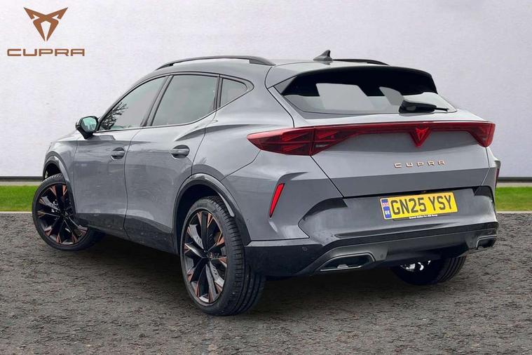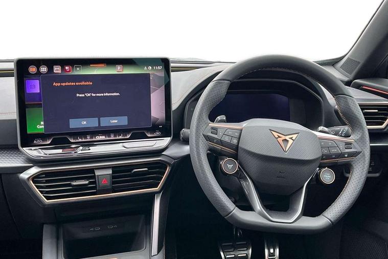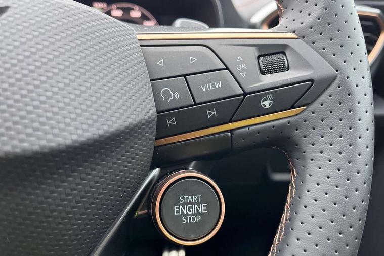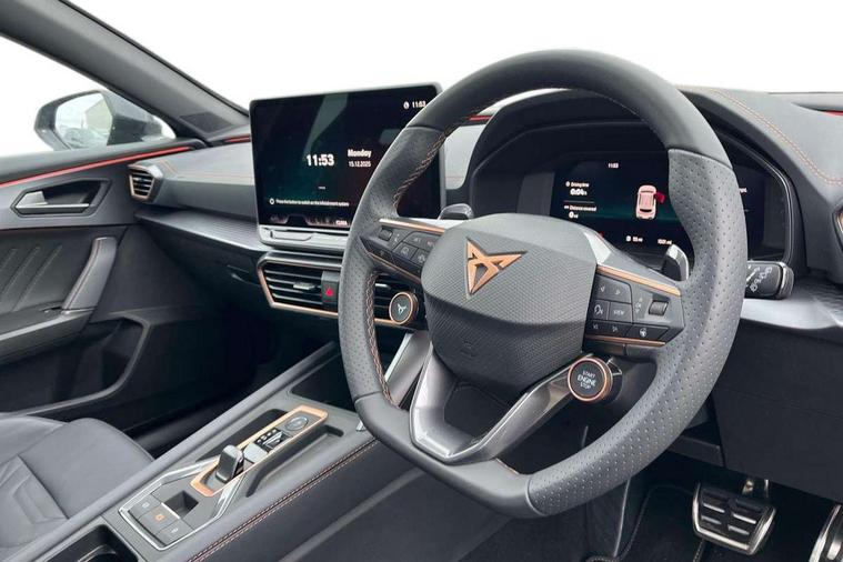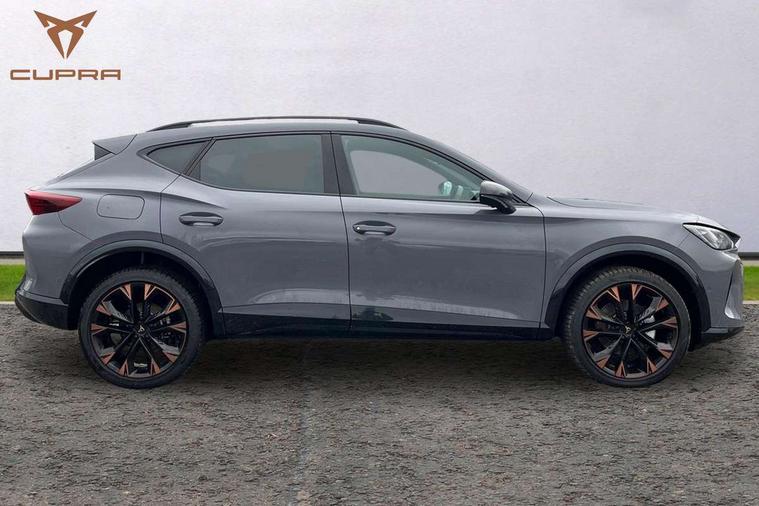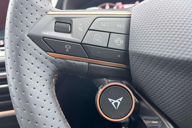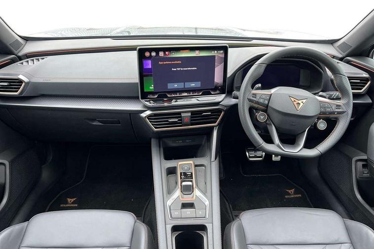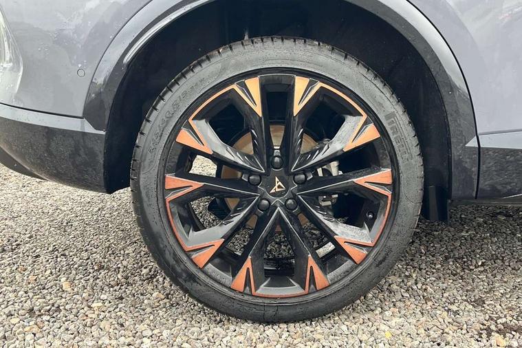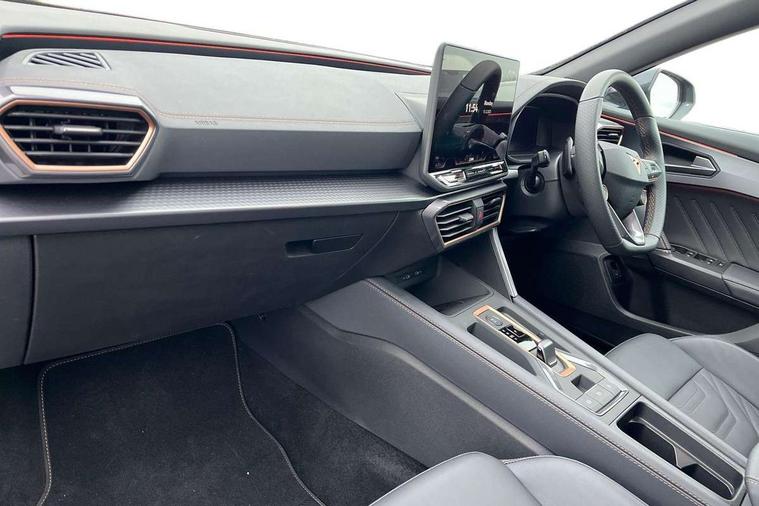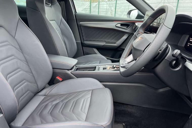 10.25" digital cockpit and configurable dashboard, Adaptive cruise control with follow-to-stop and speed limiter, Advanced driver alert system, Advanced lane assist with semi-automatic vehicle control in a medical emergency and traffic jam assist, Driving profile selection, Dynamic road sign display, Emergency steering support with turn assist, Forward collision warning with automatic braking, Full link phone integration, Intelligent park assist, Progressive steering, RPM, trip computer, outside temp gauge, instrument light brightness, low fuel warning light, lights on reminder, gearshift indicator, Service interval indicator, Side and exit assist, Start/stop system with regenerative braking, Top view camera, Virtual pedal and electric tailgate, Voice control system, Wired Android Auto, Wireless apple carplay, Wireless phone charger, CUPRA sport suspension, Electronic locking differential and dynamic traction support, 2 front and 2 rear USB type C sockets, Media system with navigation, 12.9" touchscreen display, voice control, DAB, steering wheel mounted controls, Auto dimming rear view mirror, Body colour door handles, Body coloured bumpers, Dark grey wing mirror, Daytime running light with automatic headlight control and coming home feature, Door panel ambient lighting, Dynamic headlight range control, Electric front/rear windows, Electrically adjustable heated and folding door mirrors with memory function, Gloss black roof rails and window surrounds, High beam assist, LED 3rd brake light, LED front fog lamps with cornering function, LED Headlights, LED Taillights with dynamic indicator, Rain sensing wipers, Rear diffuser with black simulated exhaust pipes, Rear fog lights, Rear side wing doors, Rear wash/wipe, Tinted rear windows, Welcome lights (within exterior mirror housing), 12V socket, 2 front and 2 rear reading lights, 3 seat bench in 2nd row, 60/40 split rear bench seat with armrest and mechanical seat release, Black headlining, Black interior roof lining, Cupra sports pedals, Dust/pollen filter, Electrically adjustable front seats with lumbar support and memory function, Front and rear head restraints, Front centre armrest, Heated front seats, Heated supersports multifunction leather steering wheel with satellite buttons and gear shift paddles, Height/reach adjust steering wheel, Illuminated aluminium doorsteps, Illuminated interior front door sills, Illuminated sunvisor with mirror, Isofix, Leather dashboard, door insert and side trim panel, LED smart wraparound lighting, PVC/Leather upholstery, Satellite steering wheel, Single front passenger seat, Storage pockets on rear of front seats, Three zone climate control with control panel in rear, Variable luggage/load compartment floor, 3 point seatbelts on all rear seats, ABS, Brake control system - ESC and brake booster, Child proof door locks, Driver and front passenger airbags with front passenger airbag de-activation, Electronic parking brake, Front and rear disc brakes, Front side curtain airbags, Hill hold control, Pre-crash front and rear seat belt tensioner, window closure and hazard lights, Public e-call, Seat belt reminder for front and rear seats, Tyre pressure monitoring system, Anti theft alarm system, KESSY Advanced - Keyless start, keyless entry with SAFELOCK, Locking wheel bolts, Copper and aluminium interior detailing,