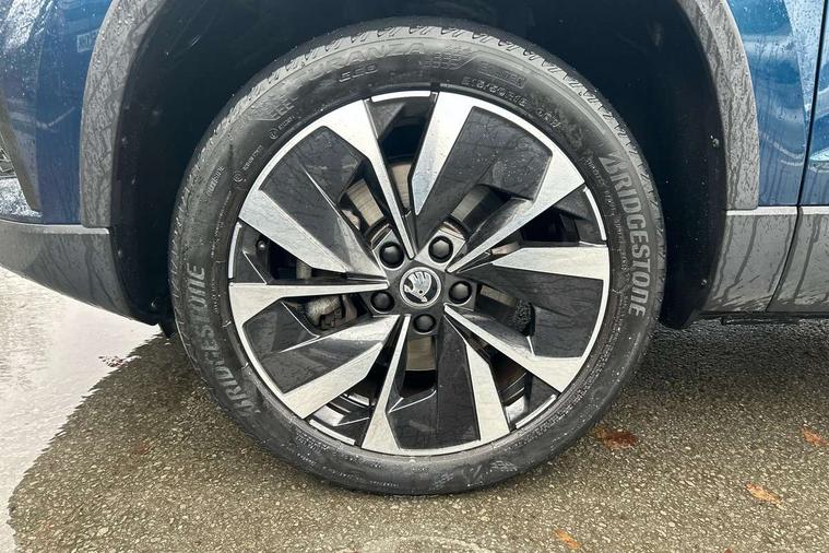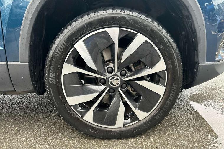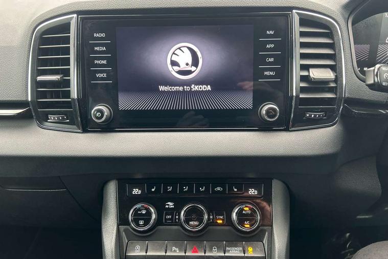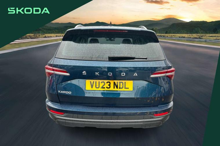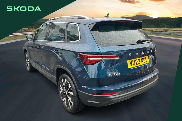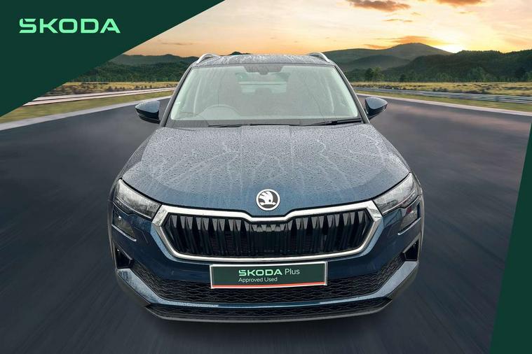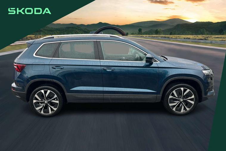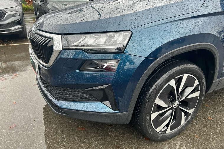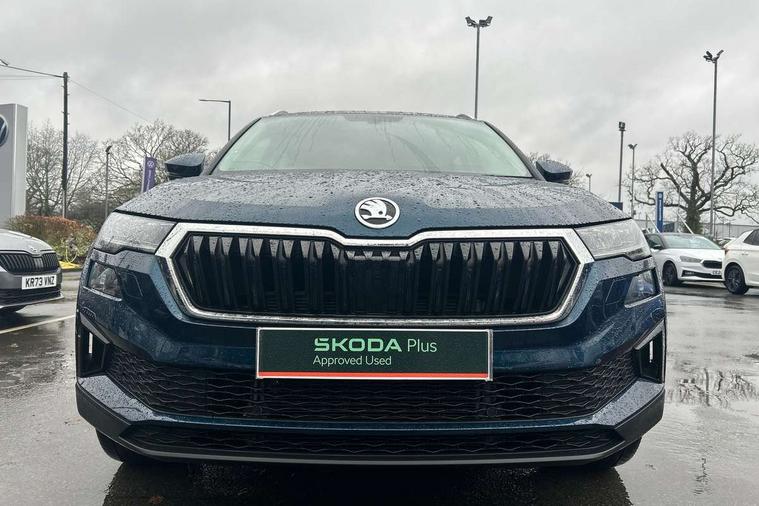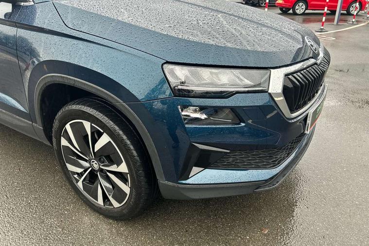 8" Digital display, Care connect, Driver fatigue sensor, Emergency services call system, Outside temperature gauge, Service interval indicator, SmartLink wireless for Apple and wired for Android, Start/stop system with regenerative braking, USB C Port x 2 in front centre console, 8 Speakers, DAB radio with Bluetooth, USB connection, Acoustic glass, Aero front windscreen wipers with intermittent function, Auto dimming rear view mirror with light and rain sensors, Black electric window control buttons, Body colour door mirrors and handles, Dynamic headlight range control with cornering light function, Electric front and rear windows with child proof lock, Heated rear windscreen, LED daytime running lights, LED rear lights with high functionality welcome effect and dynamic indicators, Light assistant (coming/leaving home/tunnel light), Plastic scuff plates, Privacy glass, Rear side wing doors, Rear spoiler, Rear window wiper with washer system and intermittent control, Safety reflectors on front doors, 1.5 litre bottle holders in driver and front passenger door panels, 12V socket in boot, 12v socket in front centre armrest with storage compartment and rear air vents, 2 Folding hooks and nets in boot, 2 spoke leather heated multifunction steering wheel with DSG paddles, 2 x Tablet holder, 3 rear height adjustable headrests, 3 seat bench in 2nd row, 4 foldable roof handles with rear coat hooks, Black floor carpet, Chrome inner door handles, Decorative door sills with KAROQ badging, Double sided boot floor, Foldable hooks in the boot, Front head restraints, Height adjustable front three point seats belts with tensioners, Height/reach adjust steering wheel, Ice scraper, Illuminated glovebox, Illuminated luggage compartment, Isofix child seat preparation for front passenger seat, Isofix child seat preparation outer rear, Manual lumbar support for front seats, Pen holder, Pollen filter, Rear boot cover, Rear reading lights, Rubbish bin door, Safety vest holder, Single front passenger seat, Storage box in upper central dashboard closed, Sunvisors with illuminated vanity mirrors, Textile floor mats, Ticket holder, VarioFlex seats with standard rear seat release, Chrome roof rails + chrome pack - Karoq, Parking pack - Karoq, Automatic door unlocking in case of crash, Automatic fuel cut off in case of crash, Child locks on rear doors, Driver airbag, Electronic parking brake with auto hold function, Emergency rear braking signal, ESC including ABS, MSR, ASR, EDS, HBA, DSR, RBS, MKB and traction control, Front side airbags, Hill hold control, Knee airbags, Passenger airbag with switch-off function, Pedestrian monitor, Seatbelt reminder signalisation and pretensioner for all seats, Three point seatbelts rear, Two tone horn, Tyre pressure display, Tyre pressure monitor, Alarm with interior monitoring, back up horn and tilt sensor with safe function, Electronic engine immobiliser, Keyless entry and start/stop, Remote central locking with 2 remote folding keys, Chrome framed air vents, 18" Procyon silver alloy wheels with anthracite aero inserts, Anti-theft wheel bolts protection, Storage on wheel cover, Tool kit,